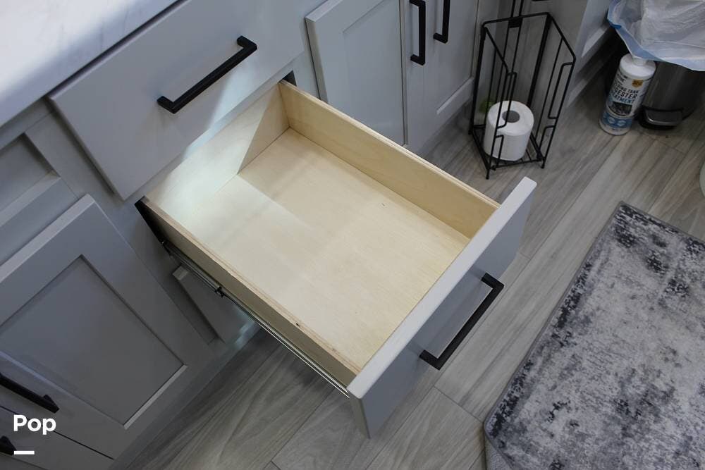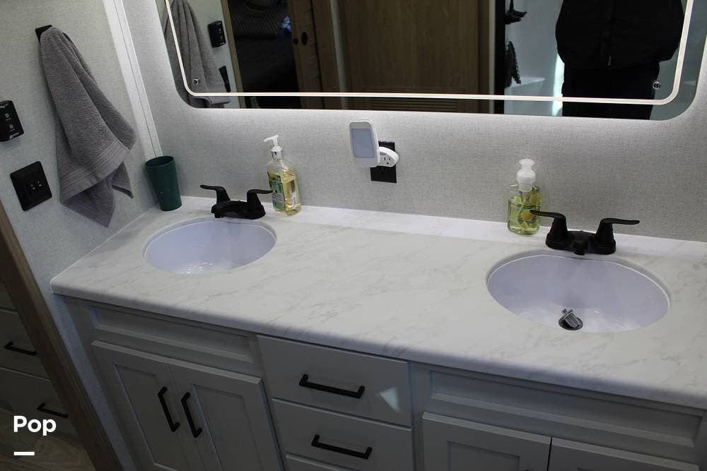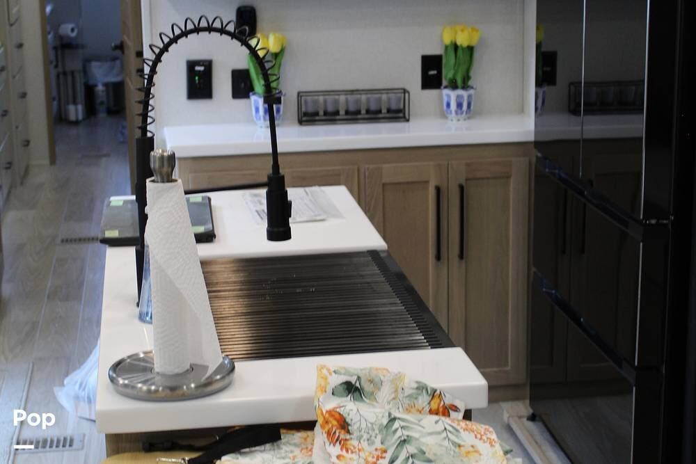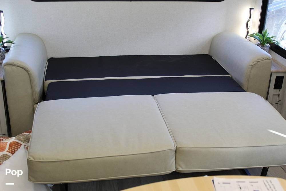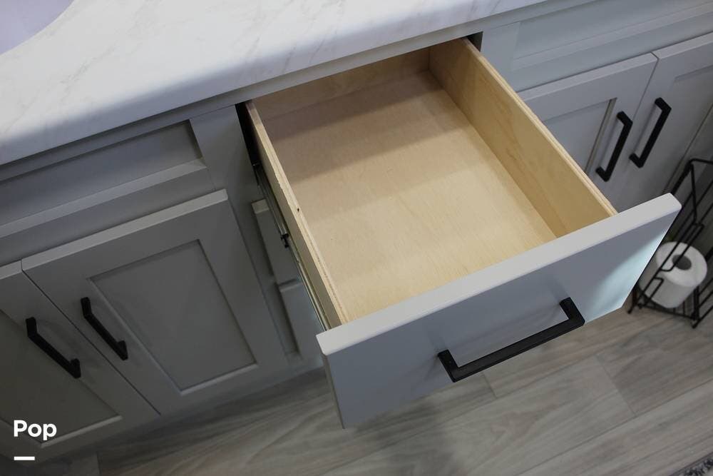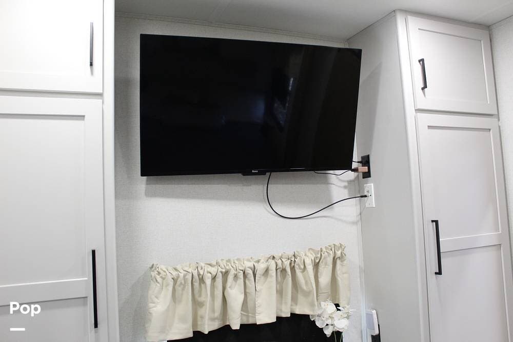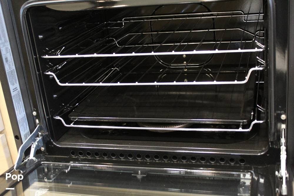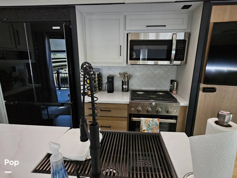 Upon entering its spacious entry, the over 300 sq ft of living area is quite impressive. The living area has a sleeper sofa, two electric recliners, and a large 50-inch TV with JBL surround sound.