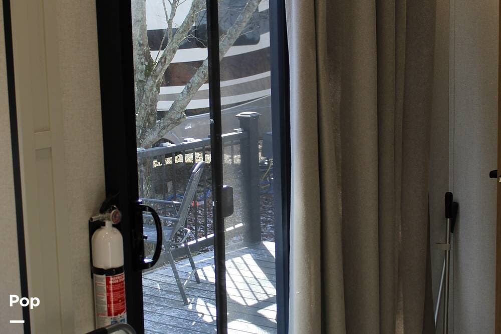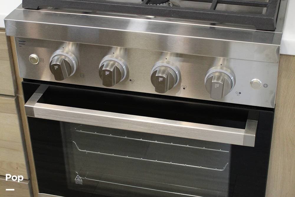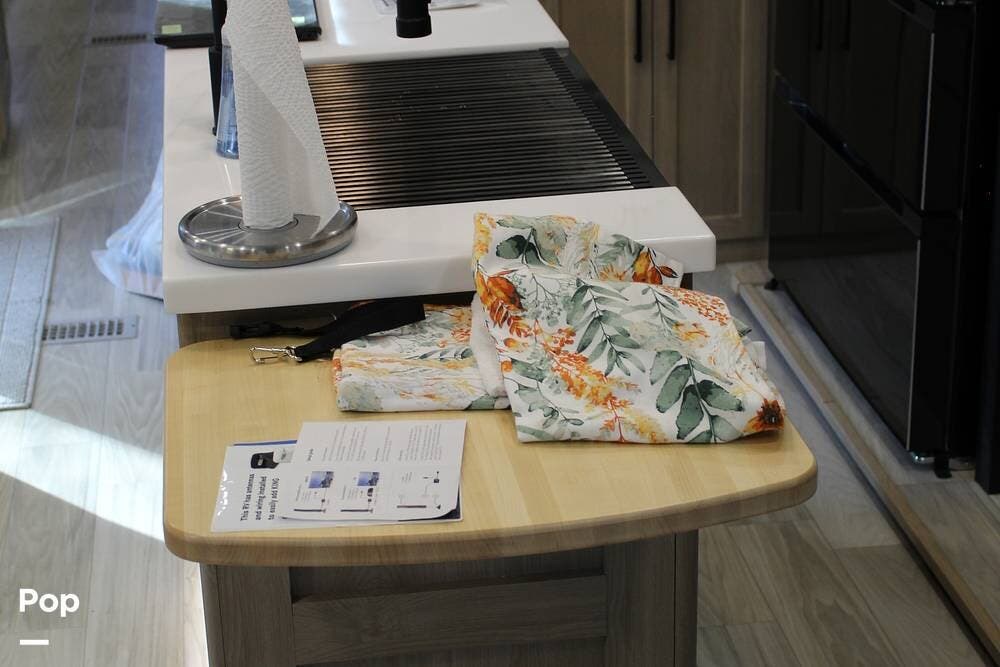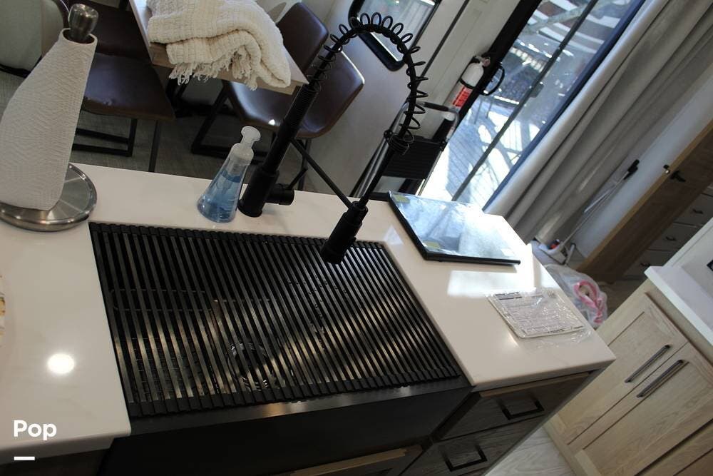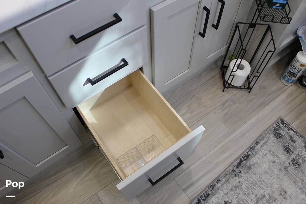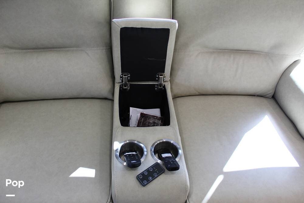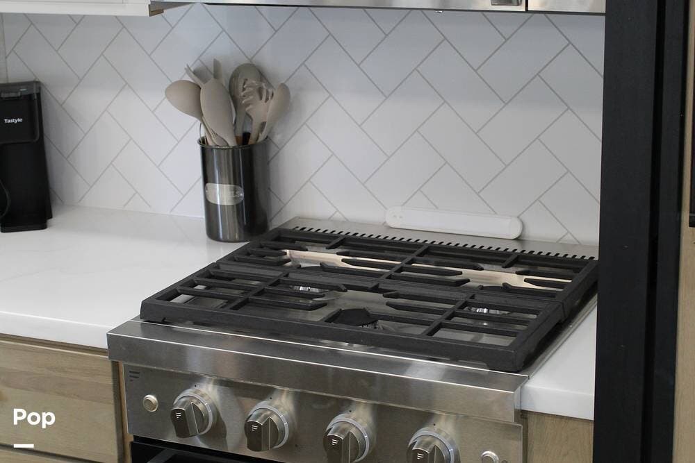 Upon entering its spacious entry, the over 300 sq ft of living area is quite impressive. The living area has a sleeper sofa, two electric recliners, and a large 50-inch TV with JBL surround sound.