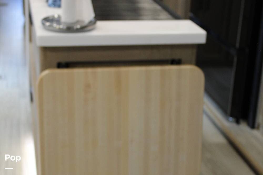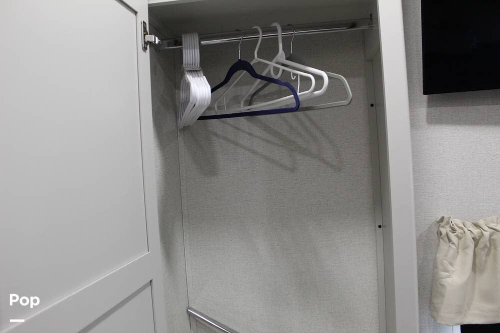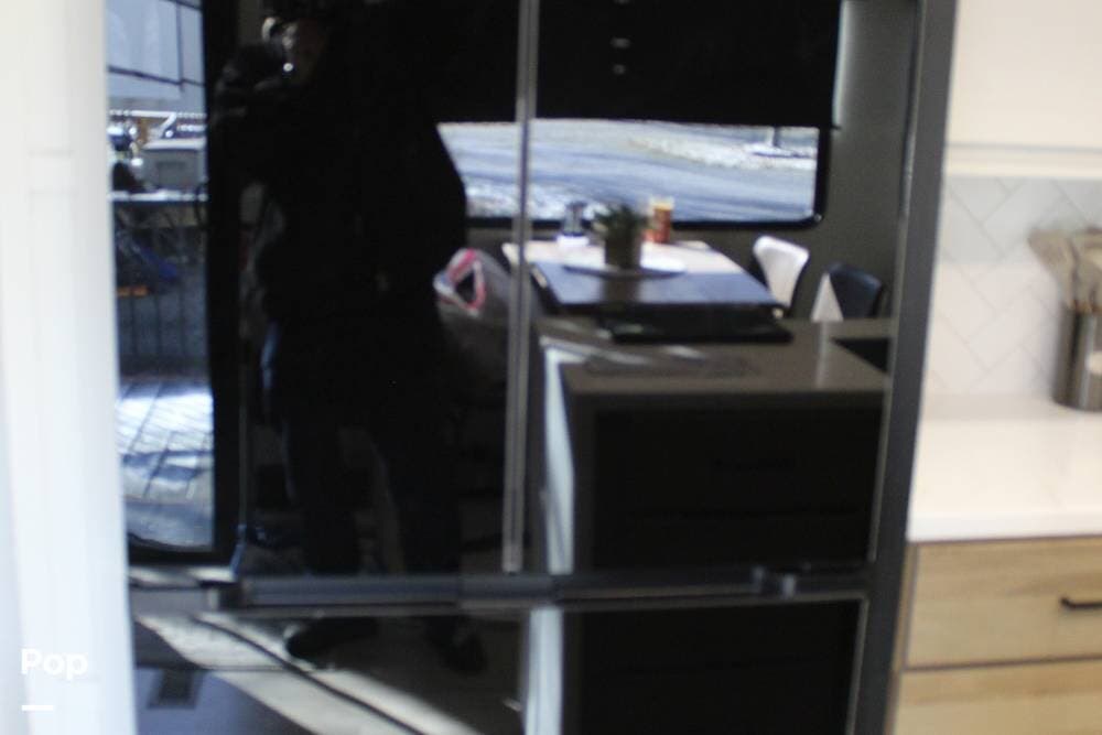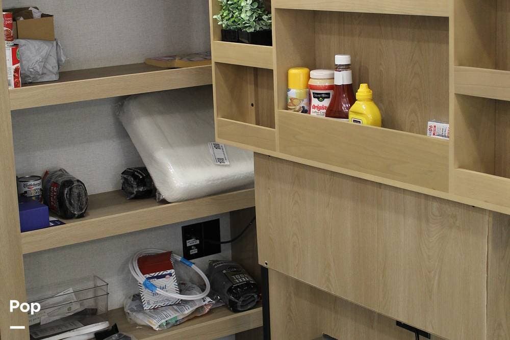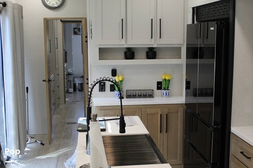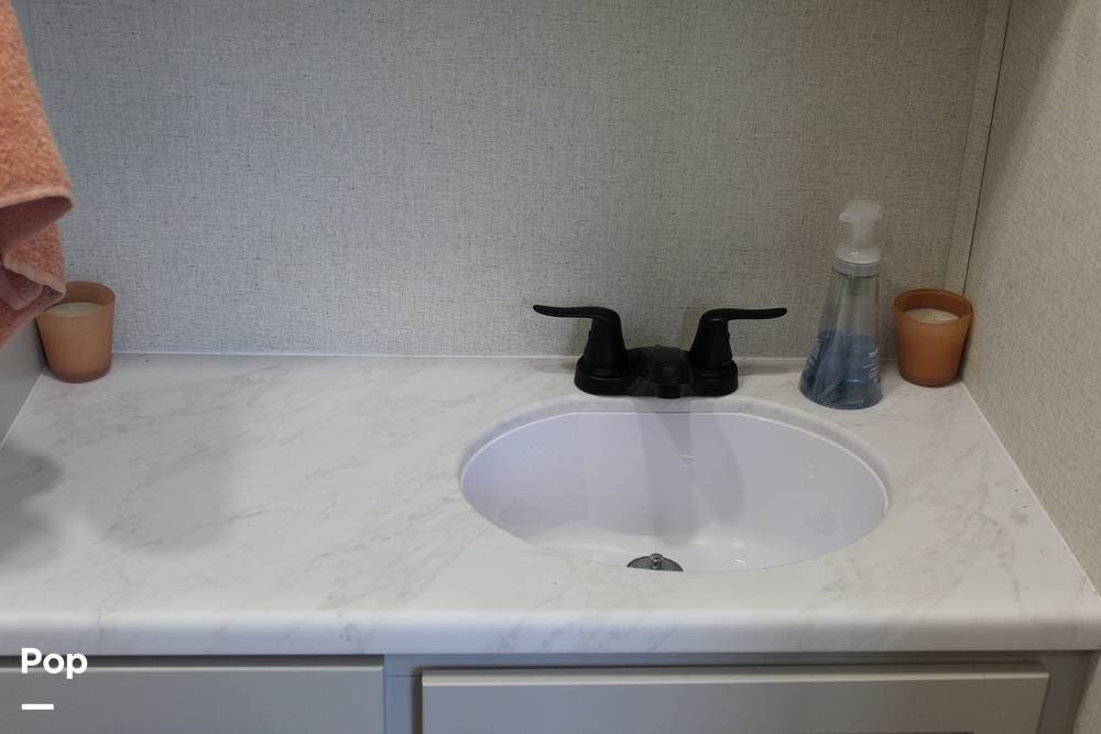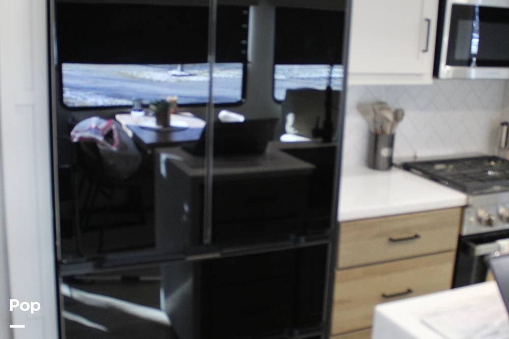 Upon entering its spacious entry, the over 300 sq ft of living area is quite impressive. The living area has a sleeper sofa, two electric recliners, and a large 50-inch TV with JBL surround sound.