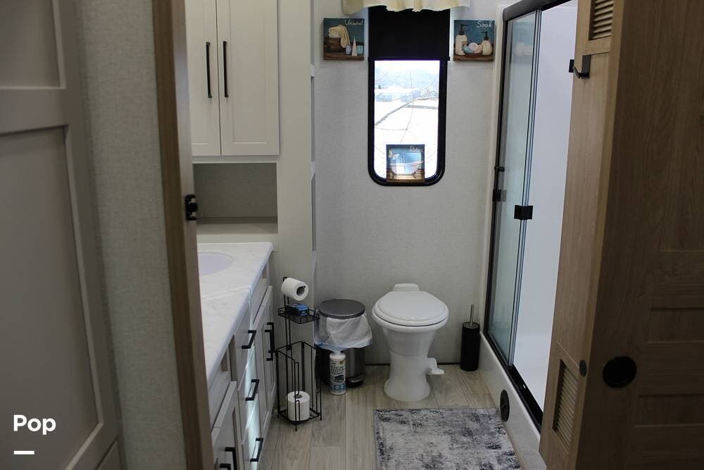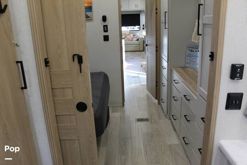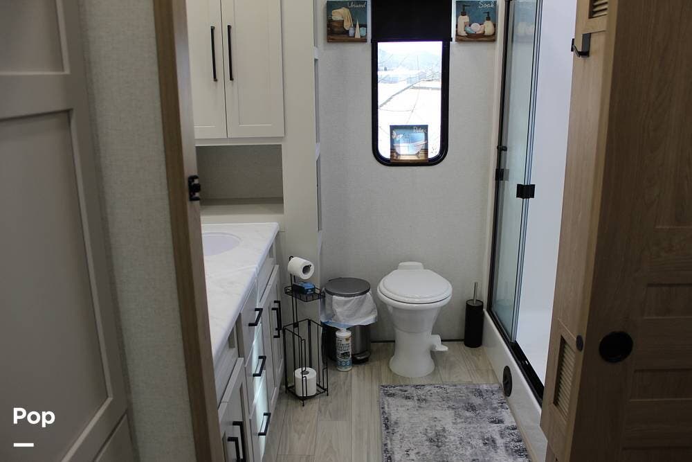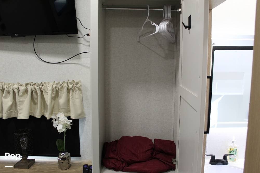 Walking to the bedroom, you will find a memory foam KING bed! Plenty of storage and a smaller TV and a bathroom features a large walk-in shower, a double vanity with a large mirror, and a porcelain commode, not a cheap plastic one... The camper also has a washer and dryer for your convenience.