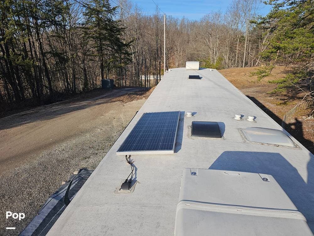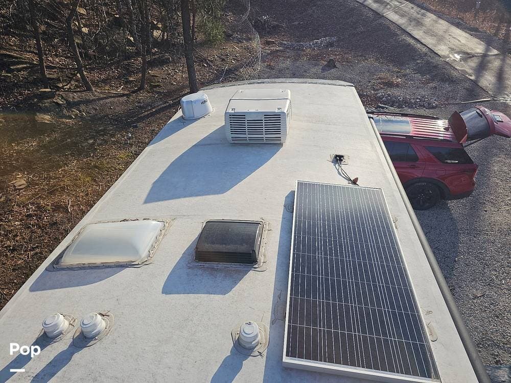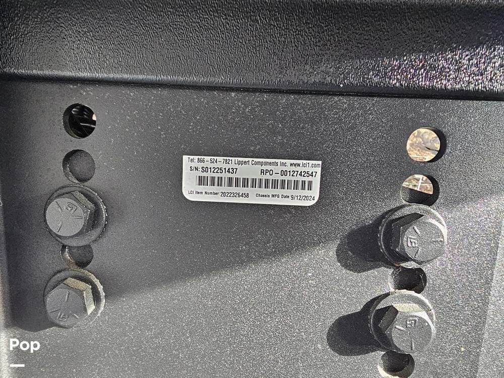 Other notable features include a 60,000 BTU on-demand tankless water heater, heated and enclosed holding tanks, electric auto leveling, tire pressure monitoring system, and a 200W solar system with controller and battery.