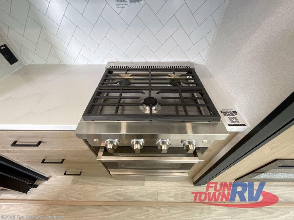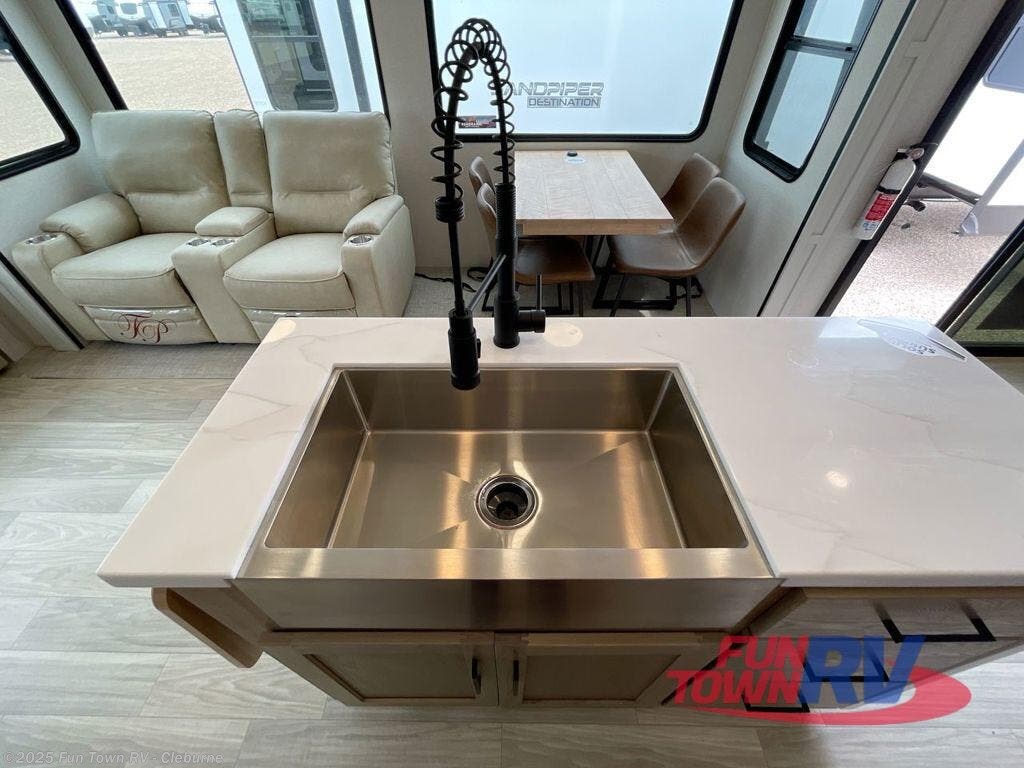 The Sandpiper Destination Trailers by Forest River are ready for extended stays at the location of your choice! The cambered powder coated frame with rust prohibitor will help extend the life of your RV and the Underbelly Armor will protect your trailer and provide better insulation. There are also color matched exterior fiberglass sidewalls outside, along with rain gutters with extra long drip spouts to prevent black streaking, and an exterior porch light just like at home. The Destination Package includes features to make your trips hassle-free, like the two 15,000 BTU A/C units, on-demand water heater, and Chef Collection three burner 24" range. A commercial style kitchen faucet and designer backsplash is included with the Extended Stay Package, as well as solid surface countertops, and a stainless steel apron sink with a strainer to name a few comforts. Available options include a central vacuum system, stabilizer jacks, plus dual pane windows and more!