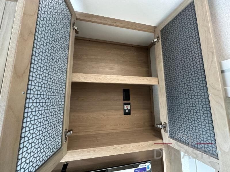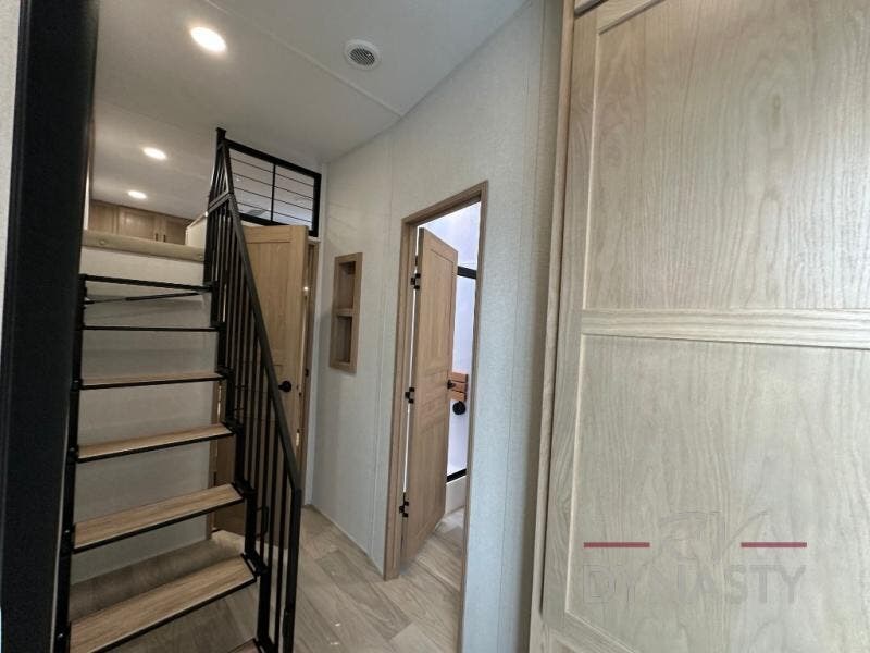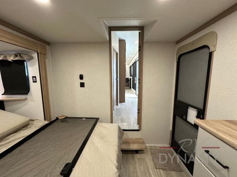 Comfort is found at every turn in this double slide out destination trailer. The chef of your group will love cooking in the front kitchen with ample counter space, a three burner cooktop and 30" over-the-range stainless microwave, plus a 19.6 cu. ft. 12V refrigerator and pantry for food storage. There is a free-standing dinette where you can dine together, and after dinner you can relax on the sectional sofa with an ottoman. There are stairs that lead to the loft area that includes two bunk bats, a wardrobe/cabinet, and two wardrobes/bookcases to keep this space tidy. And you'll enjoy your own space in the rear bedroom with its king bed slide out, large wardrobe and dresser, plus a closet with washer and dryer prep!