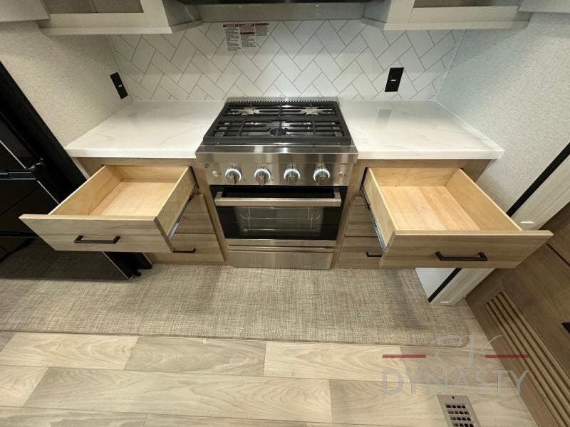 The Sandpiper Destination Trailers by Forest River are ready for extended stays at the location of your choice! The cambered powder coated frame with rust prohibitor will help extend the life of your RV and the Underbelly Armor will protect your trailer and provide better insulation. There are also color matched exterior fiberglass sidewalls outside, along with rain gutters with extra long drip spouts to prevent black streaking, and an exterior porch light just like at home. The Destination Package includes features to make your trips hassle-free, like the two 15,000 BTU A/C units, and on-demand water heater, and Chef Collection three burner 24" range. A commercial style kitchen faucet and designer backsplash is included with the Extended Stay Package, as well as solid surface countertops, and a stainless steel apron sink with a strainer to name a few comforts. Available options include a central vacuum system, stabilizer jacks, plus dual pane windows and more!