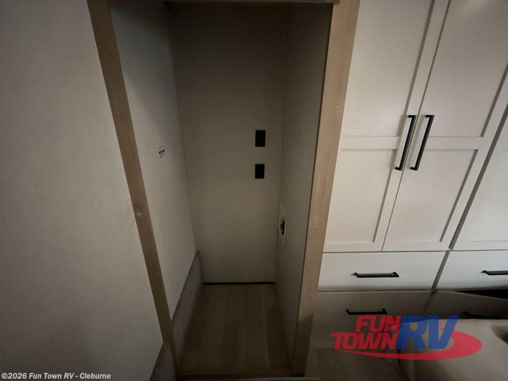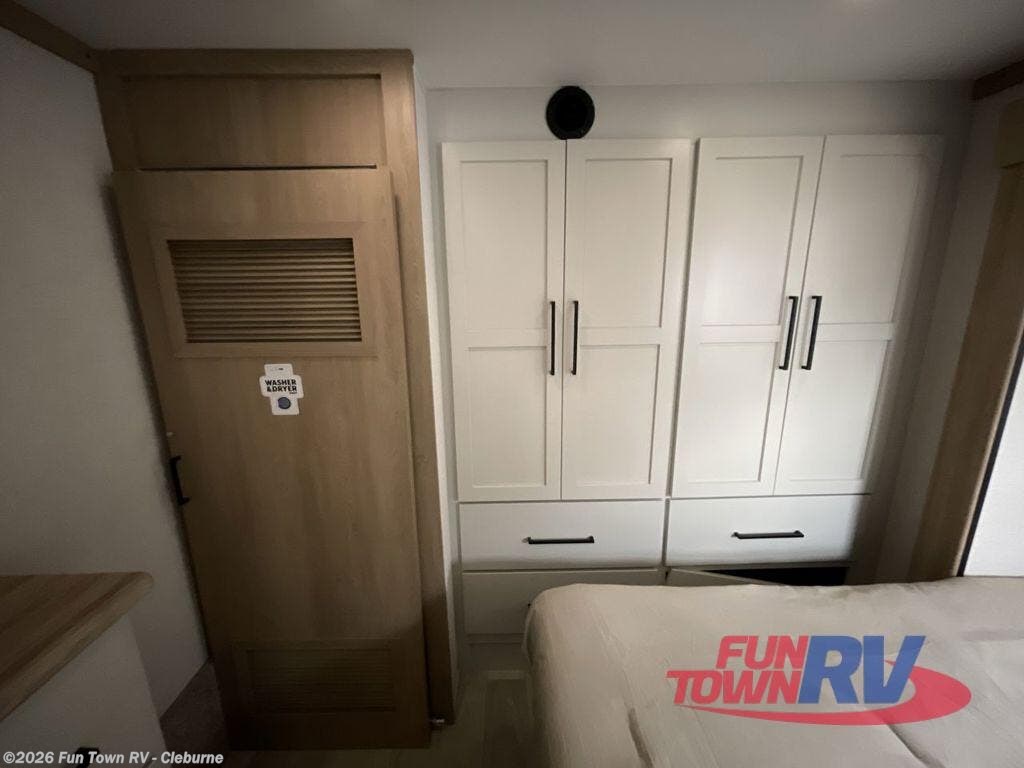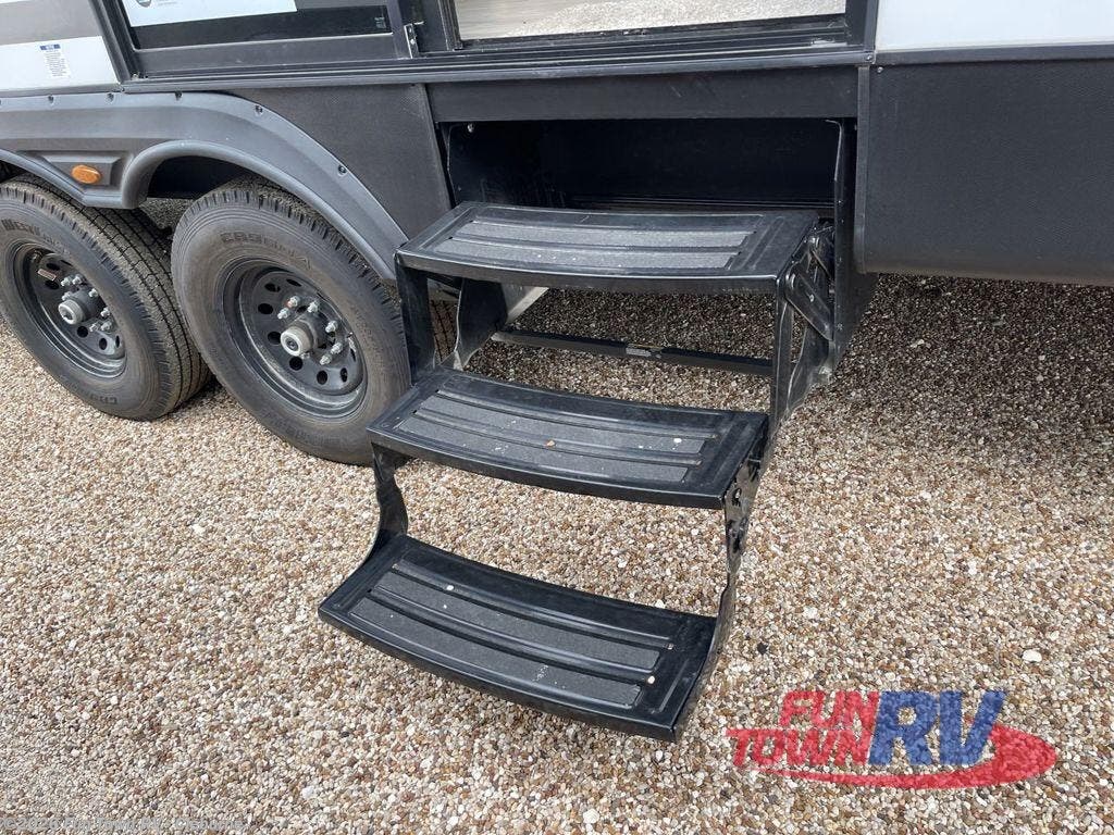 Comfort is found at every turn in this double slide out destination trailer. The chef of your group will love cooking in the front kitchen with ample counter space, a three burner cooktop and 30" over-the-range stainless microwave, plus a 19.6 cu. ft. 12V refrigerator and pantry for food storage. There is a free-standing dinette where you can dine together, and after dinner you can relax on the sectional sofa with an ottoman. There are stairs that lead to the loft area that includes two bunk bats, a wardrobe/cabinet, and two wardrobes/bookcases to keep this space tidy. And you'll enjoy your own space in the rear bedroom with its king bed slide out, large wardrobe and dresser, plus a closet with washer and dryer prep!