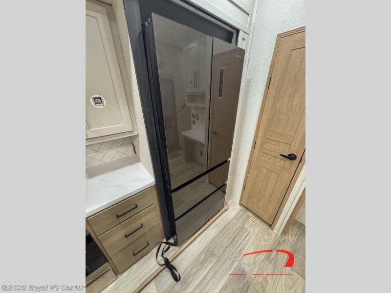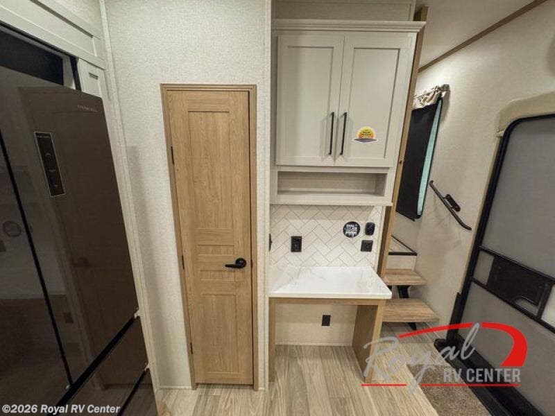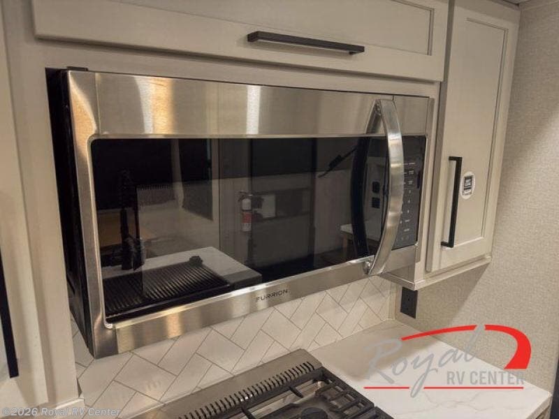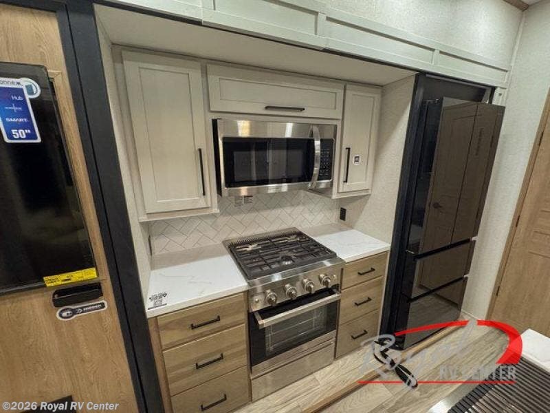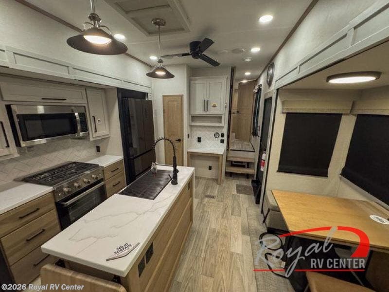 Enjoy a home on wheels with this fifth wheel! There are two bedrooms to choose from plus an upper loft with two 32" x 74" bunk mats, cabinets, and TV prep. The front private bedroom has a queen bed slide across from a dresser and a front wardrobe that is prepped to add an optional washer and dryer. The second bedroom has a queen bed slide across from a dresser with wardrobes on either side, plus it's very own full rear bathroom which has a 36" x 24" tub and a rear entry/exit door to the unit. The second full bathroom has a shower with a seat so everyone can get ready quickly in the morning. Prepare your best home cooked meals with the kitchen island and three burner cooktop then enjoy it at the free standing dinette. Relax in true comfort each night in the theater seating across from the fireplace and 50" TV at the entertainment center!