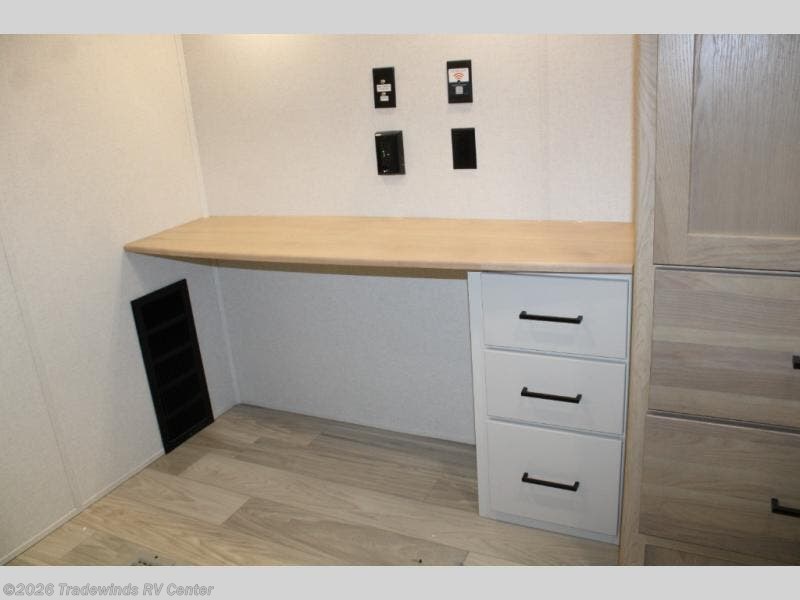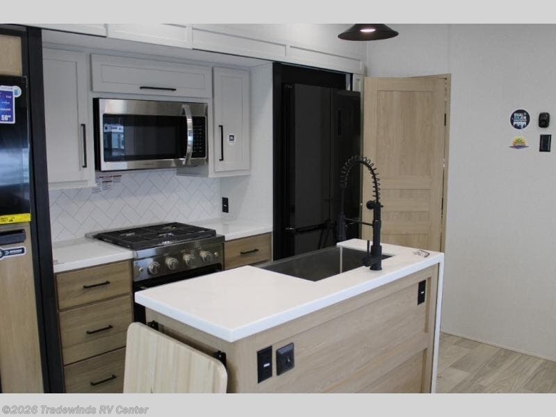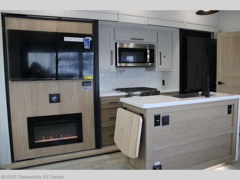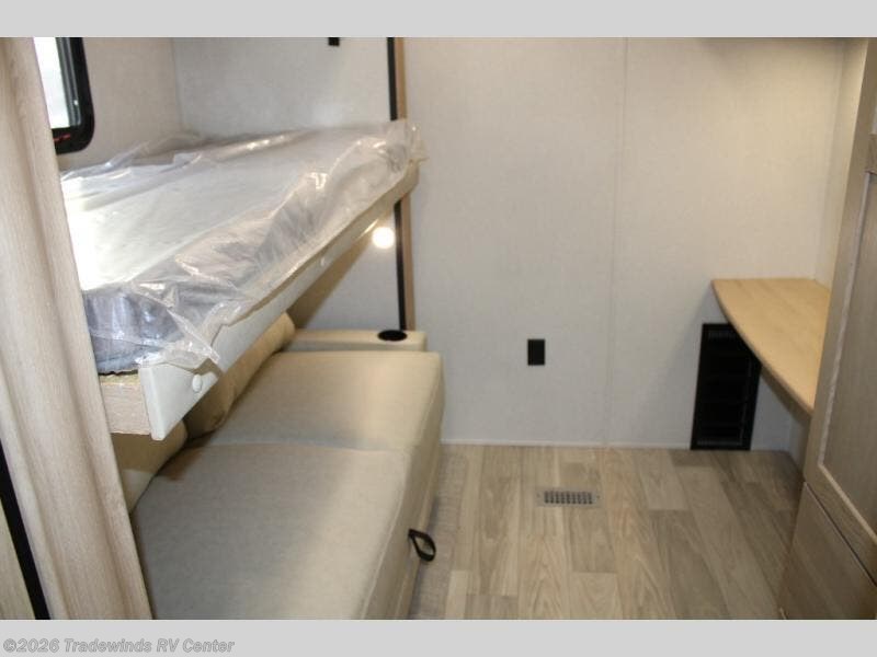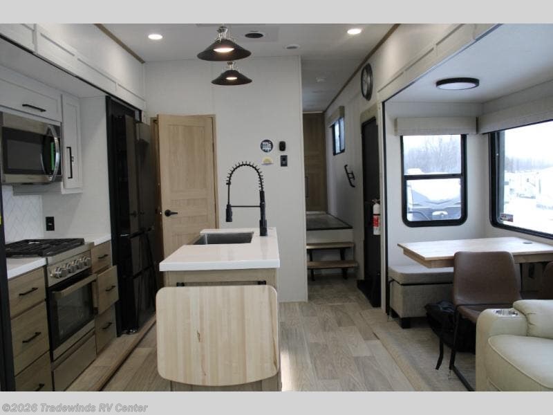 Have you been looking for a luxury fifth wheel with space for overnight guests or even an office? This model is the one! You will have your own private bedroom up front with a king bed slide out, a dresser with TV prep, plus a walk-in wardrobe with shelves and washer/dryer prep. If you have little ones or guests, they can take the middle bunkroom with a hide-a-bed sofa and bunk bed above, and the desk in this room will allow you to make it into an office if you need. There is even a loft bunk above this room with a ladder for more sleeping or storage space! The main living area includes theater seating across from the entertainment center with a hidden pantry, and a second hide-a-bed sofa in this space can also be converted to sleeping space for tag-along campers. The chef will love the kitchen island for more counter space, a 12V refrigerator, plus an outside kitchen to enjoy the nice weather while they make dinner.