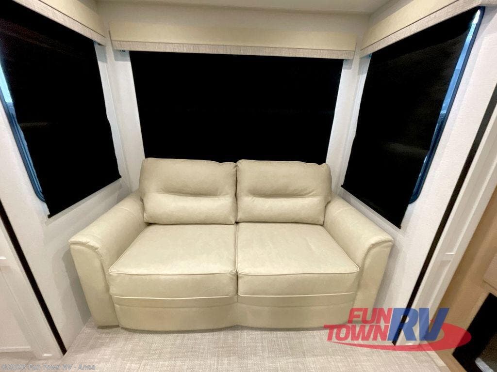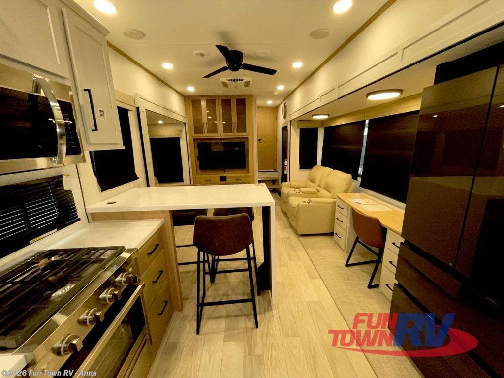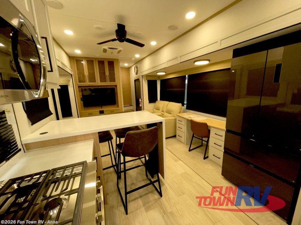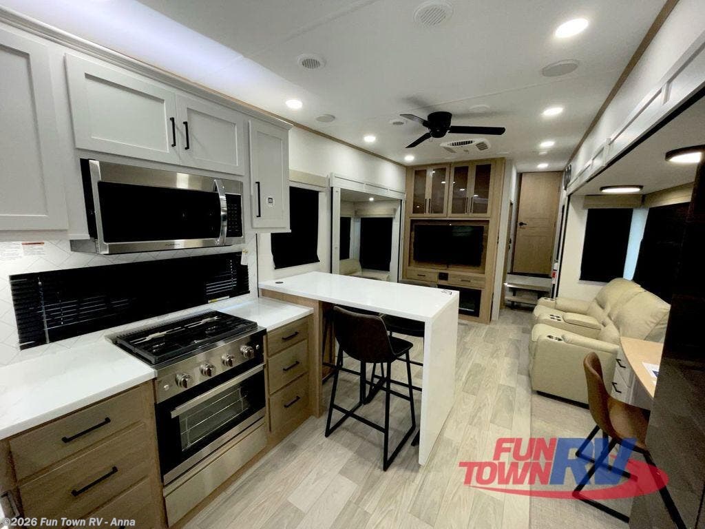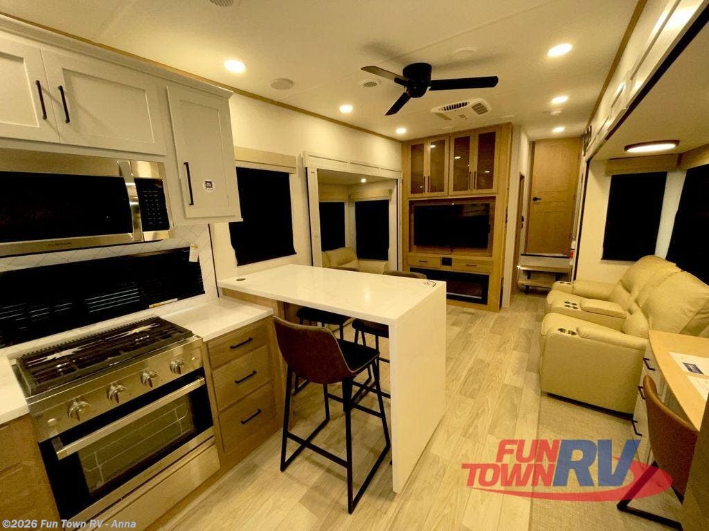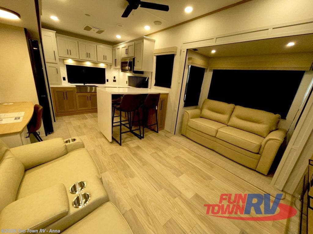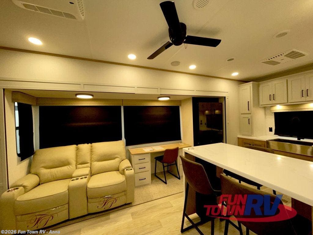 Have you been looking for a luxury fifth wheel with space for overnight guests or even an office? This model is the one! You will have your own private bedroom up front with a king bed slide out, a dresser with TV prep, plus a walk-in wardrobe with shelves and washer/dryer prep. If you have little ones or guests, they can take the middle bunkroom with a hide-a-bed sofa and bunk bed above, and the desk in this room will allow you to make it into an office if you need. There is even a loft bunk above this room with a ladder for more sleeping or storage space! The main living area includes theater seating across from the entertainment center with a hidden pantry, and a second hide-a-bed sofa in this space can also be converted to sleeping space for tag-along campers. The chef will love the kitchen island for more counter space, a 12V refrigerator, plus an outside kitchen to enjoy the nice weather while they make dinner.