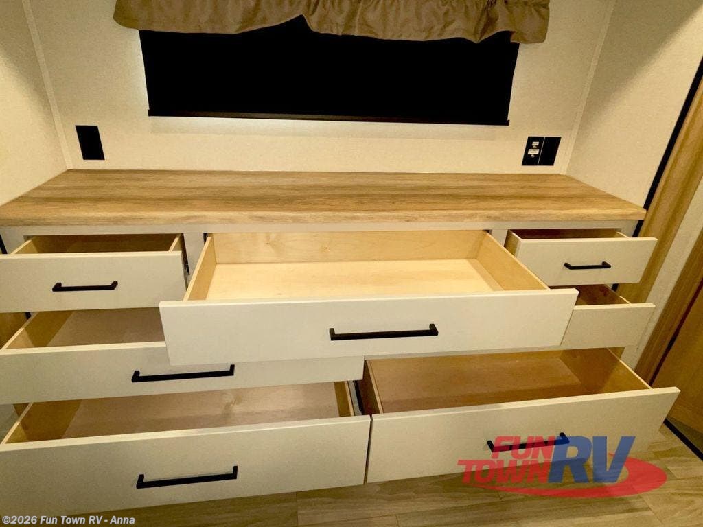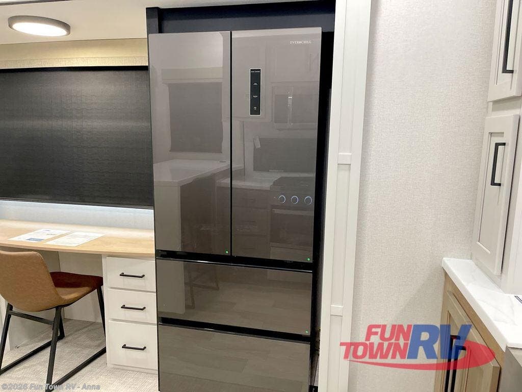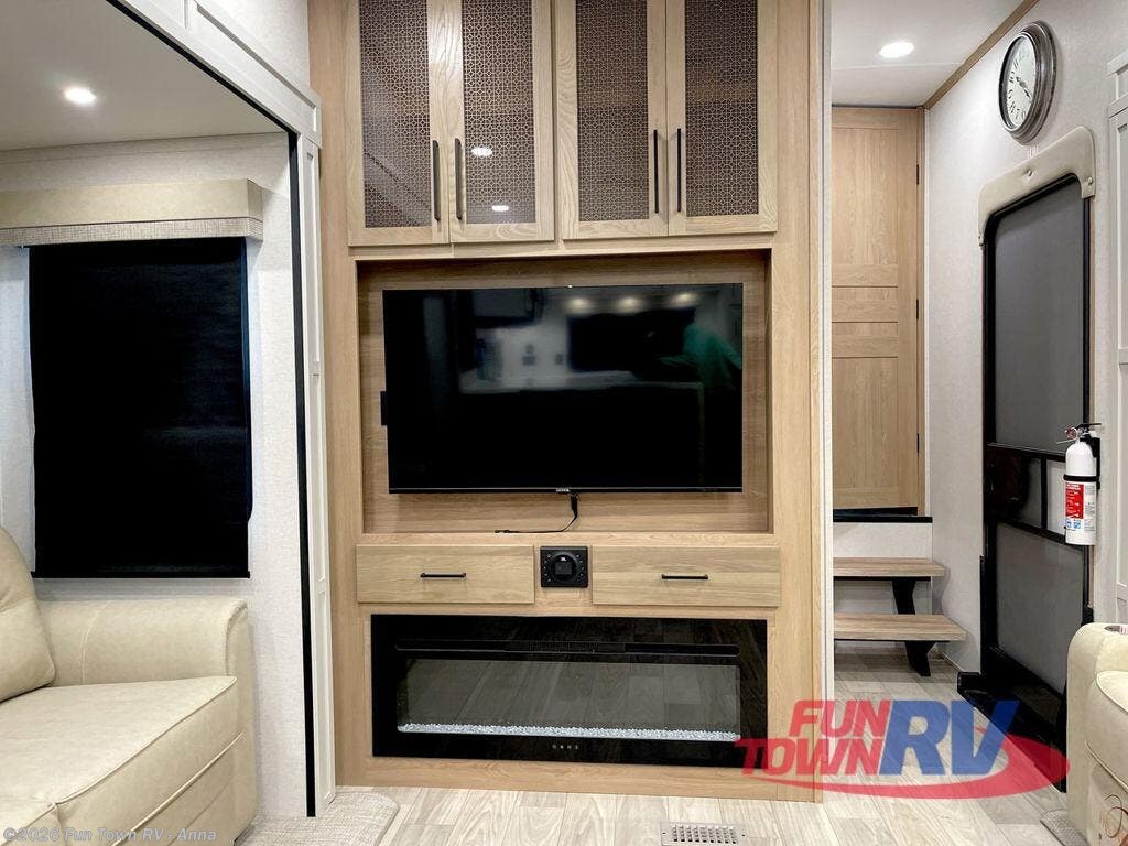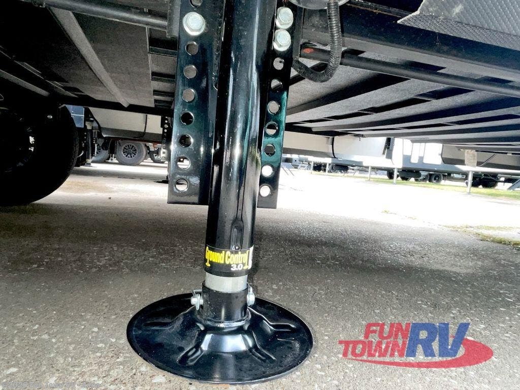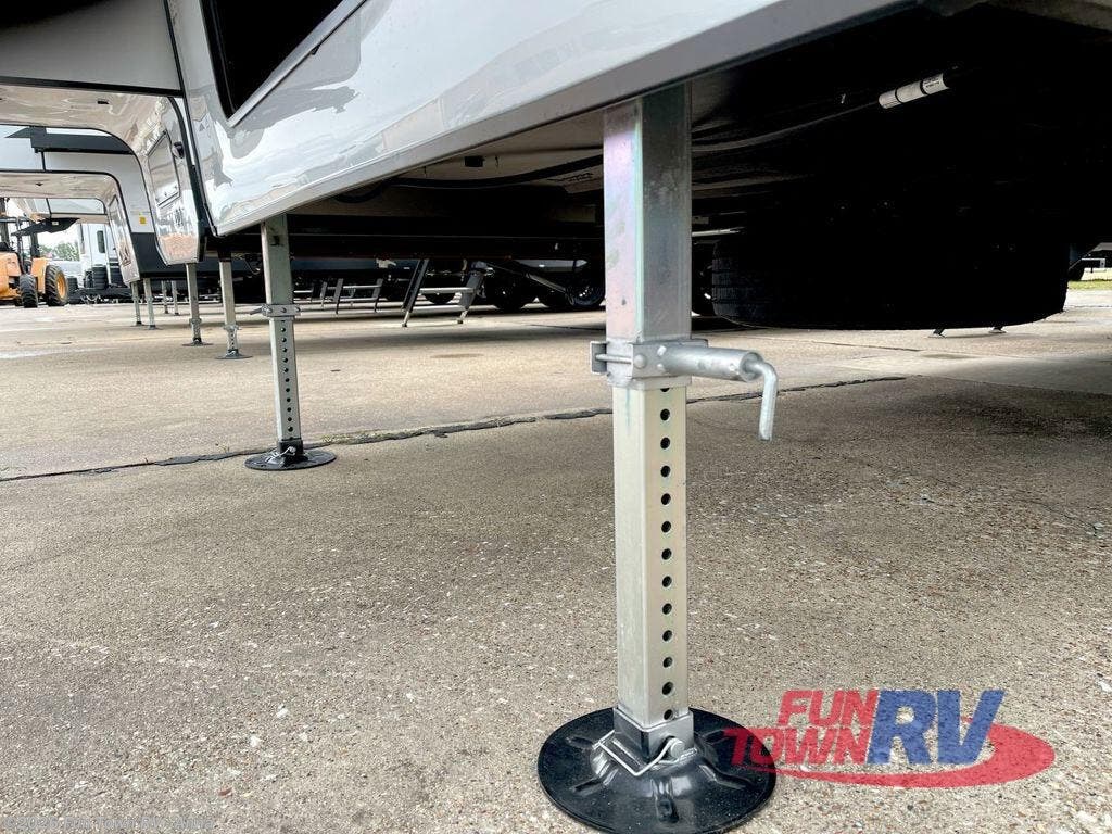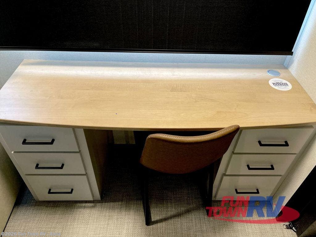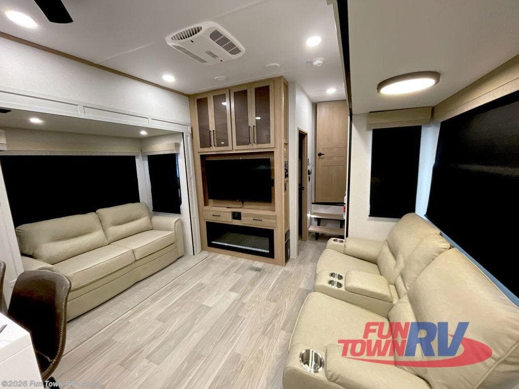 Have you been looking for a luxury fifth wheel with space for overnight guests or even an office? This model is the one! You will have your own private bedroom up front with a king bed slide out, a dresser with TV prep, plus a walk-in wardrobe with shelves and washer/dryer prep. If you have little ones or guests, they can take the middle bunkroom with a hide-a-bed sofa and bunk bed above, and the desk in this room will allow you to make it into an office if you need. There is even a loft bunk above this room with a ladder for more sleeping or storage space! The main living area includes theater seating across from the entertainment center with a hidden pantry, and a second hide-a-bed sofa in this space can also be converted to sleeping space for tag-along campers. The chef will love the kitchen island for more counter space, a 12V refrigerator, plus an outside kitchen to enjoy the nice weather while they make dinner.