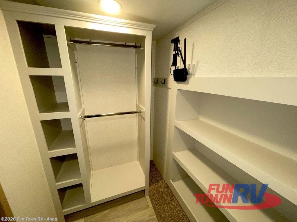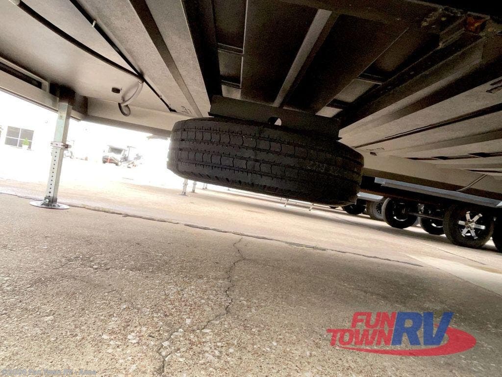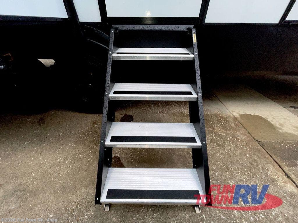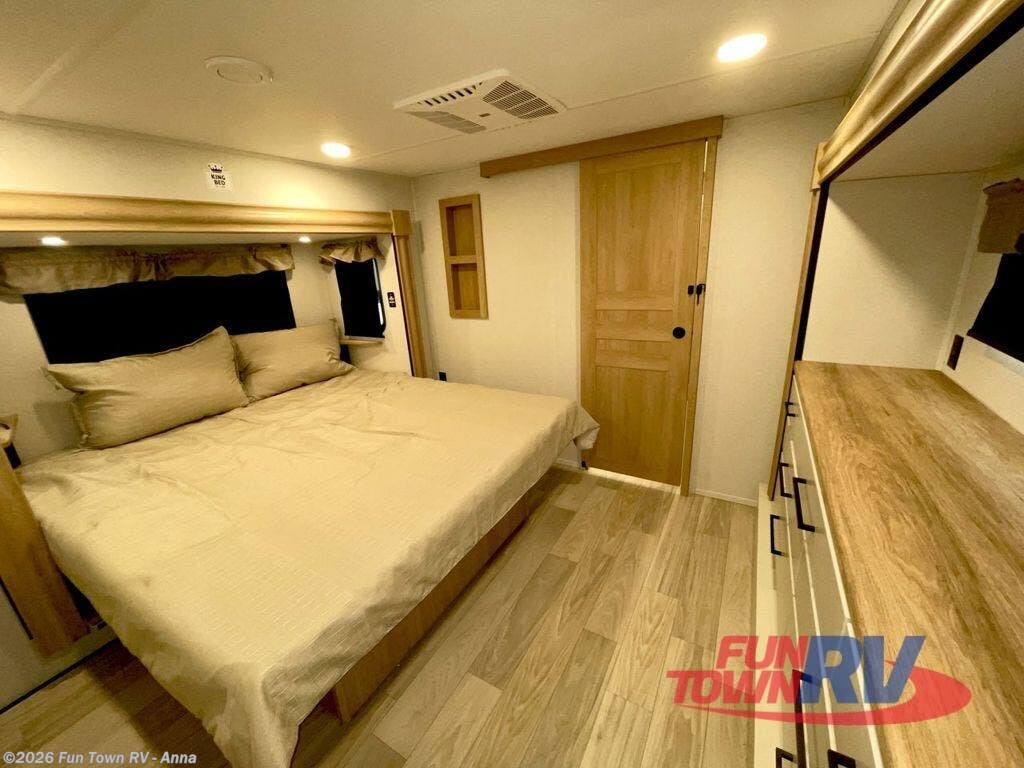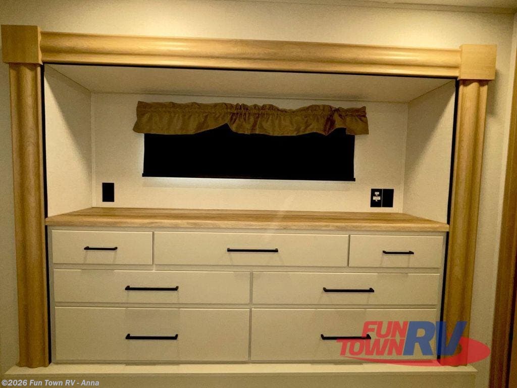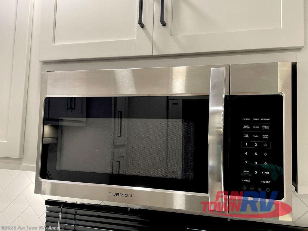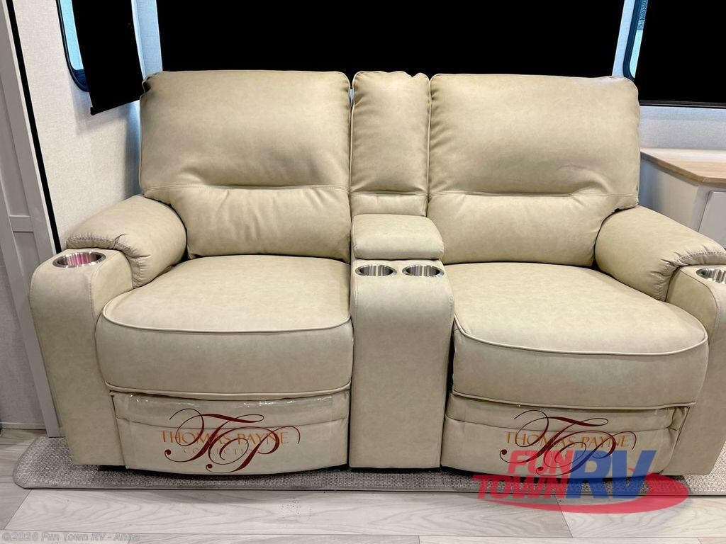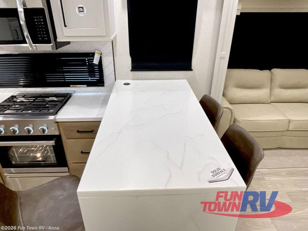 Have you been looking for a luxury fifth wheel with space for overnight guests or even an office? This model is the one! You will have your own private bedroom up front with a king bed slide out, a dresser with TV prep, plus a walk-in wardrobe with shelves and washer/dryer prep. If you have little ones or guests, they can take the middle bunkroom with a hide-a-bed sofa and bunk bed above, and the desk in this room will allow you to make it into an office if you need. There is even a loft bunk above this room with a ladder for more sleeping or storage space! The main living area includes theater seating across from the entertainment center with a hidden pantry, and a second hide-a-bed sofa in this space can also be converted to sleeping space for tag-along campers. The chef will love the kitchen island for more counter space, a 12V refrigerator, plus an outside kitchen to enjoy the nice weather while they make dinner.