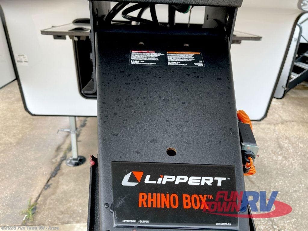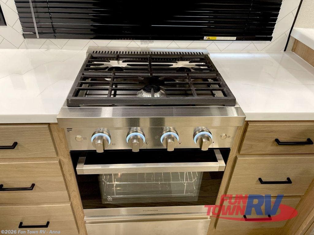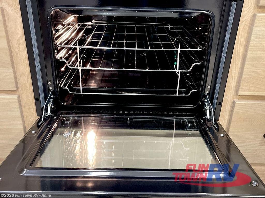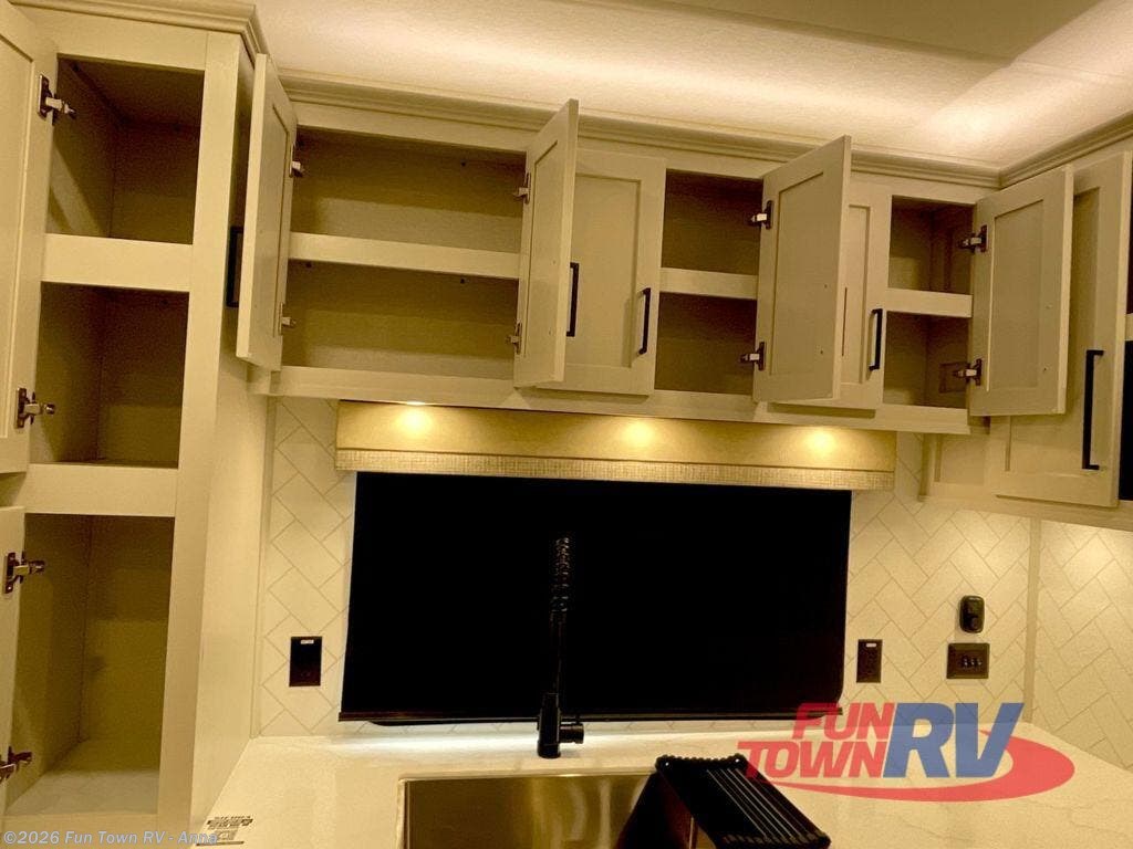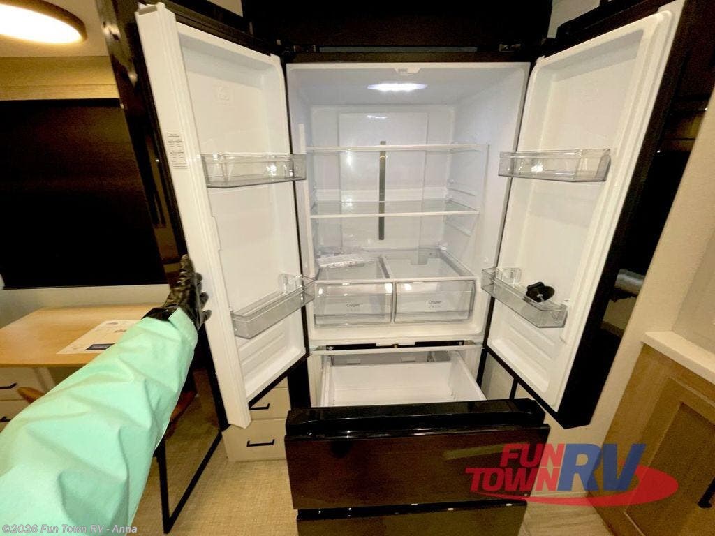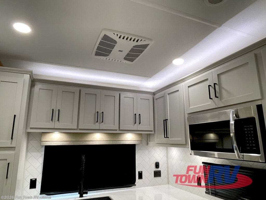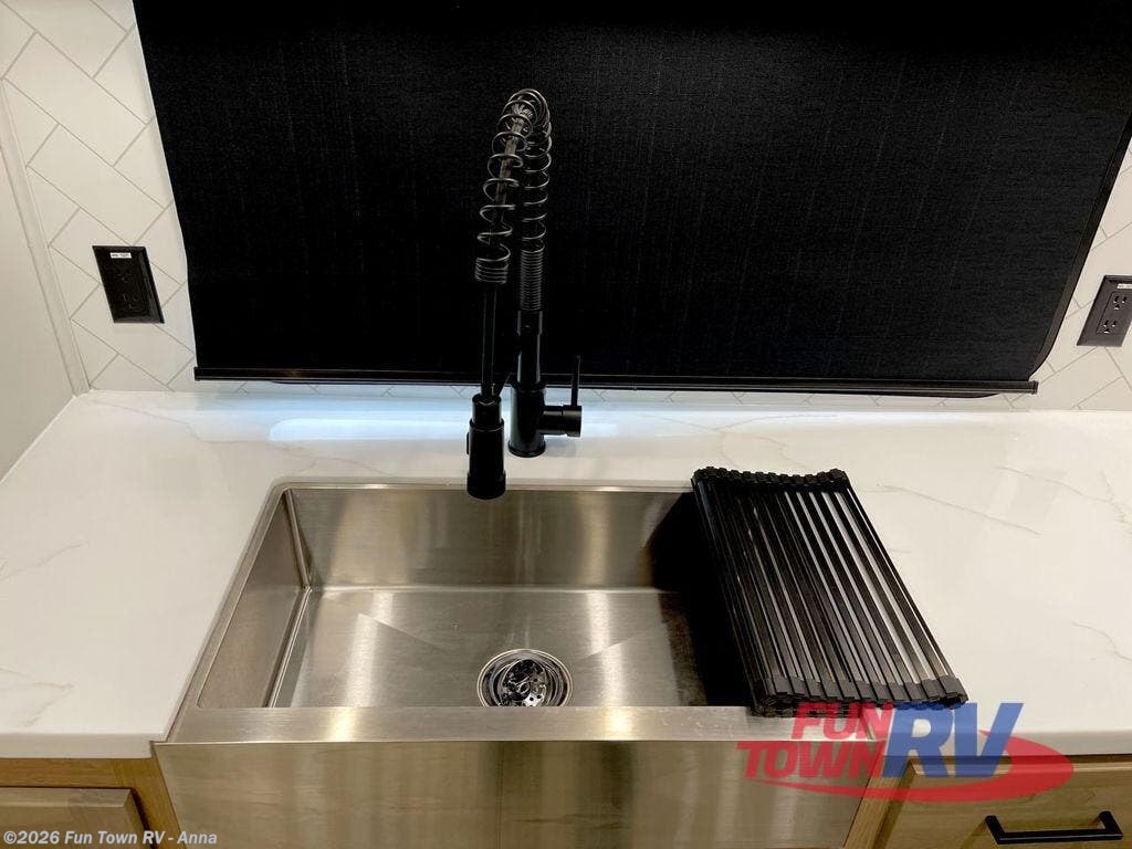 Have you been looking for a luxury fifth wheel with space for overnight guests or even an office? This model is the one! You will have your own private bedroom up front with a king bed slide out, a dresser with TV prep, plus a walk-in wardrobe with shelves and washer/dryer prep. If you have little ones or guests, they can take the middle bunkroom with a hide-a-bed sofa and bunk bed above, and the desk in this room will allow you to make it into an office if you need. There is even a loft bunk above this room with a ladder for more sleeping or storage space! The main living area includes theater seating across from the entertainment center with a hidden pantry, and a second hide-a-bed sofa in this space can also be converted to sleeping space for tag-along campers. The chef will love the kitchen island for more counter space, a 12V refrigerator, plus an outside kitchen to enjoy the nice weather while they make dinner.