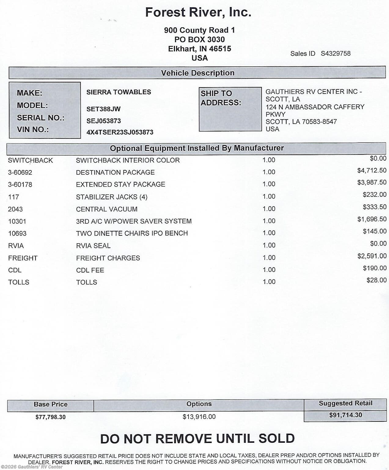 This 2025 Forest River Sierra Destination 388JW is outfitted with all the features you need for happy camping. By owning this 2025 Forest River Sierra Destination 388JW, you’re joining the Forest River family! The sleep capacity allows you to bring up to 4 along on your travels in this rig. With three slides, this rig feels roomy and spacious inside. Cook up the best camping meals with appliances like the fridge, oven, stove. Kick back and relax in the living area with the theater seating and , or TV. You’ll wake up feeling well-rested for your adventures in your king size bed. Keep a comfortable temperature inside your rig with the heating option. While the inside of this rig is enough on its own, the outside also features enclosed underbelly, fiberglass sidewalls, power awning, second roof a/c, stabilizer jacks and tinted windows.