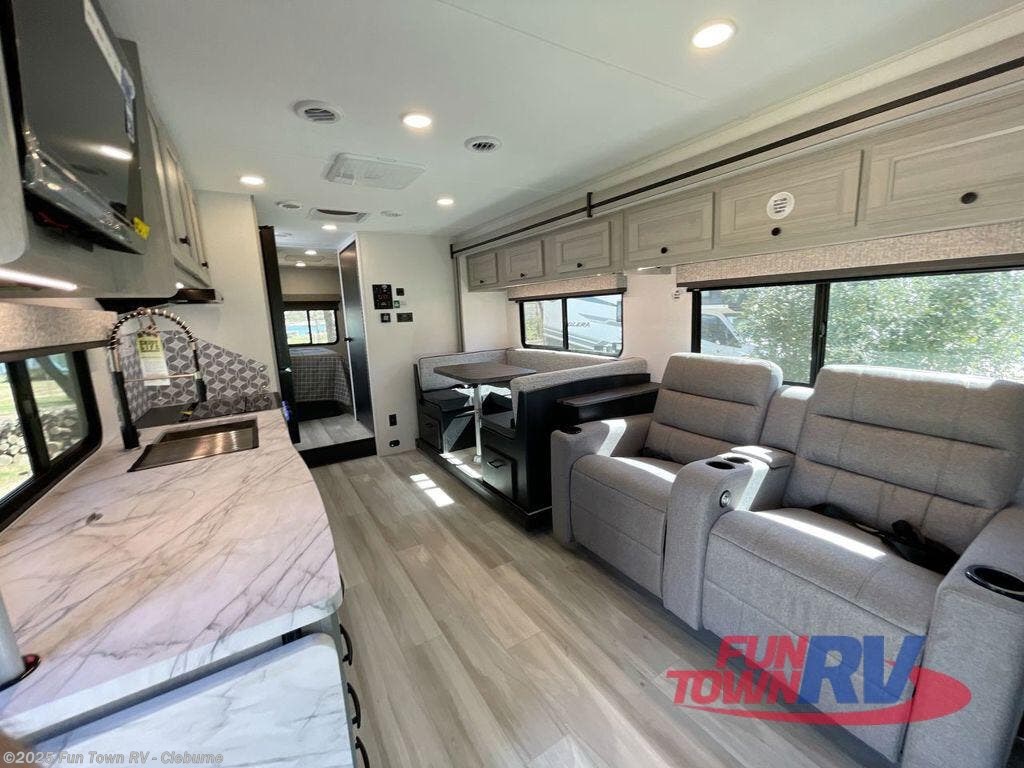 Pack your bags and pick your favorite destination then head out in this motorhome! The rear private bedroom has a 60" x 74" queen bed slide for more interior space, and a linen closet with wardrobes on either side of it. There is also a split-style bath with a private toilet and sink, and the shower is right across the hall. Prepare your best home cooked meals using the three burner cooktop, enjoy dining at the U-shaped dinette, and store any leftovers in the 10.7 cu. ft. 12V refrigerator. You will also appreciate a bit of flip-up countertop for more meal prepping space. Relax each evening on the 66" sofa, or you can replace it for the optional power theater seating. There is even a 60" x 80" bunk over the cab for extra sleeping or storage space!