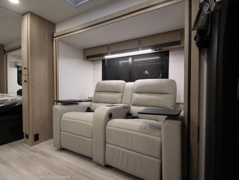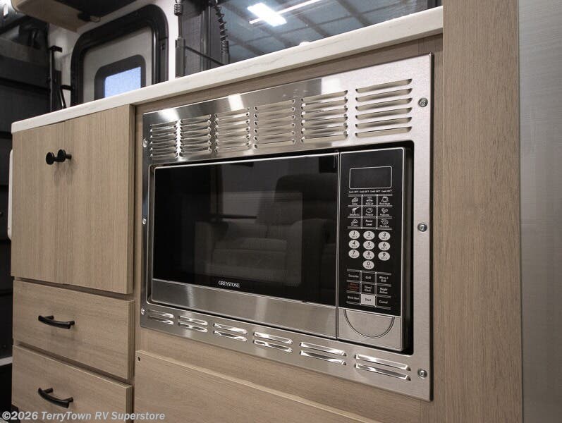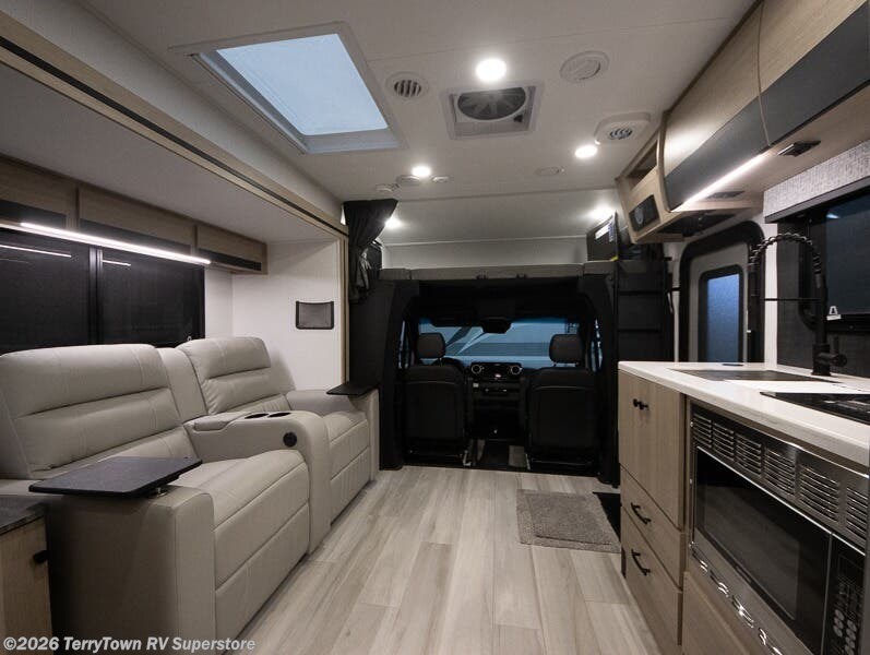 Everything you need is found in this cozy motorhome for five to six people. The swivel captain's seats can become a part of the living area once you park, and your guests can gather around the slide out U-shaped dinette which can also double as sleeping space when needed. Your meals can be prepared each day on the induction stove top, or in the 1.3 cu. ft. stainless steel convection microwave. The flip-up galley counter will provide additional counter space, and your perishables can be stored in the 10.7 cu. ft. 12V refrigerator. The semi-private bedroom features a slide out queen bed, a 12V TV, plus a wardrobe. You can also choose to add an optional 12V exterior TV if you enjoy watching the big game outdoors!
