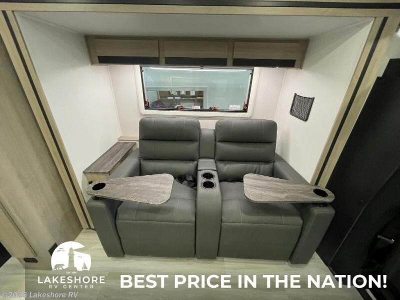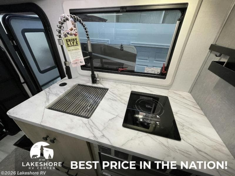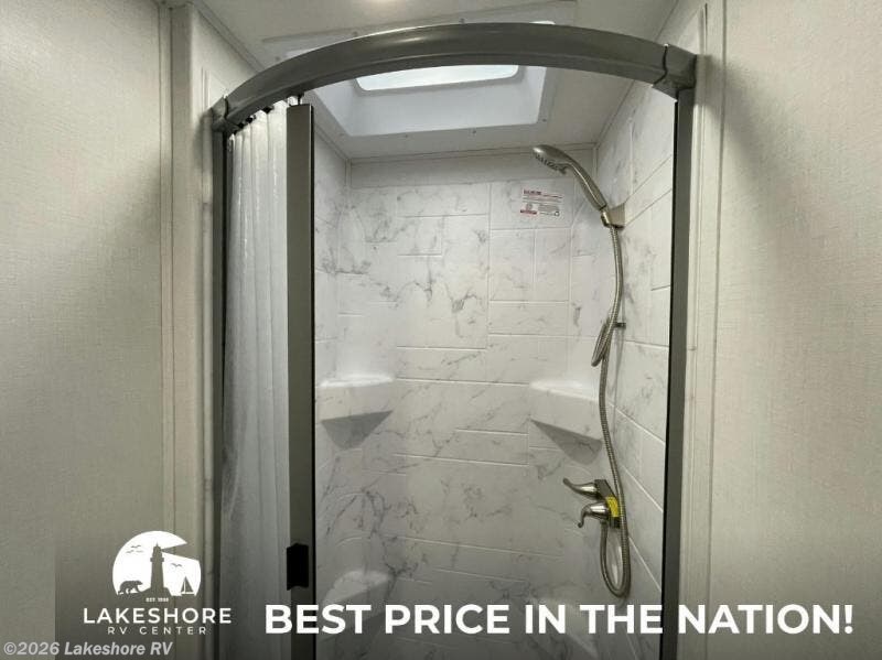 The full-wall slide-out transforms the interior, creating a spacious and comfortable living area. The U-shaped dinette offers ample seating for meals and converts into additional sleeping space. The queen memory foam bed provides a restful night’s sleep, while the rear corner bathroom includes a shower for privacy and convenience.