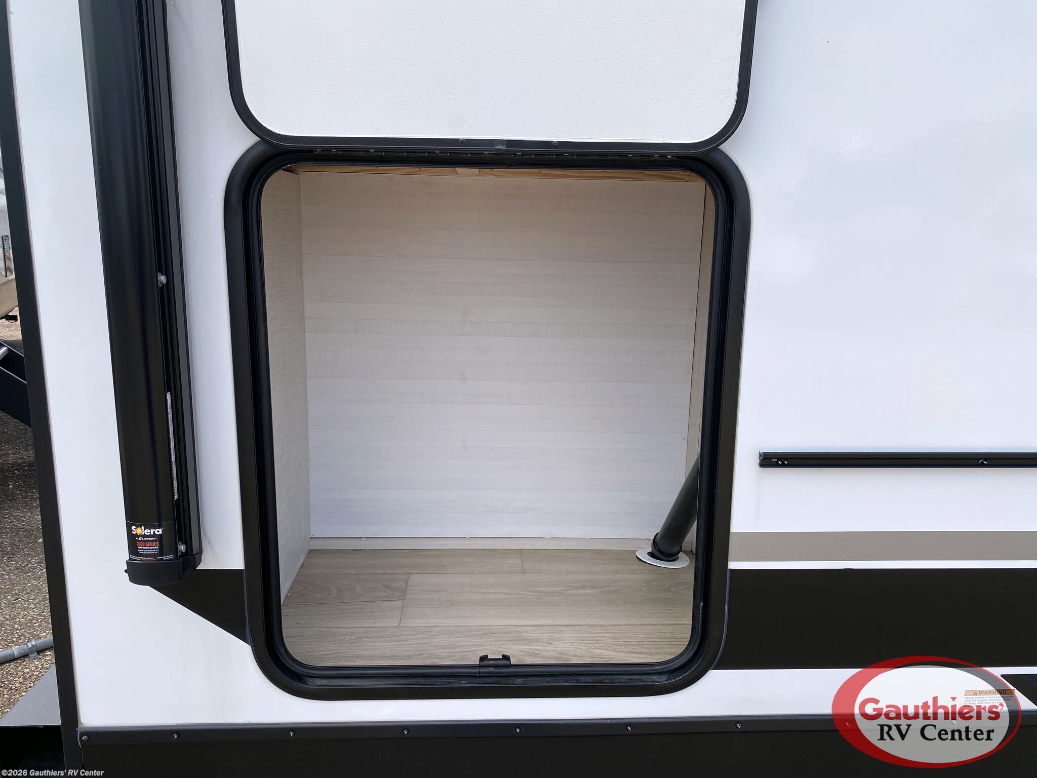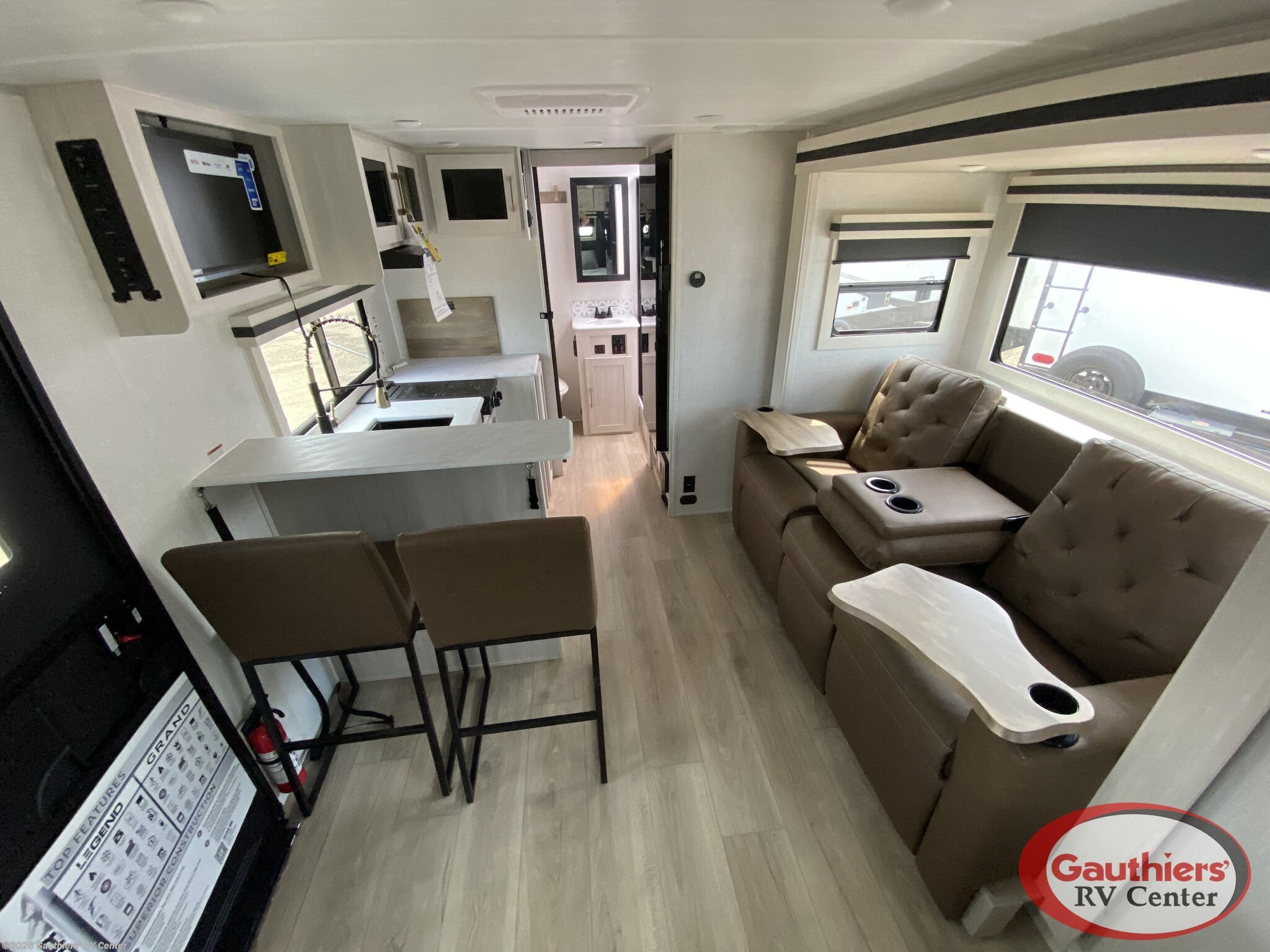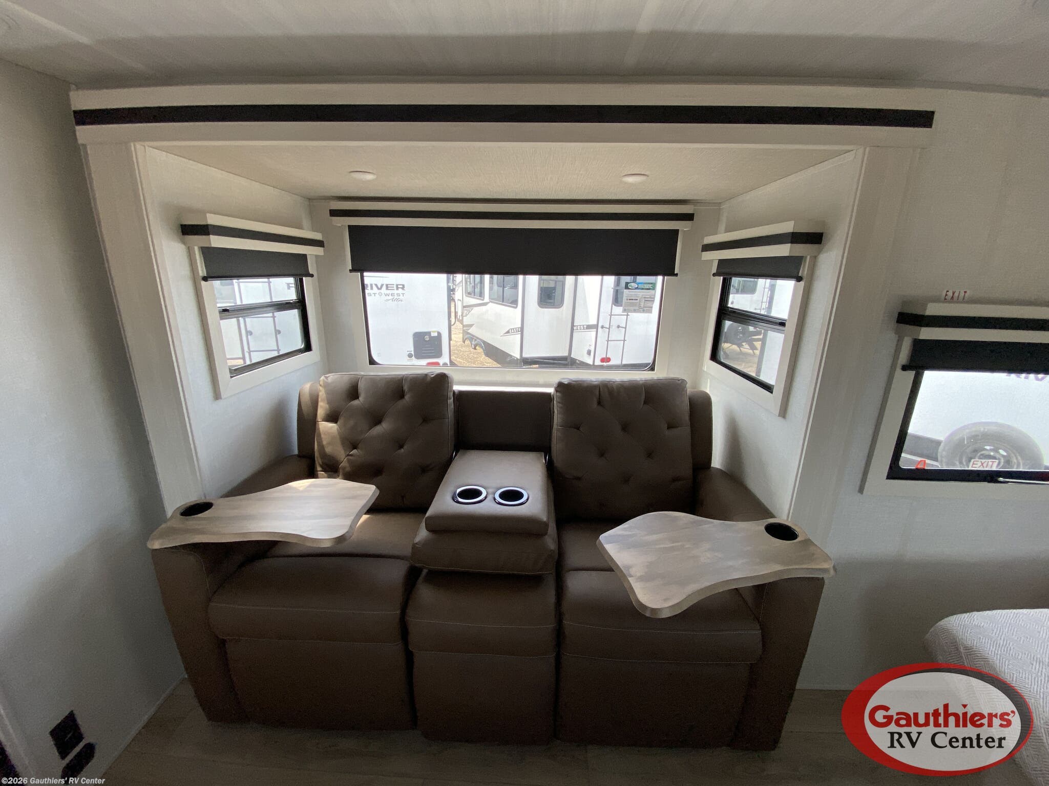 SINGLE SLIDE REAR BATH TRAVEL TRAILER WITH POWER AWNING, 400 WATT ROOFTOP SOLAR POWER, THEATRE SEATING, AND 12 VOLT 10 CUBIC FOOT REFRIGERATOR.