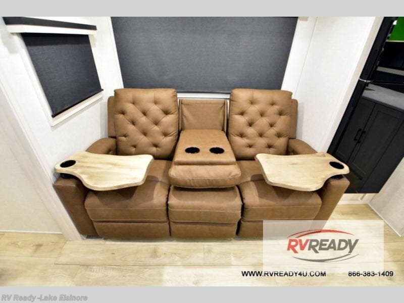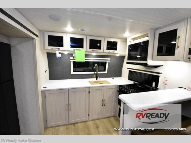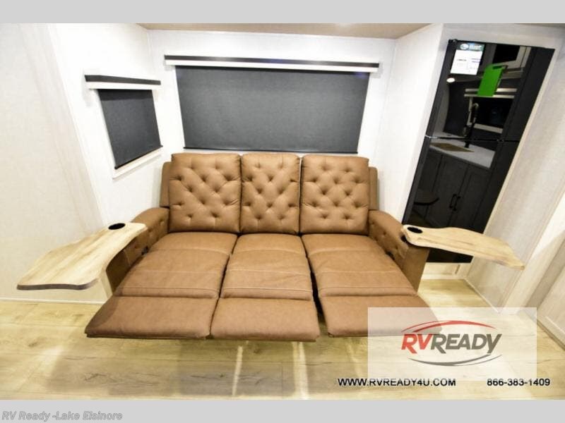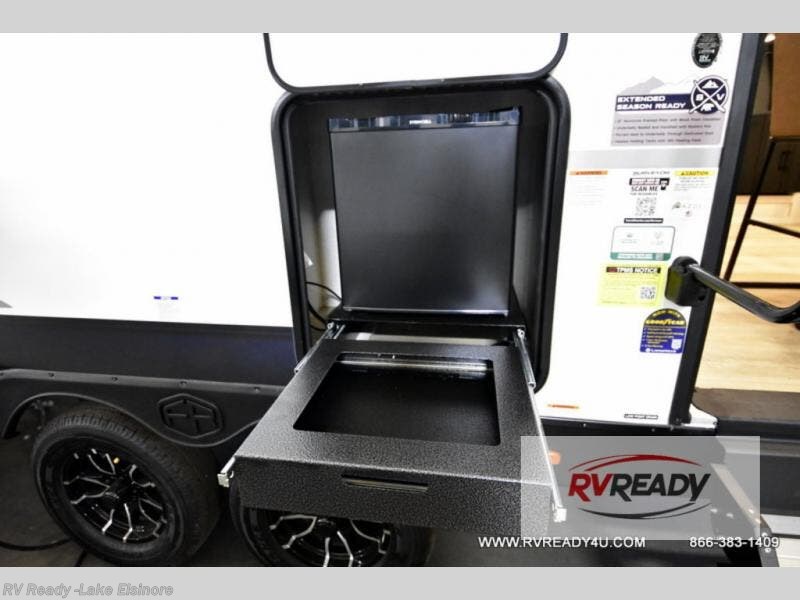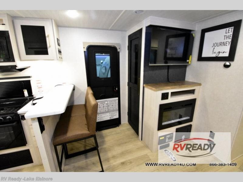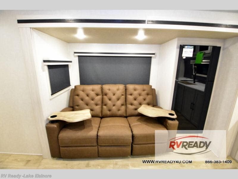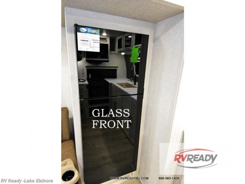This dual entry, front kitchen travel trailer is perfect for three to four campers. You will have a rear private bedroom with a walk-around queen bed, dual wardrobes, TV prep, plus your own exterior entry door. You'll love relaxing on the theater seating, and if you need more sleeping space, just choose the optional tri-fold sofa or booth dinette in place of this. Preparing meals each day will be a breeze in the front kitchen that includes ample counter space, a residential range top with a glass cover, plus a spacious walk-in pantry. There is also an outside kitchen with a refrigerator, an 18' power awning with LED lights, and a pass-through storage for camp gear!