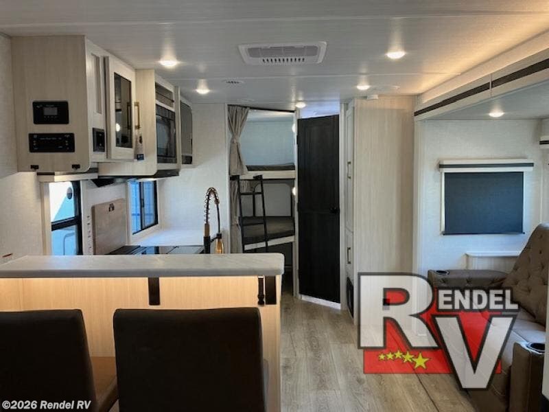 The Surveyor Legend 260BHLE offers a thoughtful layout with sleeping accommodations for up to 7 people. It includes oversized bunk beds, a front private bedroom with a queen bed, and a full bath for your convenience. Enjoy great meals with family and friends at the booth dinette slide, complemented by a stylish bar top with stools. Relax indoors with a state-of-the-art HD TV for memorable movie nights. After a day of exploration, retreat to the cozy front bedroom for a restful night’s sleep, where you can conveniently store your belongings in the dual bedroom wardrobes.