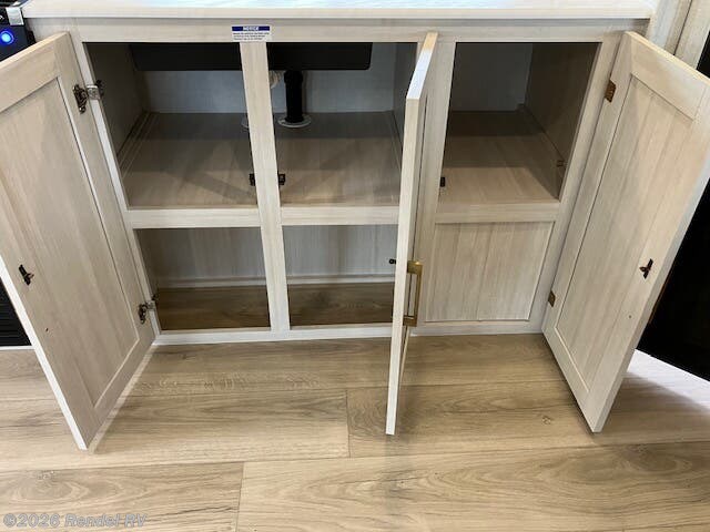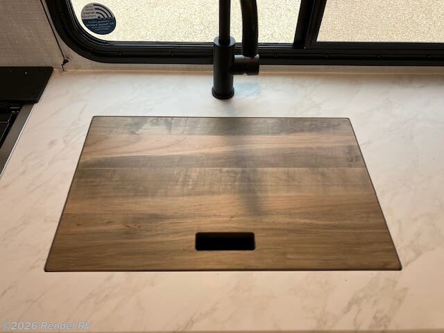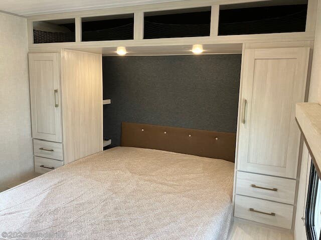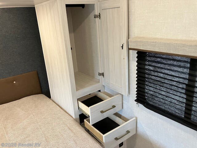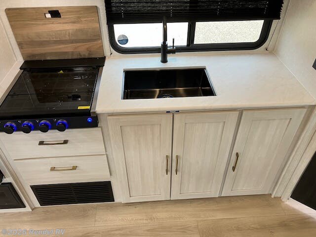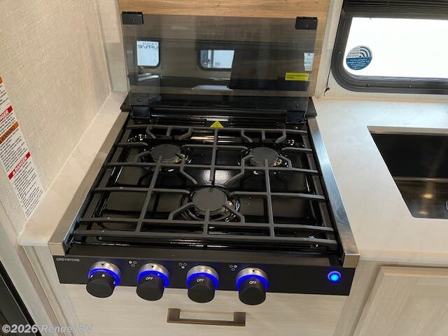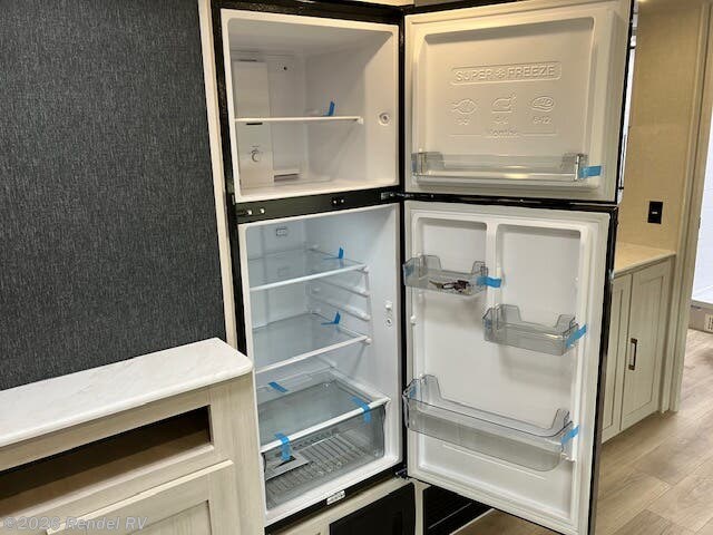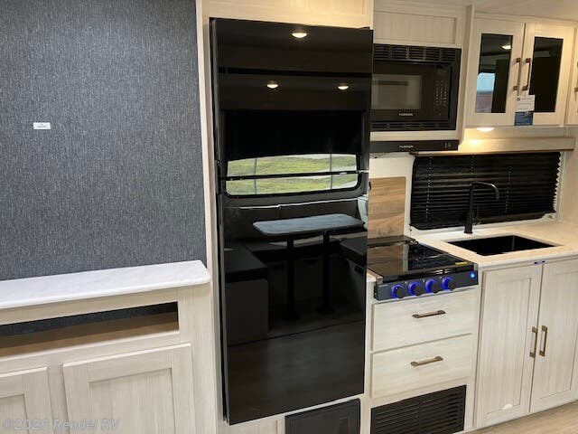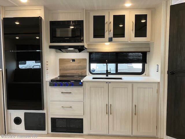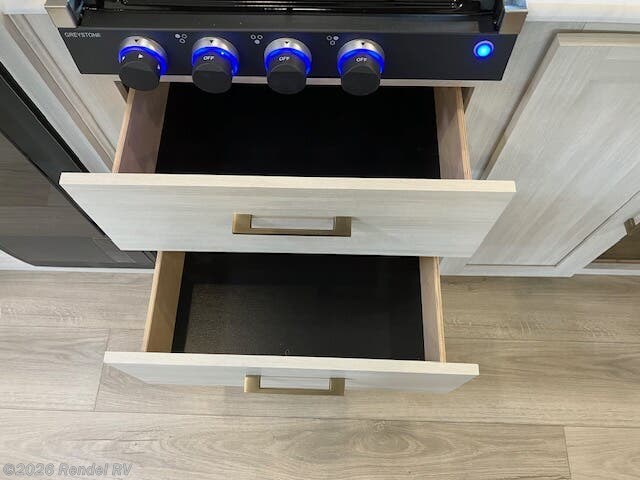 The Surveyor Legend X is equipped with everything you need for a cozy camping experience. Enjoy the convenience of a dual air conditioning system, including an 18.5K AC main unit and a 13.5K AC in the front bedroom, ensuring a perfect climate year-round. The on-demand tankless water heater provides endless hot water for your showers, while the fully equipped kitchen boasts a microwave with air fryer capability, an oven, and a stove top burner.