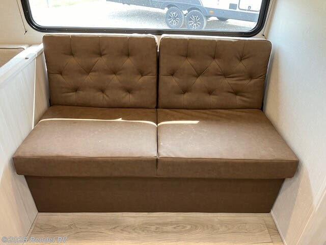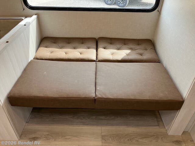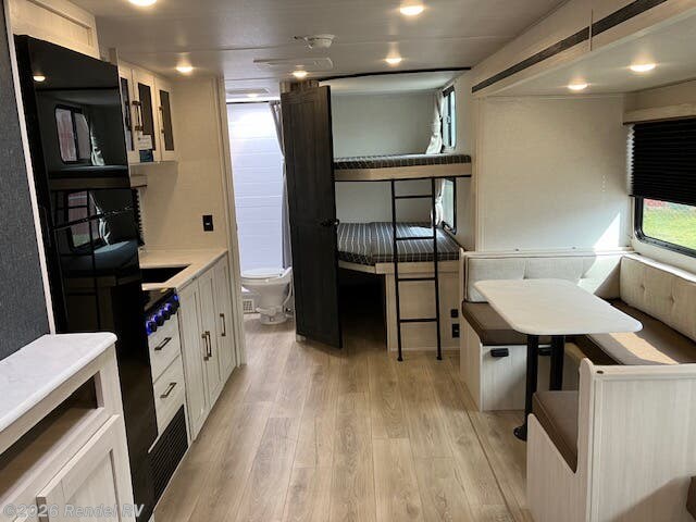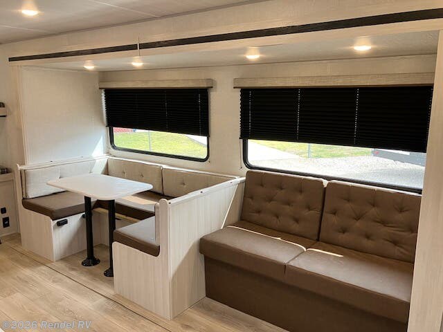 Family-friendly functionality is at the heart of this model, featuring spacious bunk beds (44x74 inches) for children or guests, and a 60x80 inch queen bed in the private front bedroom. A U-shaped dinette and couch in the main living area allow for easy socializing or enjoying meals together.