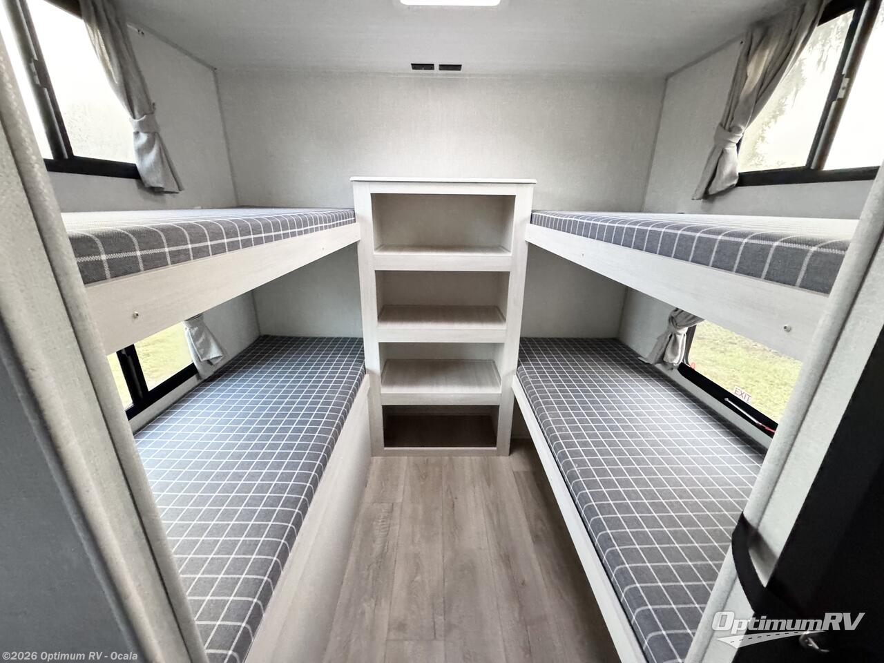 Head to your favorite camping spot with your favorite people in this spacious, dual entry travel trailer! The large slide out houses the booth dinette and sofa where you can relax in the evenings and even let guests sleep over who haven't claimed the quad bunks in the rear bunkhouse. A walk-thru bath is convenient for all, and the full kitchen lets you whip up your best meals in the microwave with an air fryer. And a walk-in pantry with washer and dryer prep makes it easier to go full-time if you choose! When it's time to call it a night, the front master bedroom with a queen bed will provide you with your own space to retreat to, and there are dual bedside wardrobes to keep your clothes organized.