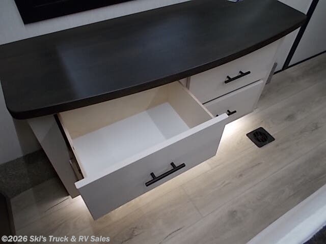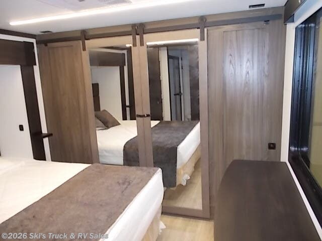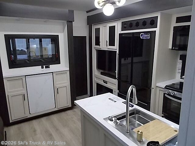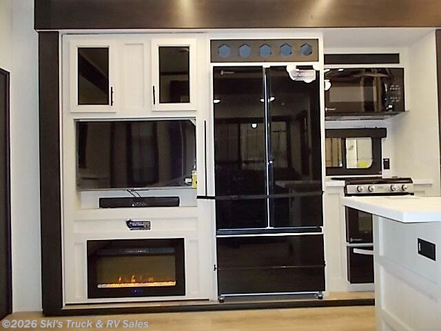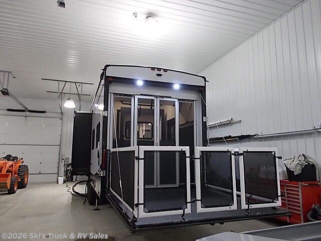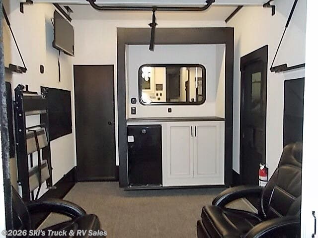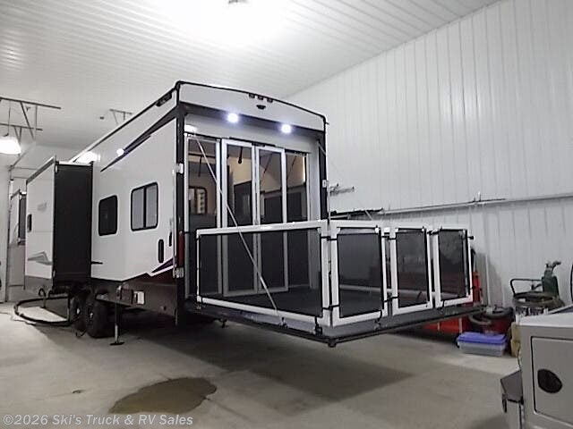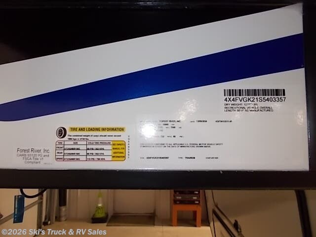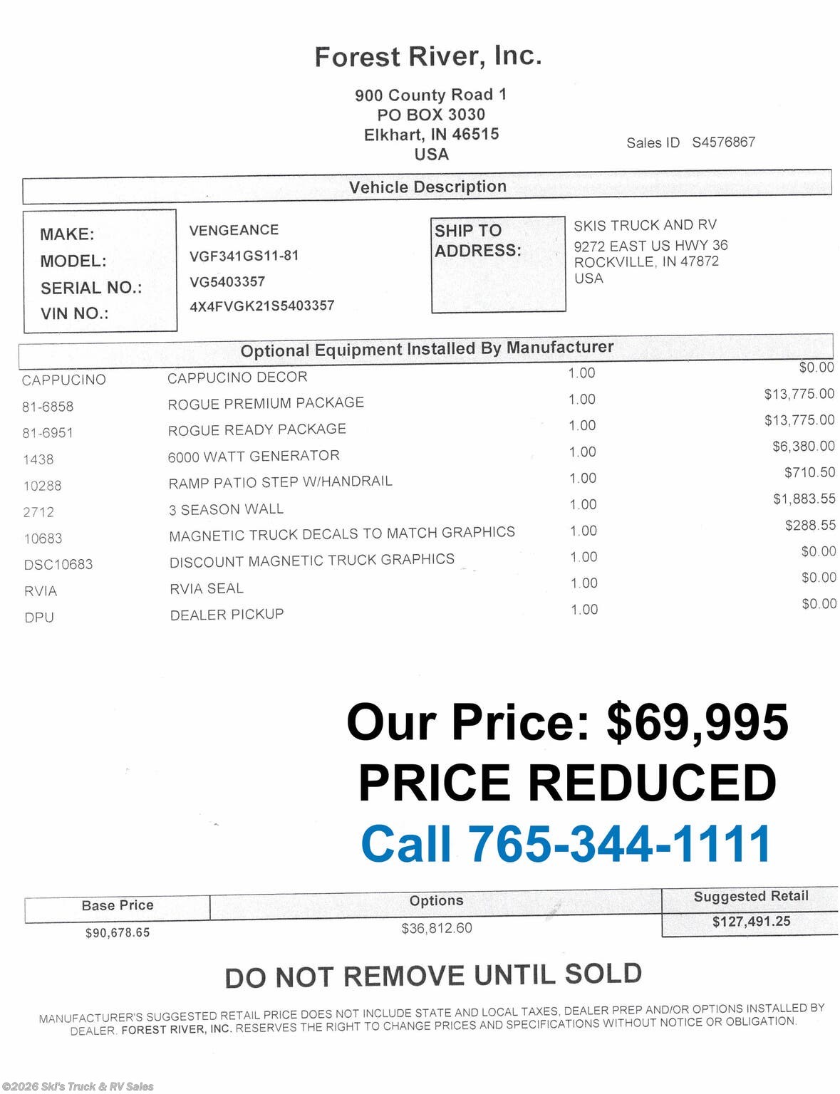 2025 Forest River Vengeance 34GS11 Armored Fifth Wheel Toy Hauler; 39 Foot; 3 Outside Slides / 1 Inside Slide; 11 Foot Garage; Party Deck with 3-Season Rear Patio Doors and Railing; 30 Gal. Fuel Cell; Sleeps 4-6; Hitch Weight: 2990 Lbs.; Dry Weight: 12,777 Lbs.; 50 Amp; Auto Leveling; 160 Gal. Fresh Water Cap.; 40 Gal. Black Water Cap.; 40 Gal. Gray Water Cap.; Two 20 Lbs. Propane Tanks; Two ACs: 15,000 BTUs; 30,000 BTU Furnace; 17 C.F. (12V) Refrigerator; On Demand Water Heater; Microwave; 3-Burner Stove/Oven; Three TV Jacks; TV Projector; 42 In. TV; 32 In. TV; AM/FM; Sound Bar; USB; Speakers; Winegard 360 Antenna; Wine Rack; One Fireplace; Kitchen Barstools; Stainless Steel Sink; Free Standing Dinette; Recliners; Theater Seats with Heat/Massage; Queen Bed; Pull Down Queen Bed in Garage; One Bathroom with Shower; Two Awnings: 13 Foot Power Awnings with LED Lights; Lots of Exterior Lighting; 6000 W Generator; 200 W Solar Package; Backup Camera Prep.; Outside Shower; Exterior Storage; Foldup Steps; Grab Handle; Roof Ladder Prep.; Leash Latch; Battery Disconnect; Black Tank Flush; Climate Package; Heated Tanks; Tinted Windows; Zebra Shades; Aluminum Wheels; Tire Monitoring System; One Year Limited Warranty; Financing Available; Great Fifth Wheel Toy Hauler for the Price: $69,995 *PRICE REDUCED*. Call Skis Truck & RV Sales at 765-344-1111 or visit us at for more information.