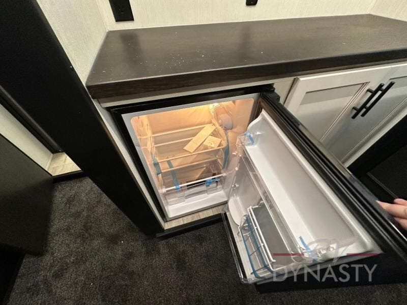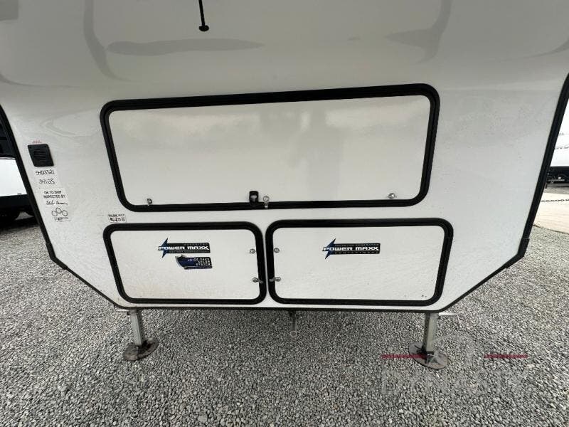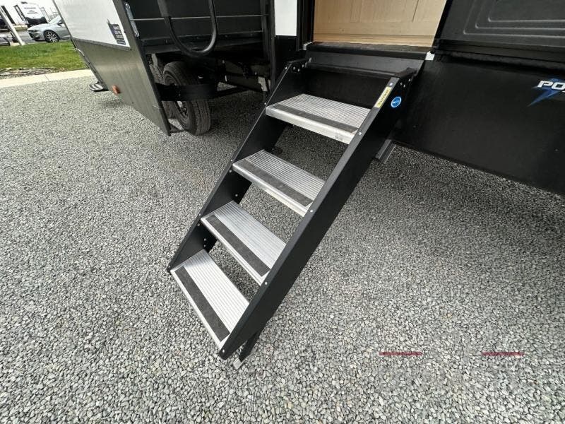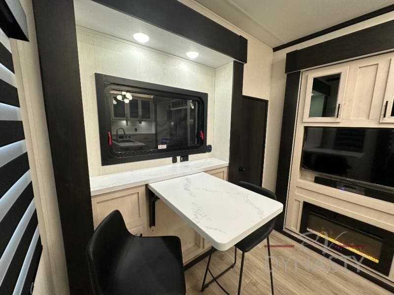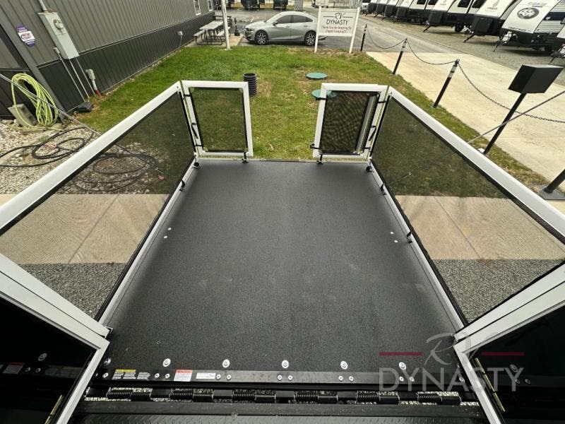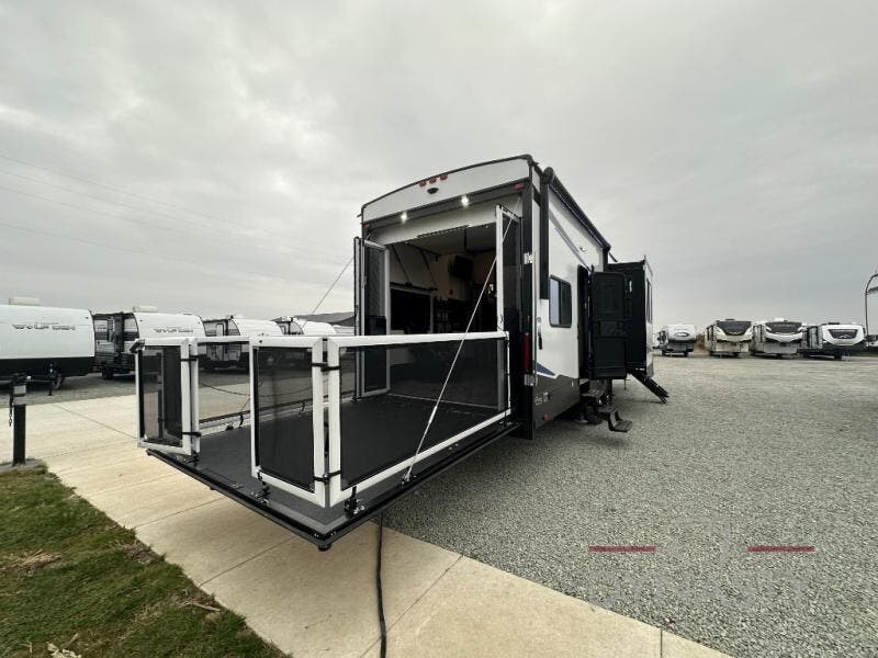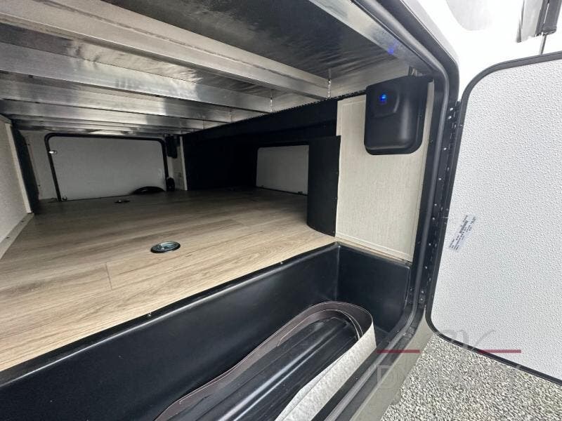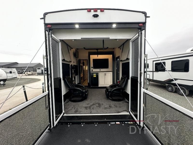 This toy hauler with an 11' separate garage is sure to meet your needs! After you've unloaded your toys, you can relax on the Euro recliners or set up the drop-down queen bed for guests if it's getting late. There is also a window in the garage that opens to the main living area to keep everyone connected, and the flip-up table on the other side of the window provides a place to dine at. A counter peninsula will give the chef of your group more space to prep meals, and the dual opposing slides in this space make it more open. You'll also enjoy the sofa with recliners across from the entertainment center with a fireplace. A full bath with a spacious shower is perfect for cleaning up after a day of trail riding, and the front private bedroom with a queen bed slide is sure to have you feeling right at home!
