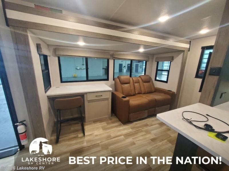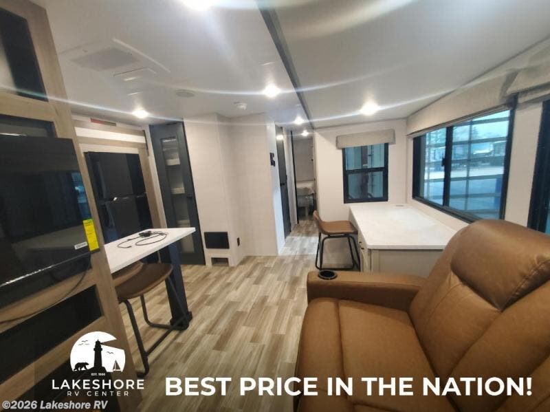 This Vibe travel trailer is perfect for your next getaway! Relax on the theater seating opposite the entertainment center with fireplace. A bar top counter provides plenty of space in the kitchen, where you will also love the fridge, electric oven, and spacious pantry. A desk area even allows you to work if you have to! At night retire to the front bedroom with its custom king bed. The full bath features a spacious 36" x 30" shower, linen closet, and even prep for an optional washer/dryer. Outside you will find dual awnings and an outside fridge so you can grab drinks on the go.
