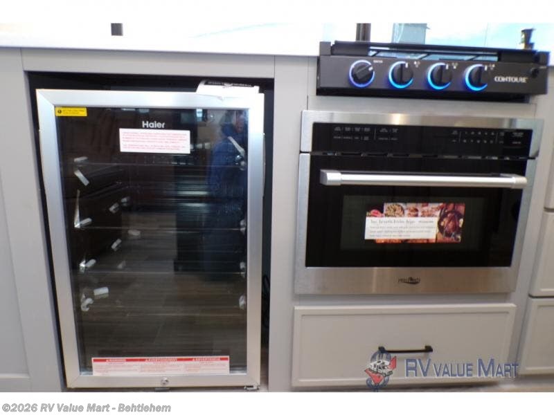 You won't believe all that this travel trailer has to offer! If you need to get some work done then you can utilize the flip-up desk next to the oversized refrigerator and large pantry. The kitchen island makes meal prepping easier, and the beverage cooler helps save space in your refrigerator for perishables. The kitchen skylight brings in natural lighting. Relax each night on either the tri-fold sofa or theater seating across from the entertainment center with a fireplace, or you can play some games at the booth dinette. As you enter the bathroom, you will notice the washer and dryer prep that will give you the ability to add these appliances. The front private bedroom has a custom king bed slide with nightstands on either side with power to charge your electronics while you recharge. The exterior not only has pass-through storage and two awnings, but also a 48" x 48" baggage door!
