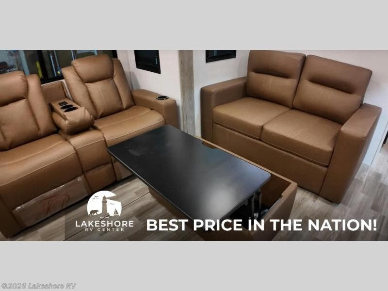 You won't believe all that this travel trailer has to offer! If you need to get some work done then you can utilize the flip-up desk next to the oversized refrigerator and large pantry. The kitchen island makes meal prepping easier, and the beverage cooler helps save space in your refrigerator for perishables. The kitchen skylight brings in natural lighting. Relax each night on either the tri-fold sofa or theater seating across from the entertainment center with a fireplace, or you can play some games at the 5-person dinette. As you enter the bathroom, you will notice the washer and dryer prep that will give you the ability to add these appliances. The front private bedroom has a custom king bed slide with nightstands on either side with power to charge your electronics while you recharge. The exterior not only has pass-through storage and two awnings, but also a 48" x 48" baggage door!