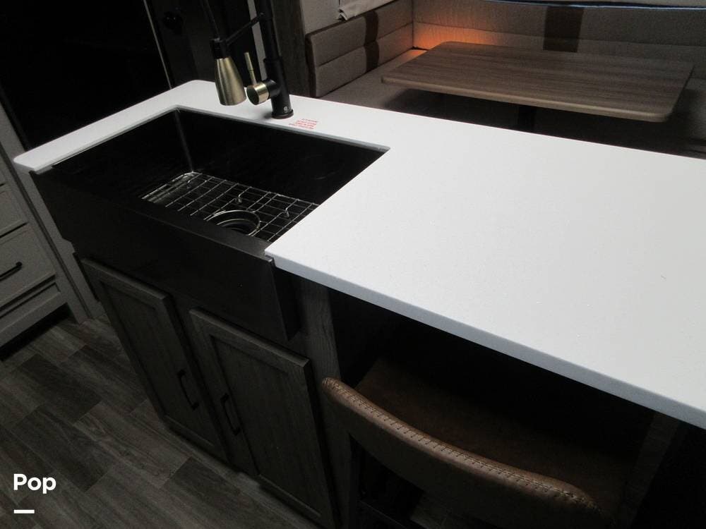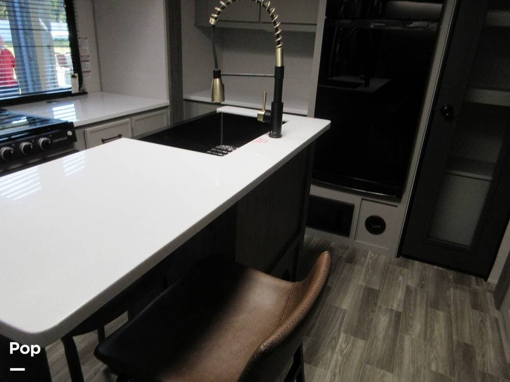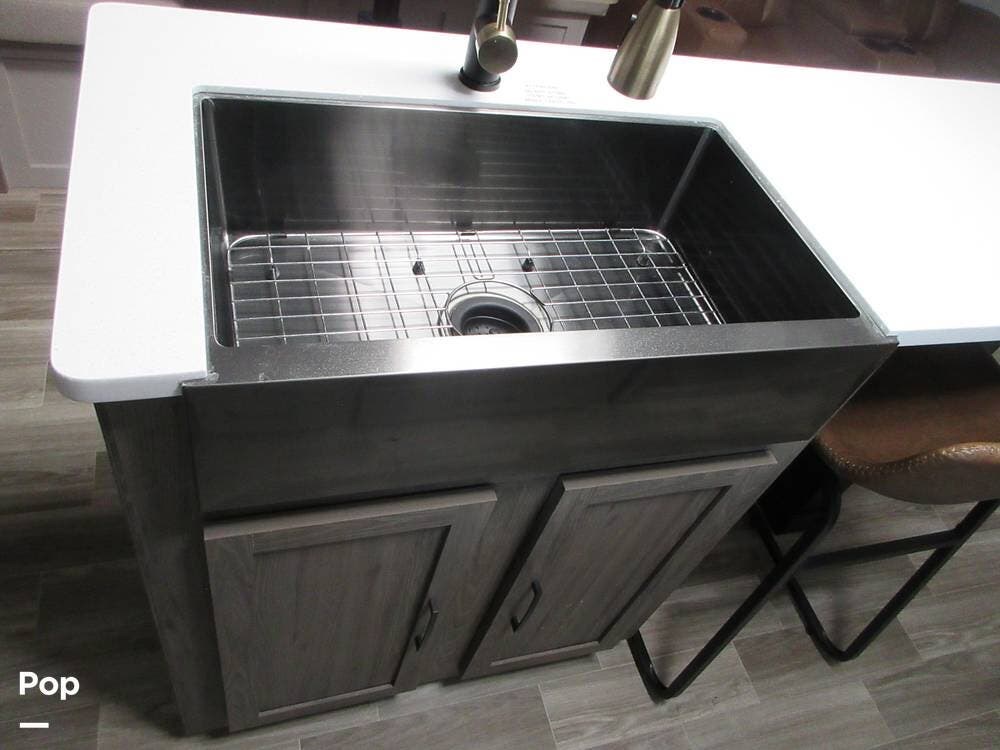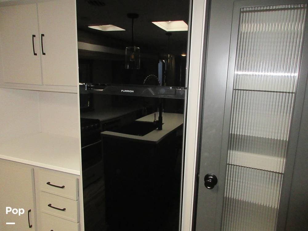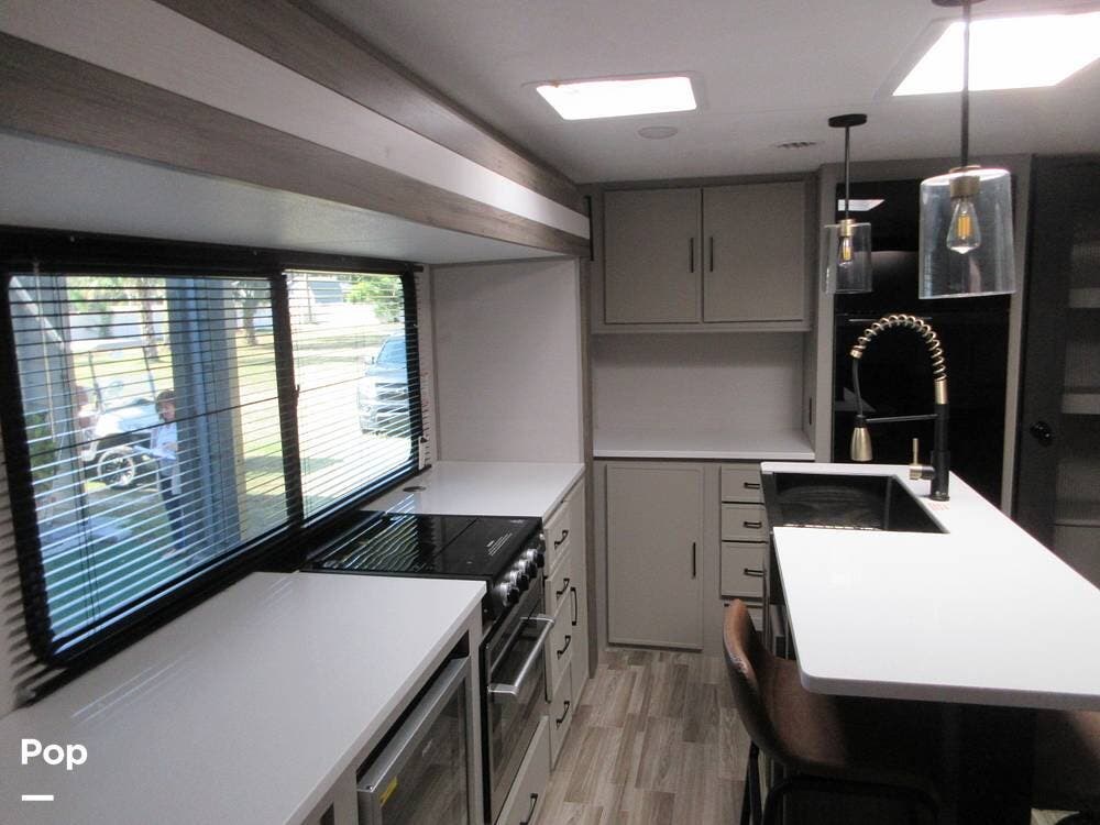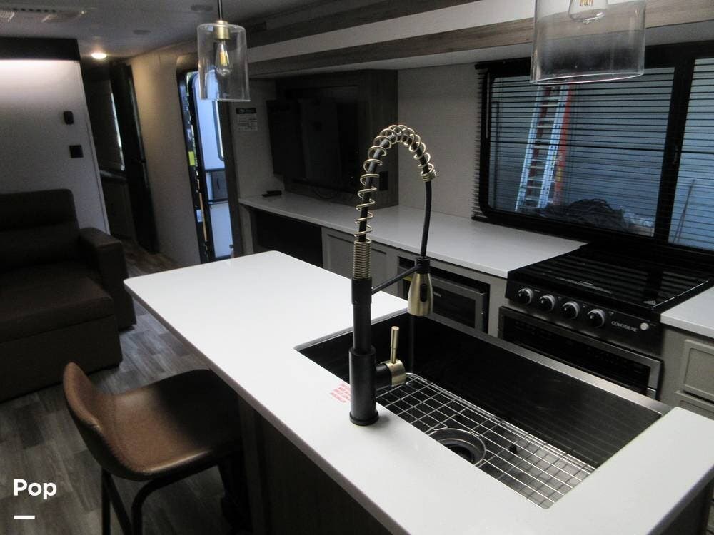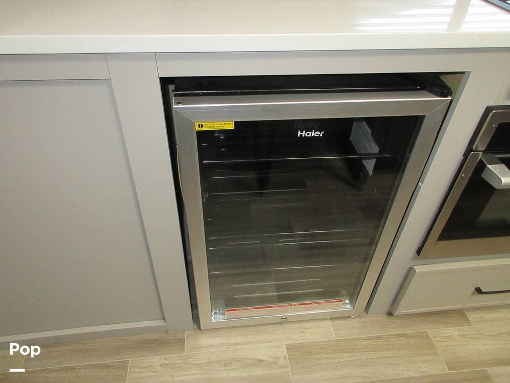 Features three slide-outs and an open floor plan. Full kitchen with an island, a large sink, and seating around the counter. A refrigerator, stove, oven, and a wine cooler fridge. Big pantry and coffee bar/hutch with plenty of storage.