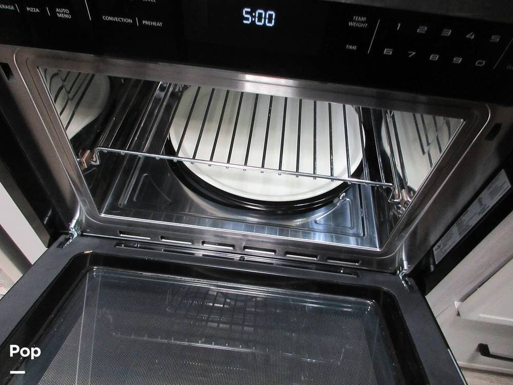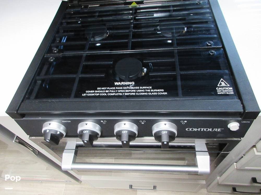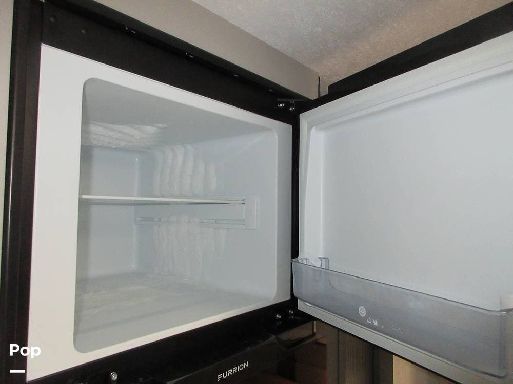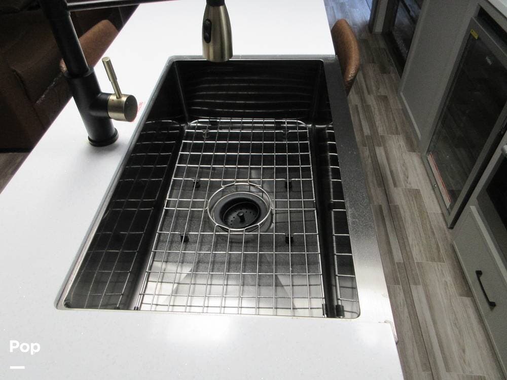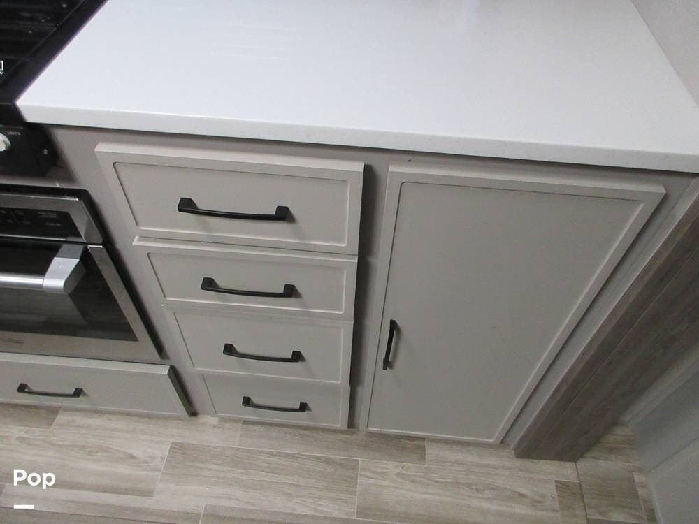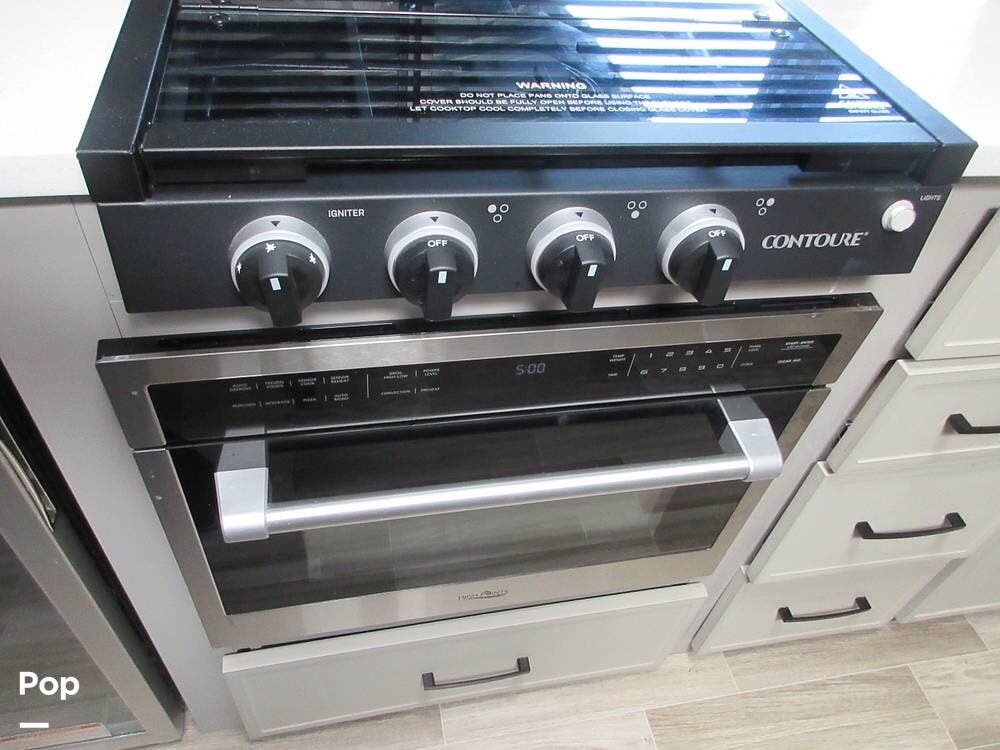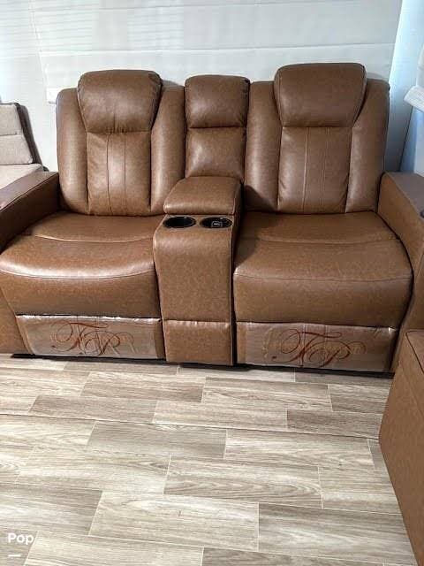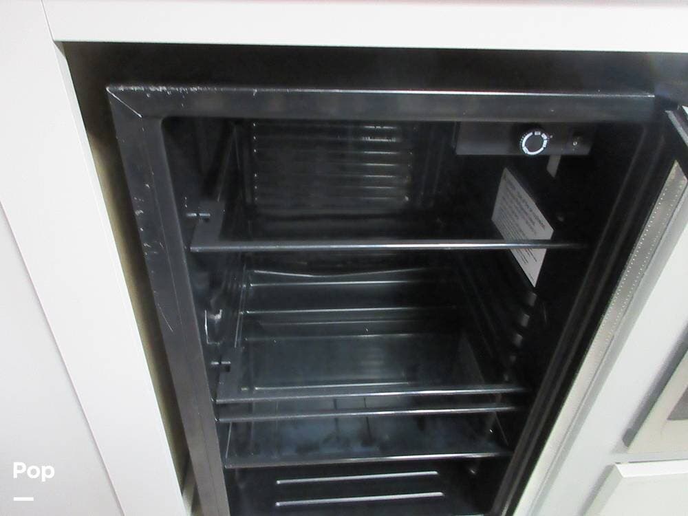 Features three slide-outs and an open floor plan. Full kitchen with an island, a large sink, and seating around the counter. A refrigerator, stove, oven, and a wine cooler fridge. Big pantry and coffee bar/hutch with plenty of storage.