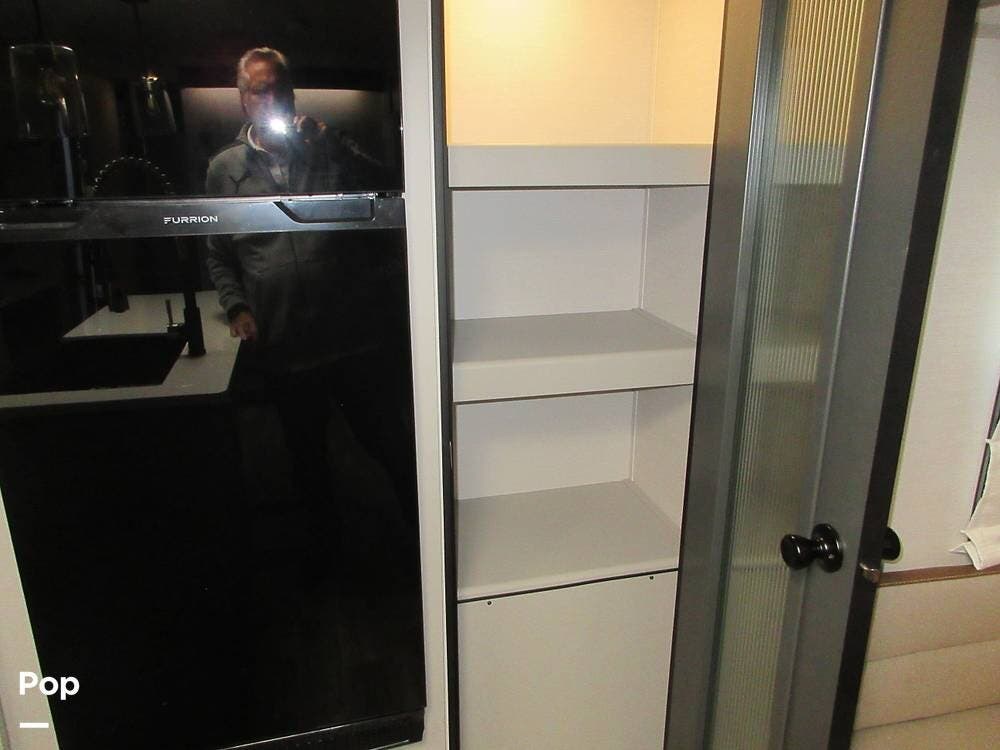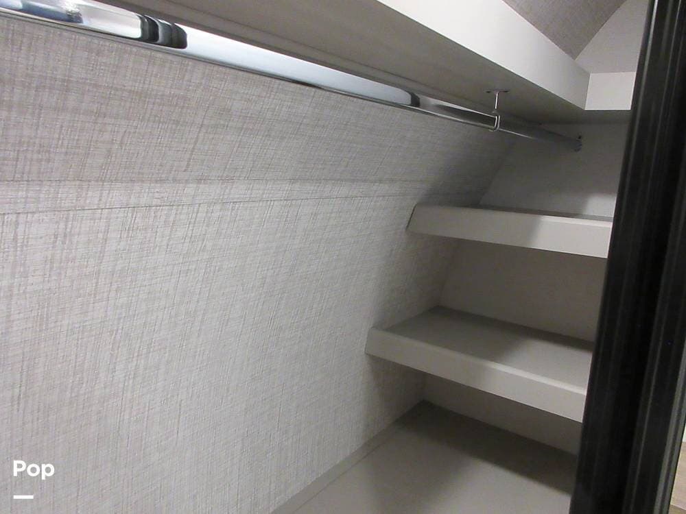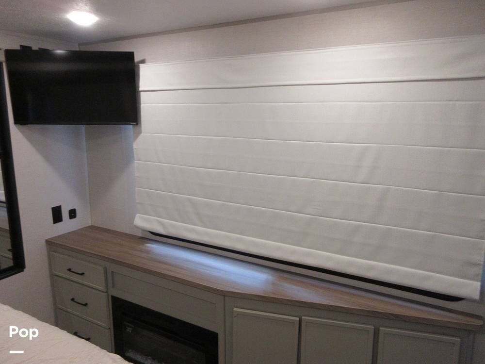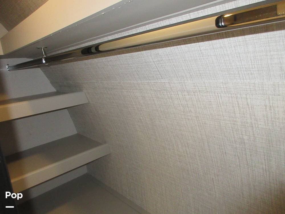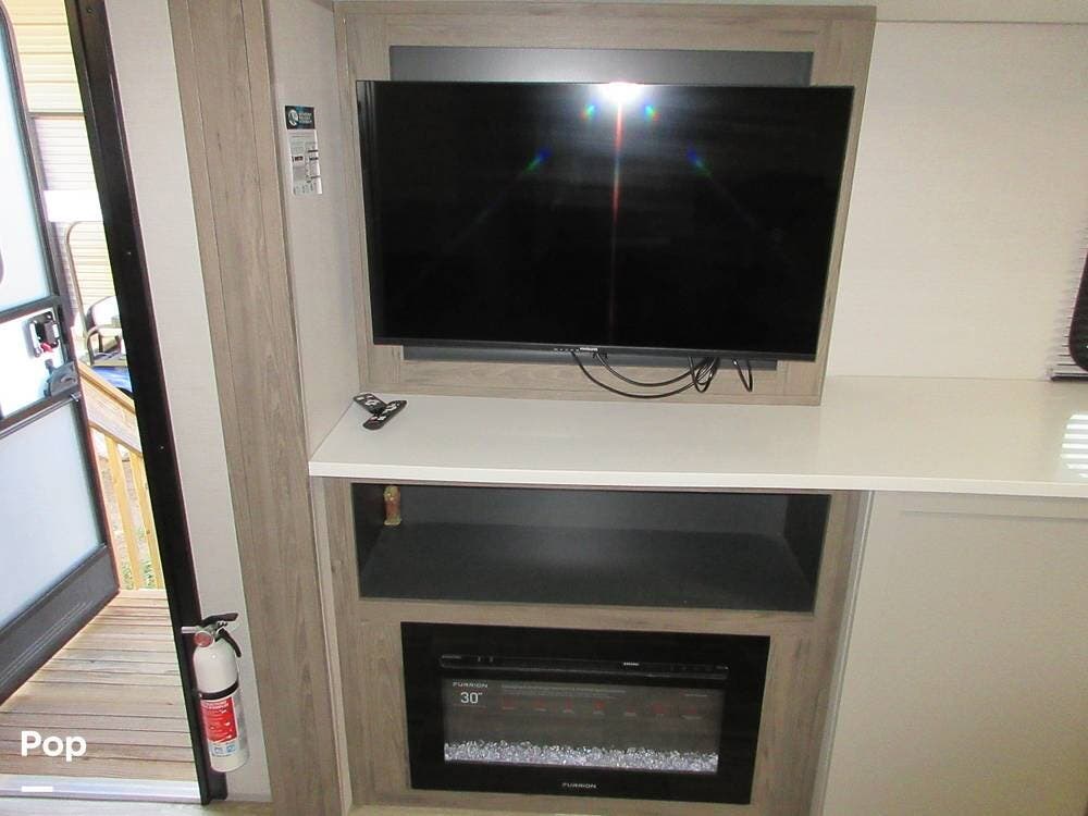 The front private bedroom has a custom king bed slide with nightstands on either side. A large closet with shelves, a TV, and a fireplace between the dresser drawers.