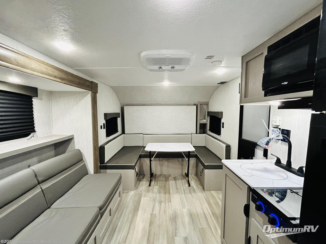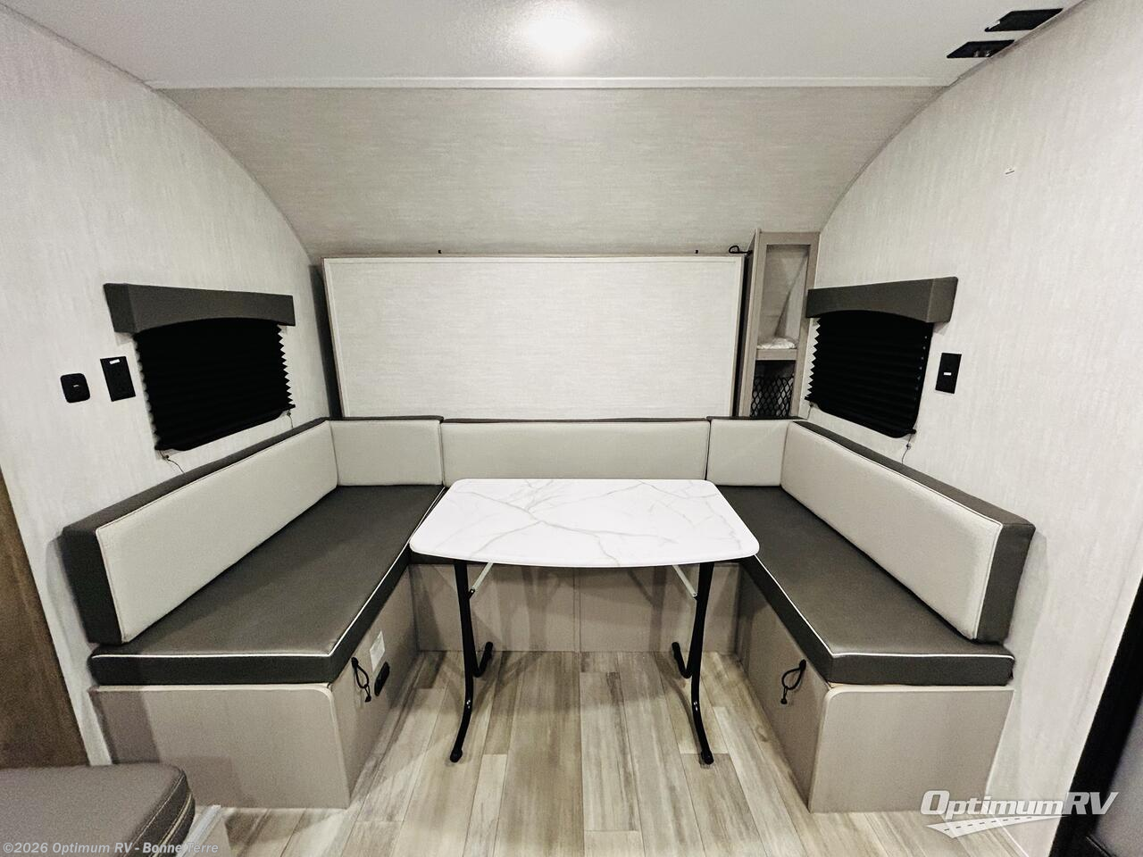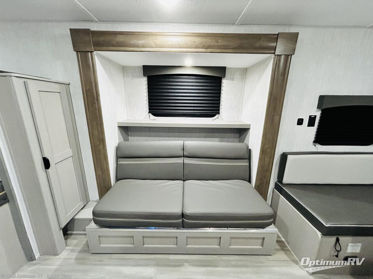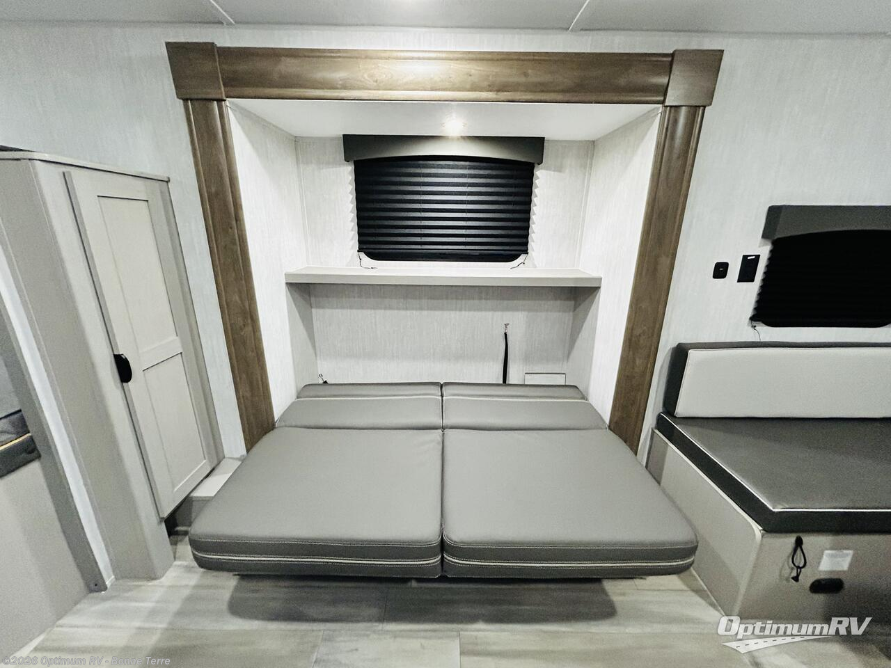 This versatile trailer easily sleeps a family of six and provides plenty of seating thanks to the versatile front hidden Murphy bed and U-dinette. During the day, the U-dinette provides seating for the whole gang. At night, move the table and cushions and flip down a comfortable bed. There is a jackknife sofa slide, and opposite you will find the kitchen area allowing you to easily whip up meals and snacks using the two burner cooktop, sink, overhead microwave oven, and refrigerator. A pantry cabinet is also available for all of your dry goods. At the rear of this unit, you will find sleeping for four on the double-size bunks along the roadside corner, and a full bath with a shower, toilet, and vanity with a sink and medicine cabinet along the curbside corner.