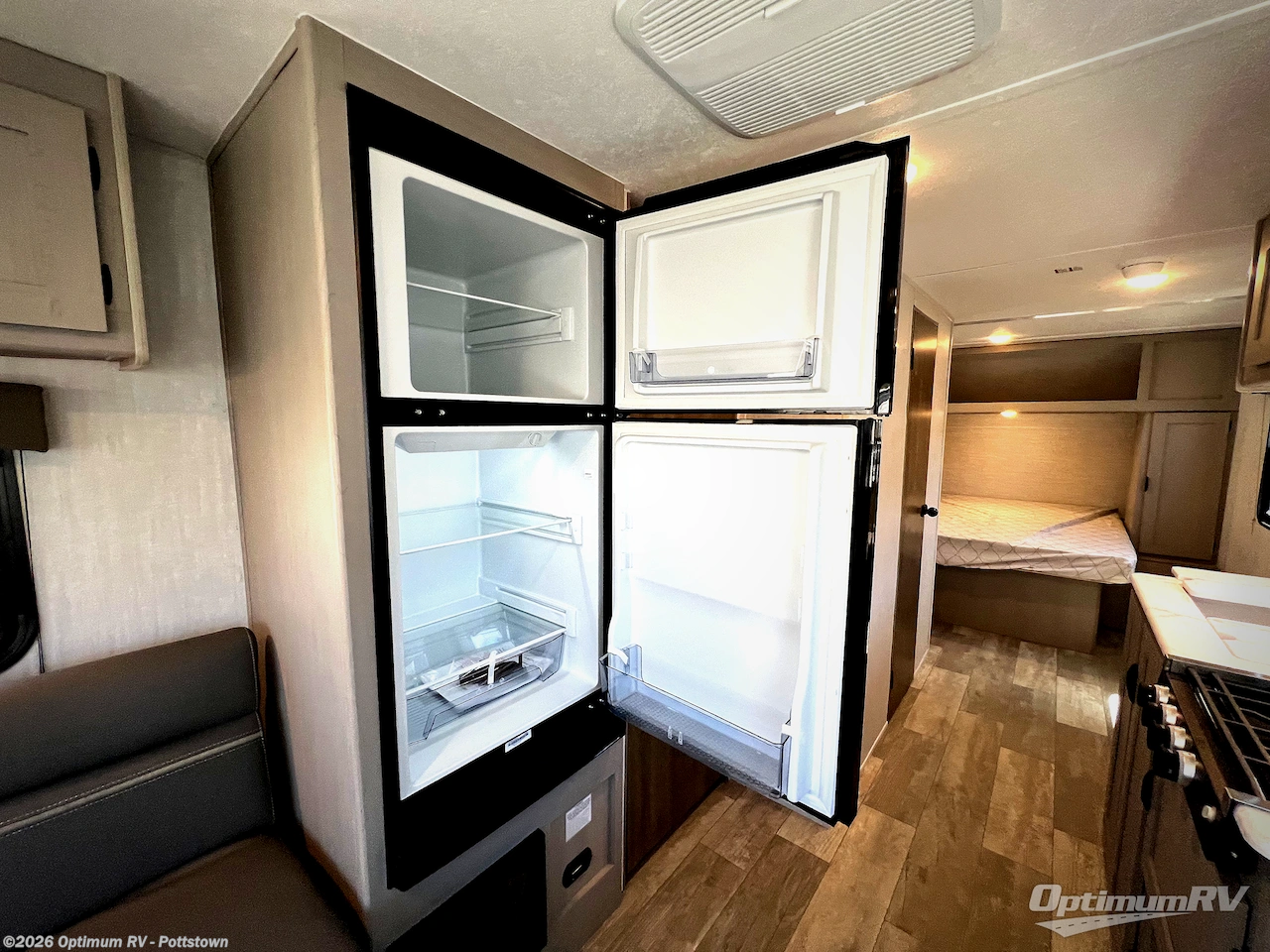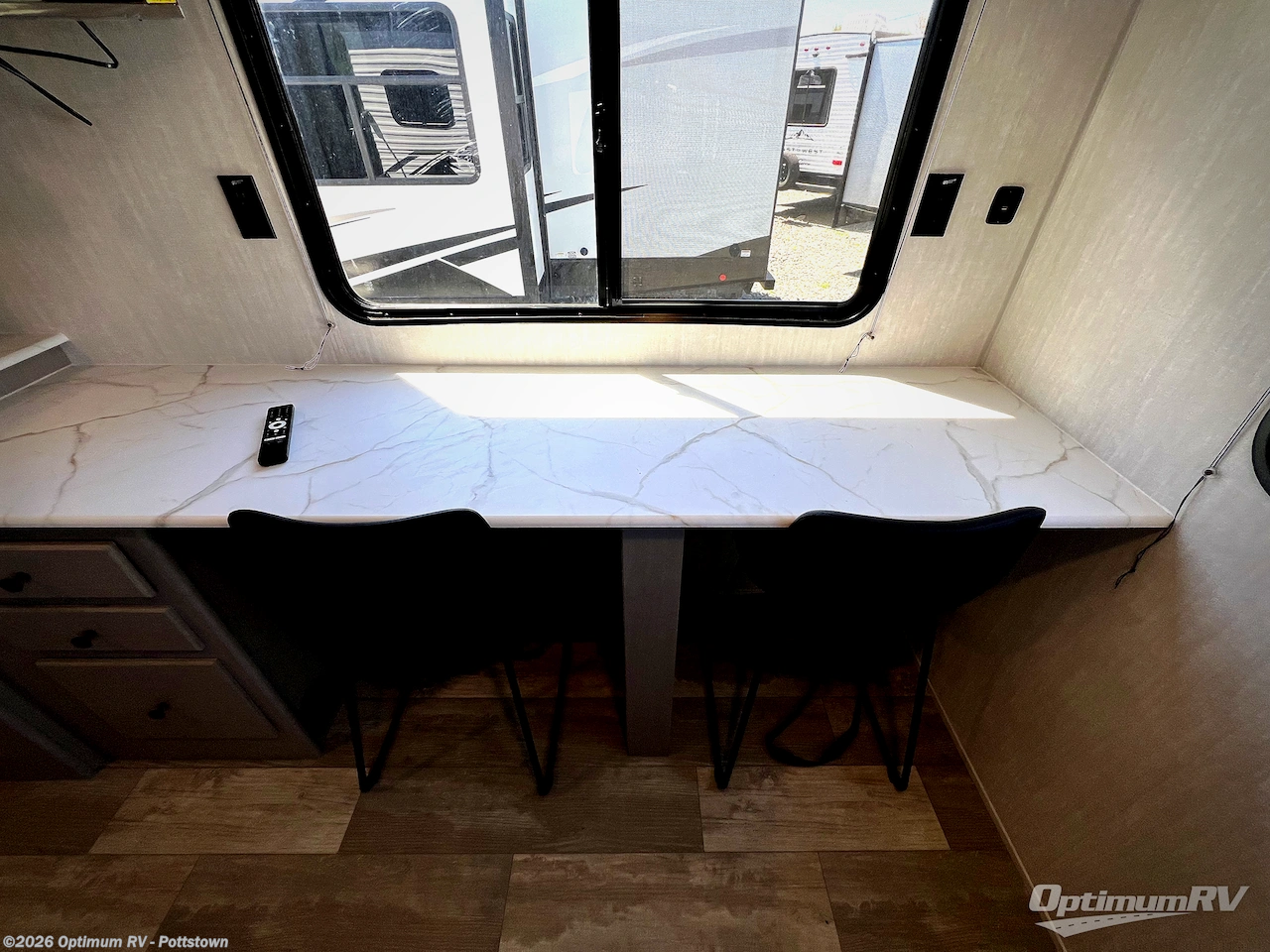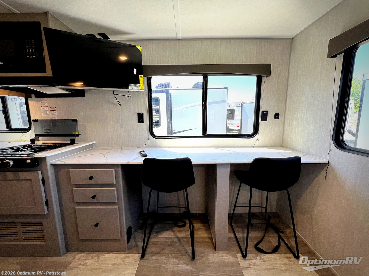 Time spent in this travel trailer will be time well spent! There is a front bedroom with a 60" x 74" queen bed, dual wardrobes, and a private shelf on either side of the bed to keep your belongings close by. A three burner cooktop and microwave will let you make meals each day, and an 8 cu. ft. 12V refrigerator and pantry will help keep food stocked. This unit includes a large countertop with two barstools in the back where you can dine together, along with a jack knife sofa on the other side for a place to relax!