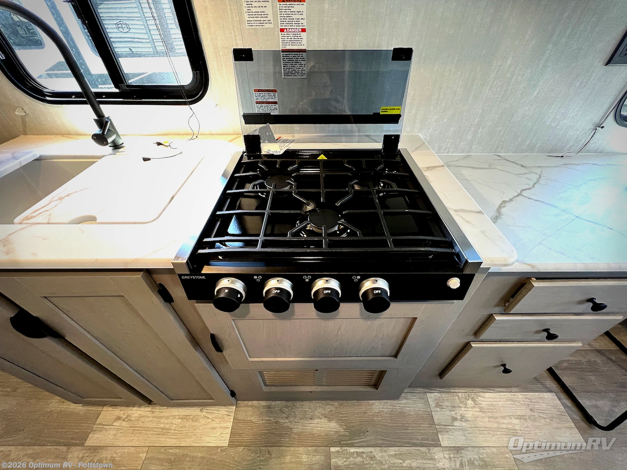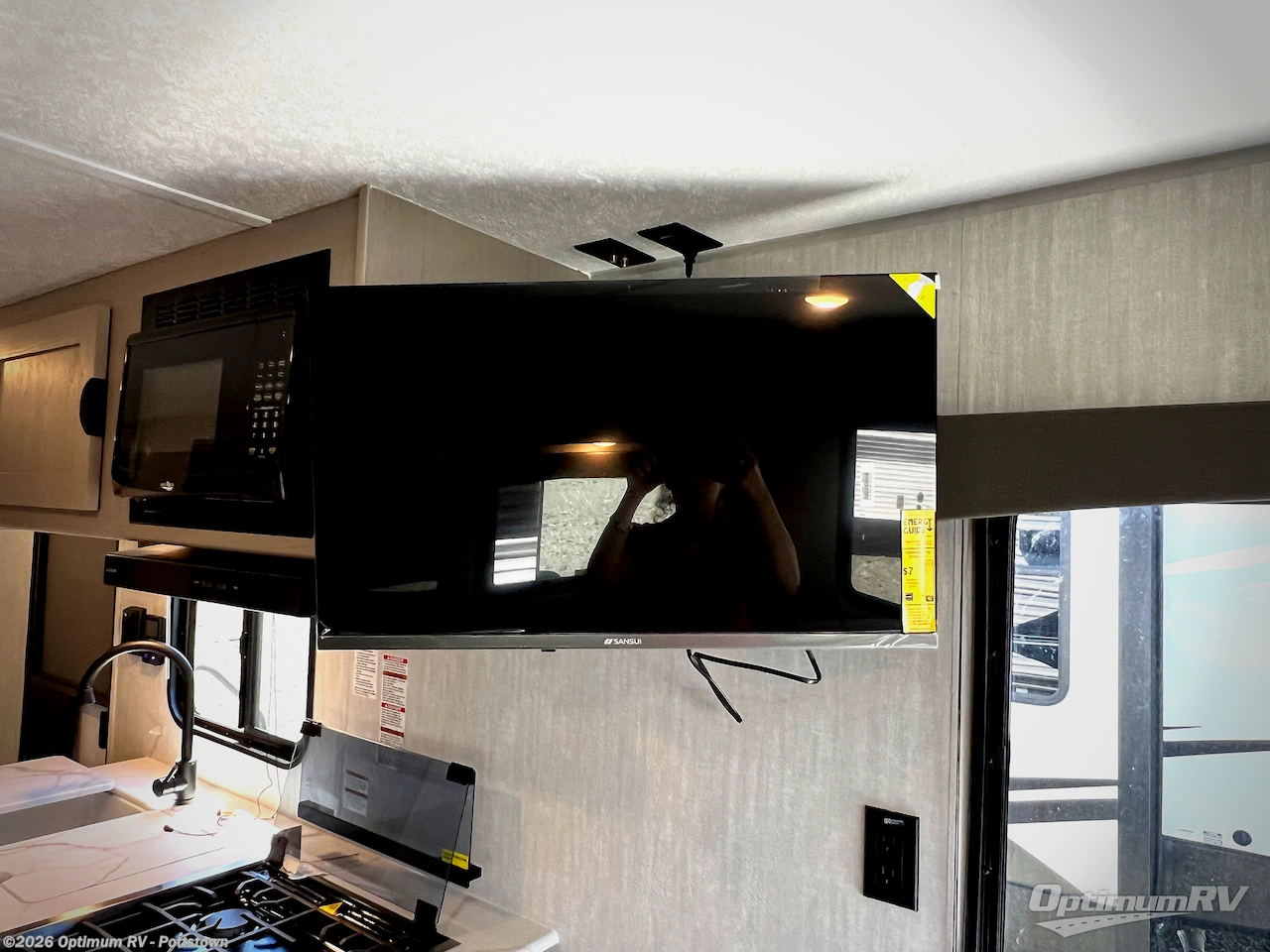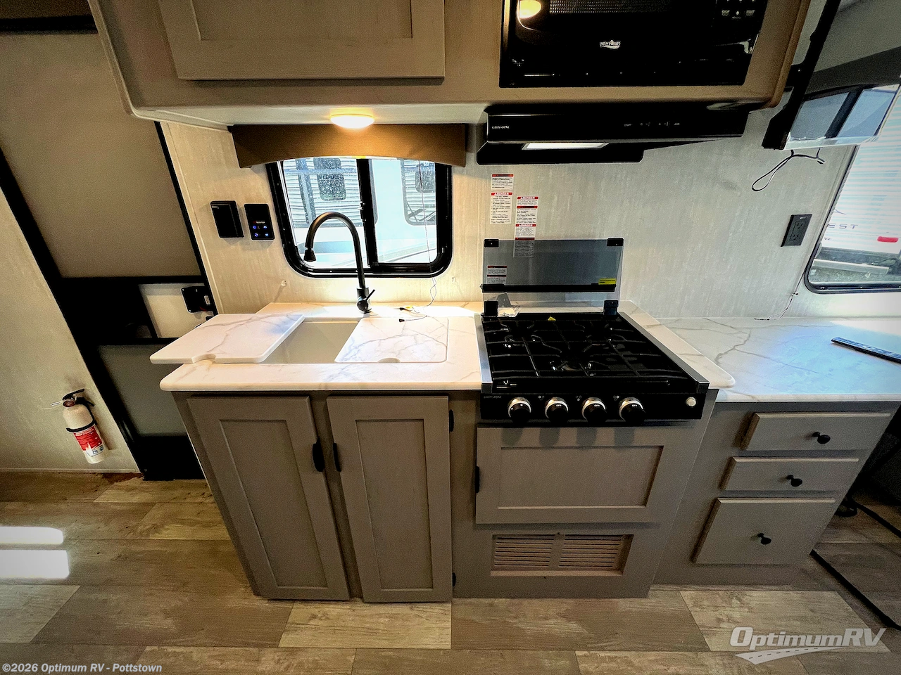 Time spent in this travel trailer will be time well spent! There is a front bedroom with a 60" x 74" queen bed, dual wardrobes, and a private shelf on either side of the bed to keep your belongings close by. A three burner cooktop and microwave will let you make meals each day, and an 8 cu. ft. 12V refrigerator and pantry will help keep food stocked. This unit includes a large countertop with two barstools in the back where you can dine together, along with a jack knife sofa on the other side for a place to relax!