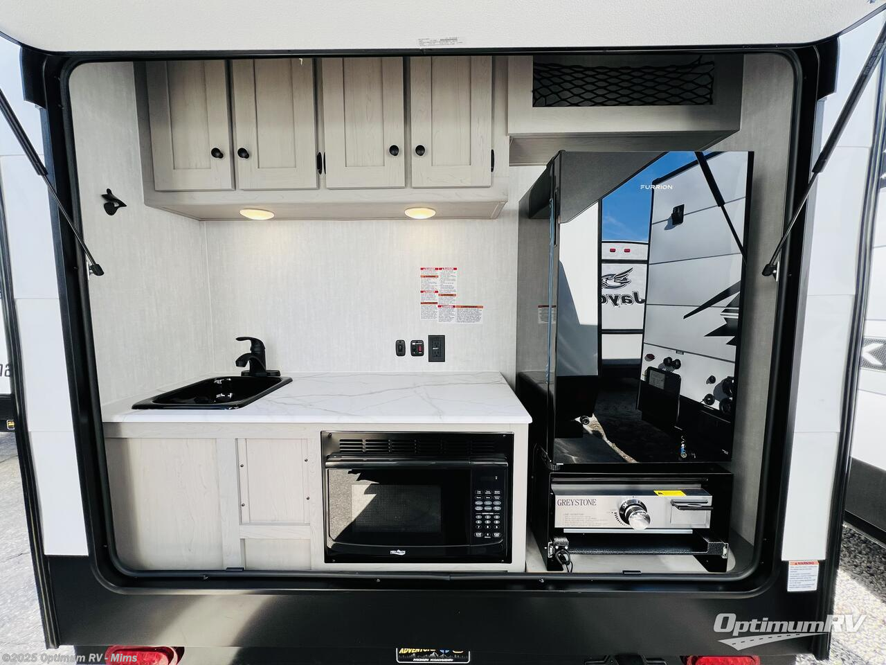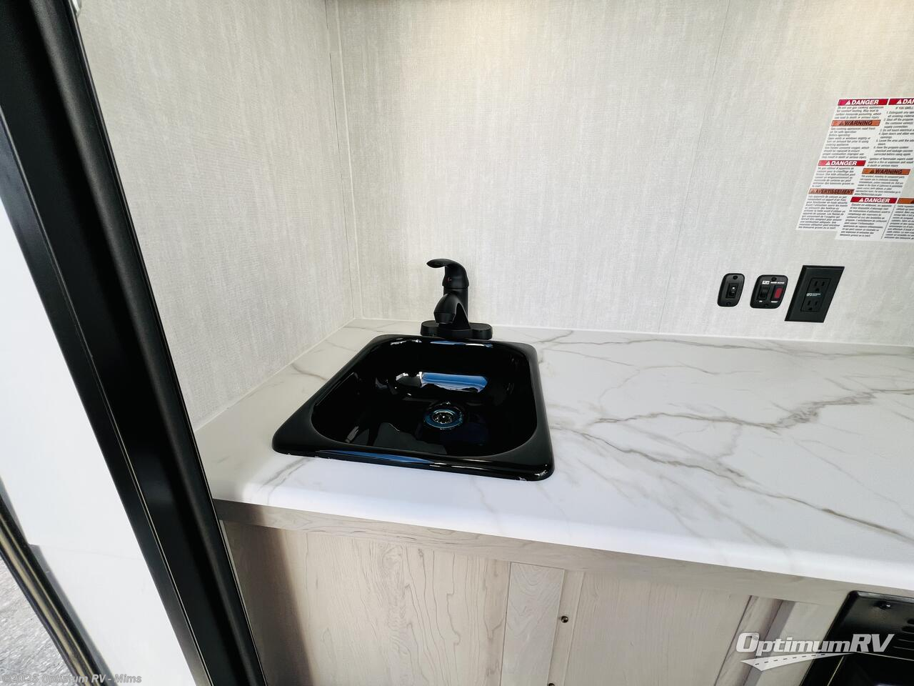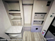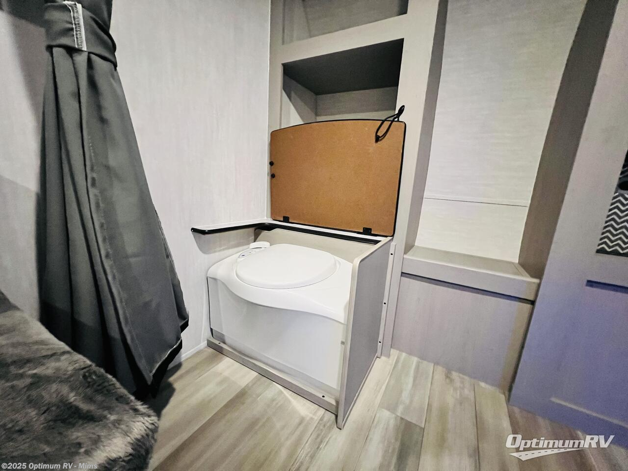 This travel trailer features a little more interior space since you can move between the two twin beds with storage, and there is a portable table you can set up when you want to dine together. You'll find an overhead cabinet in the back for your belongings, along with a storage cabinet up front and a wardrobe. The cassette toilet will add even more convenience. The rear hatch kitchen includes a pull-out griddle and grill combo cooktop, a 3.3 cu. ft. 12V refrigerator, and a microwave oven. There is also a hot and cold faucet and multiple overhead storage cabinets for spices, utensils, and more!