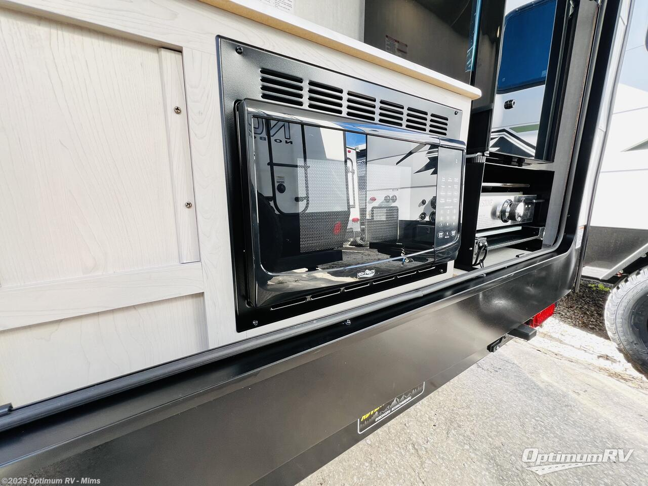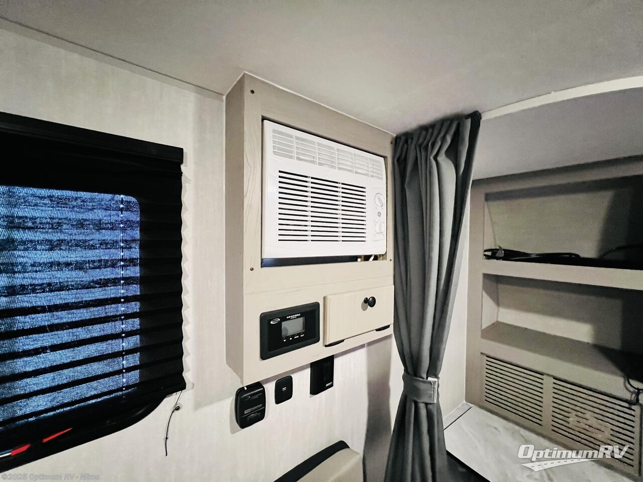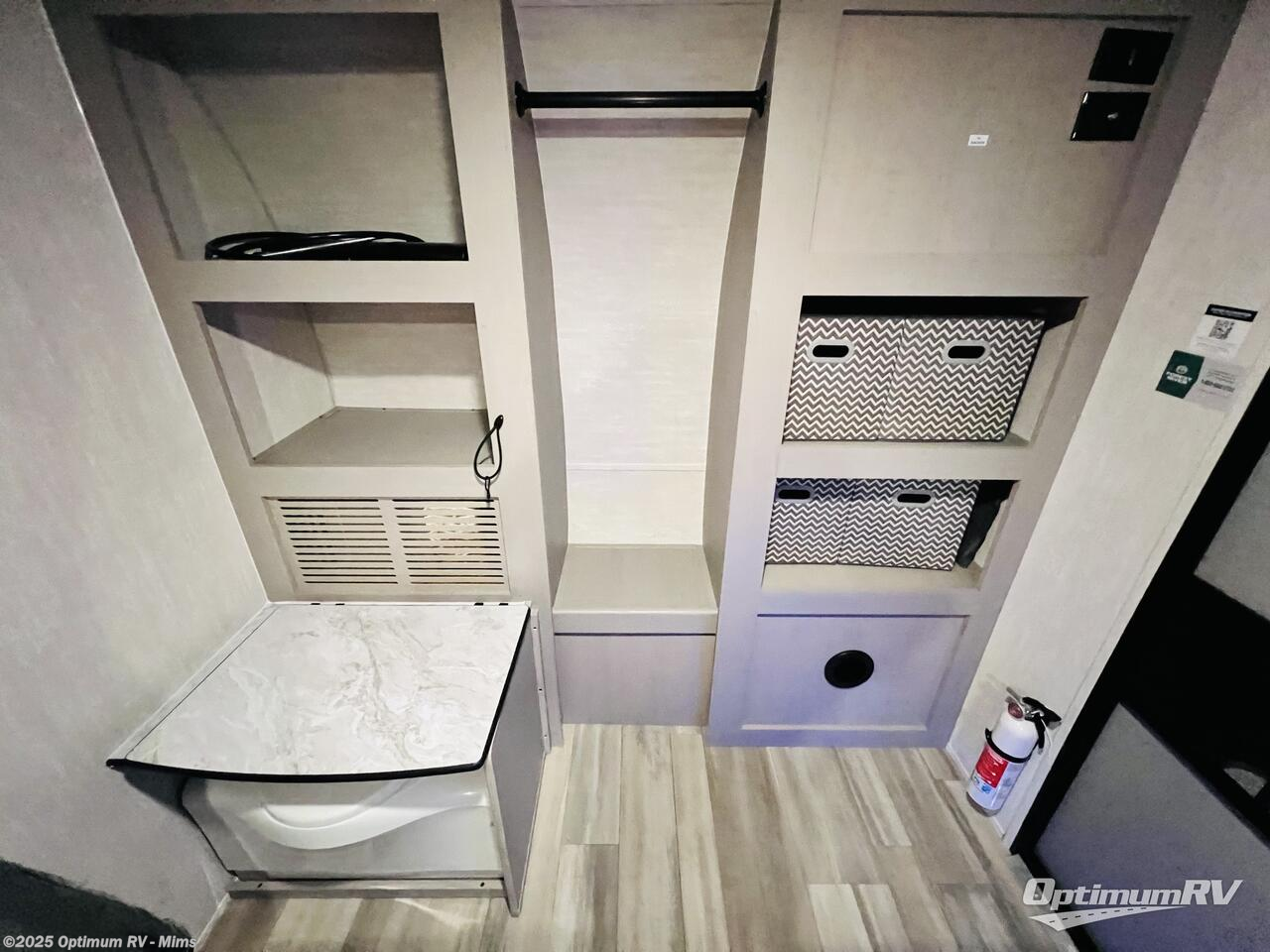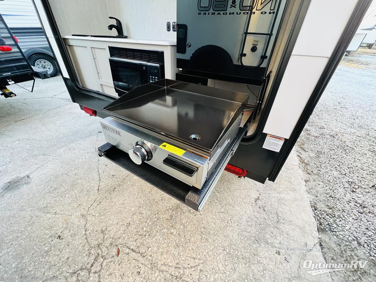 This travel trailer features a little more interior space since you can move between the two twin beds with storage, and there is a portable table you can set up when you want to dine together. You'll find an overhead cabinet in the back for your belongings, along with a storage cabinet up front and a wardrobe. The cassette toilet will add even more convenience. The rear hatch kitchen includes a pull-out griddle and grill combo cooktop, a 3.3 cu. ft. 12V refrigerator, and a microwave oven. There is also a hot and cold faucet and multiple overhead storage cabinets for spices, utensils, and more!