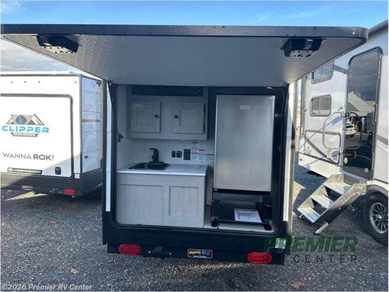Everything you need, and nothing you don't! The trailer features your basic off-road adventure needs by providing you a 74" gaucho seating that pulls out into a bed at night. There is open shelving along the front wall for your things, plus a wardrobe for clothing. A rear overhead cabinet offers more space to store your gear, and the rear hatch provides a place for you to create meals and snacks while you explore. There is a slide-out griddle, a 3.3 cu. ft. 12-volt refrigerator for your cold items, and a single sink and overhead cabinet. There is also a 9' bag awning for added outdoor living, plus additional storage. You can also add the optional roof-top tent for additional sleeping!