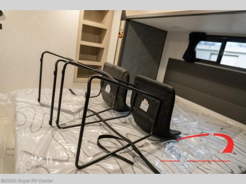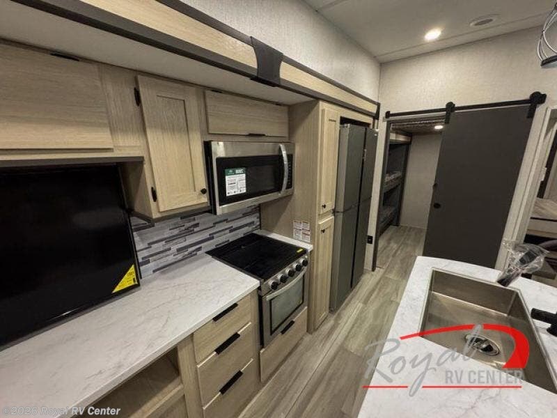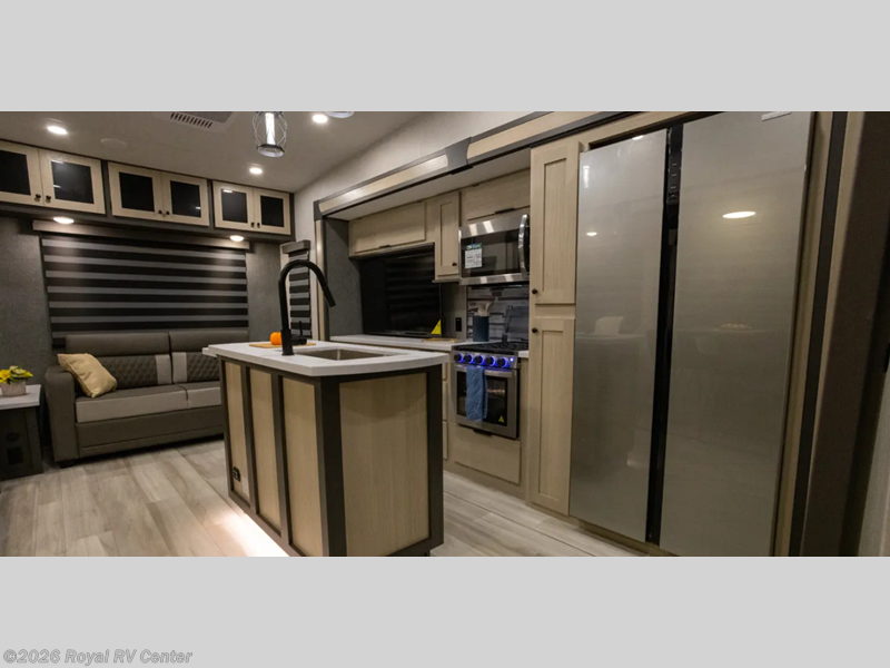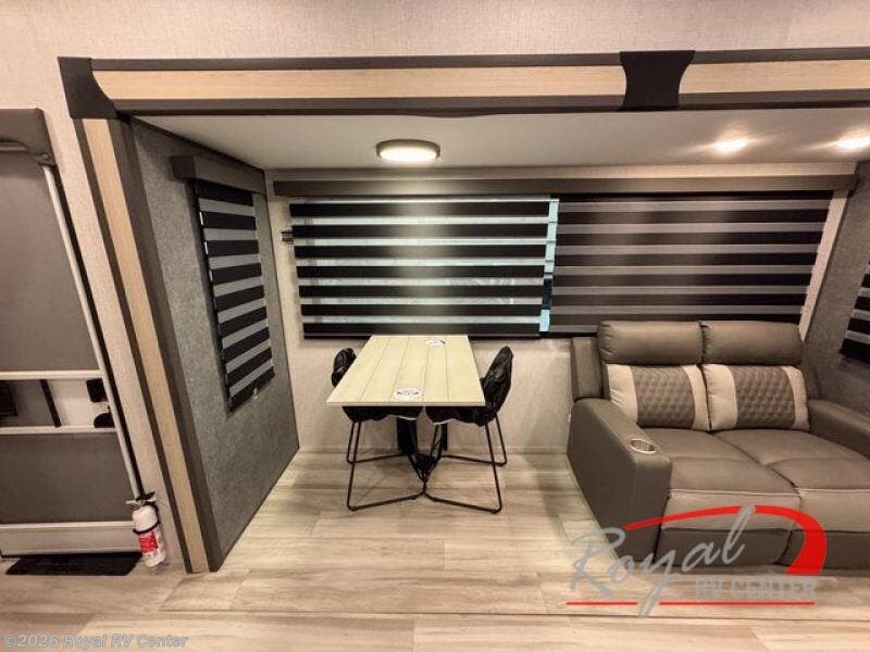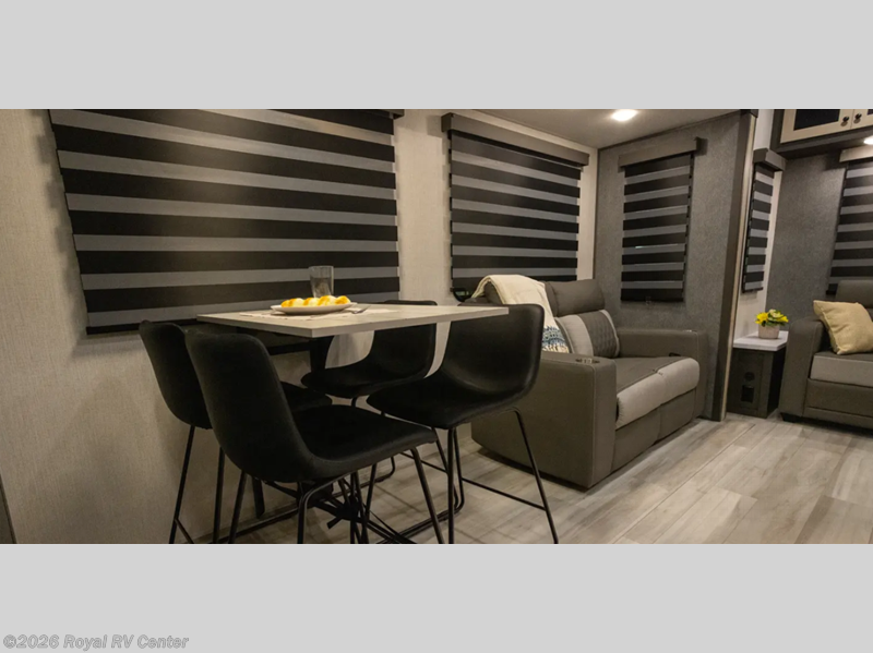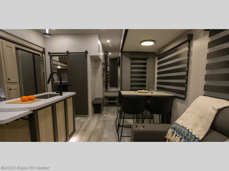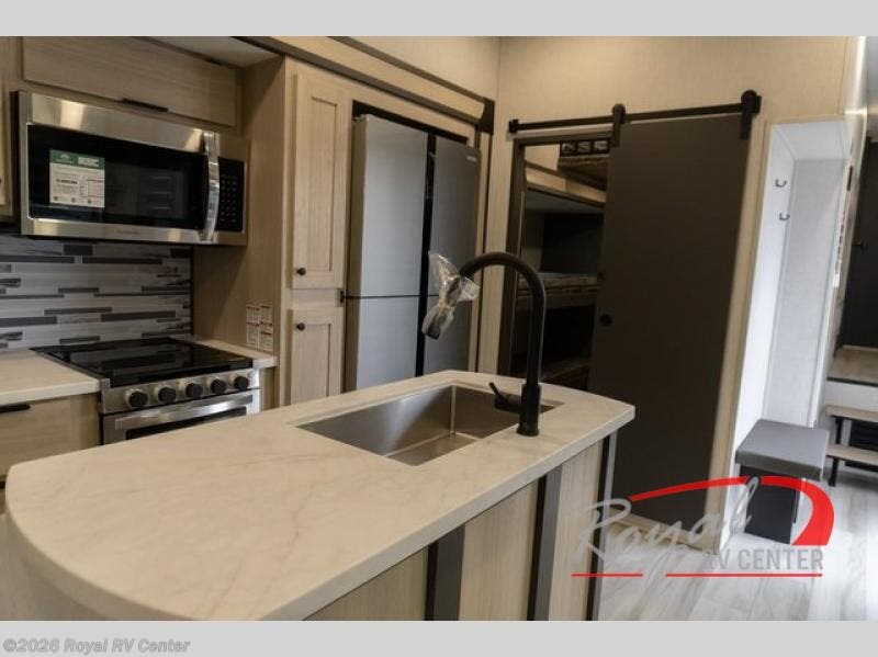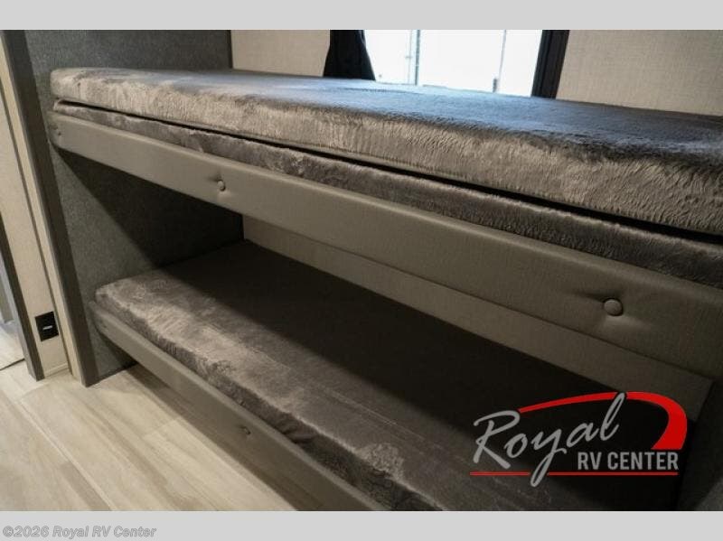 Wow! You won't believe the features found in this luxury fifth wheel that can sleep up to nine each night! Your guests or the kids will absolutely love the middle bunkroom with triple bunks and a loft above for even more sleeping or storage space. There is also a pull-out desk here, which will allow you to utilize this space as an office as well! You'll have your own space in the front private bedroom on the king bed slide out, and there is a walk-in wardrobe to keep your clothes tidy. There is even washer and dryer prep for the option to keep those clothes clean! The chef of your group will have everything they need to prepare meals, including a 21" 2-in-1 oven range, an over-the-range microwave, a 16 cu. ft. 12V refrigerator, plus a kitchen island for more counter space. In the evenings, your crew can get cozy on the rear sofa and theater seats across from the entertainment center and fireplace, or you might just play a game at the hi-top table and chairs!