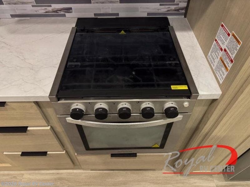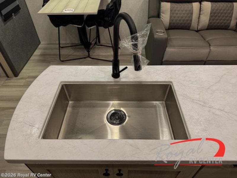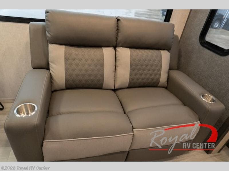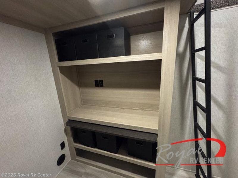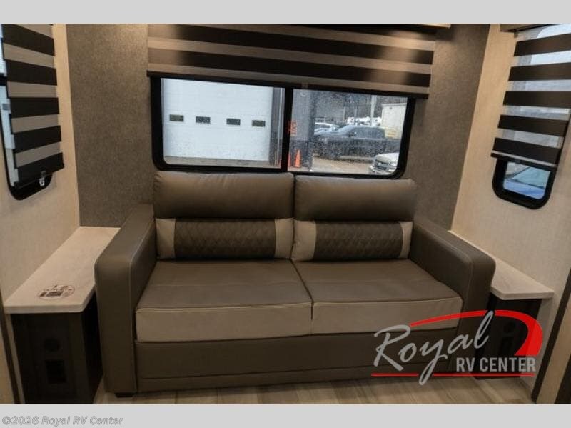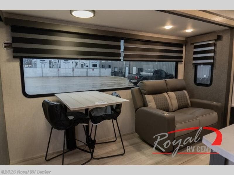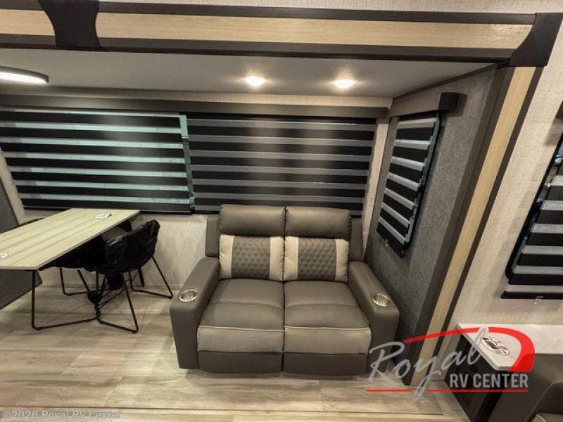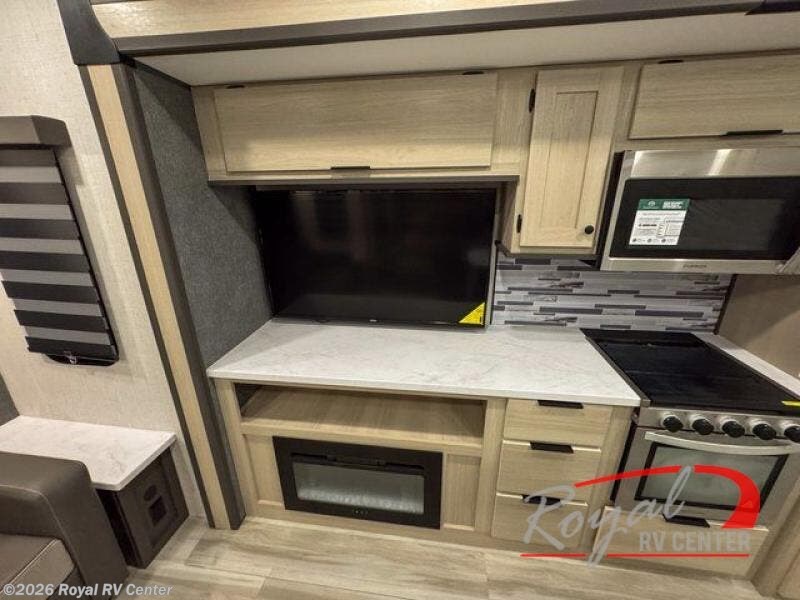 Wow! You won't believe the features found in this luxury fifth wheel that can sleep up to nine each night! Your guests or the kids will absolutely love the middle bunkroom with triple bunks and a loft above for even more sleeping or storage space. There is also a pull-out desk here, which will allow you to utilize this space as an office as well! You'll have your own space in the front private bedroom on the king bed slide out, and there is a walk-in wardrobe to keep your clothes tidy. There is even washer and dryer prep for the option to keep those clothes clean! The chef of your group will have everything they need to prepare meals, including a 21" 2-in-1 oven range, an over-the-range microwave, a 16 cu. ft. 12V refrigerator, plus a kitchen island for more counter space. In the evenings, your crew can get cozy on the rear sofa and theater seats across from the entertainment center and fireplace, or you might just play a game at the hi-top table and chairs!