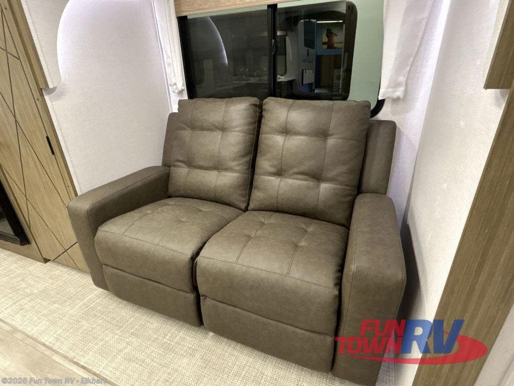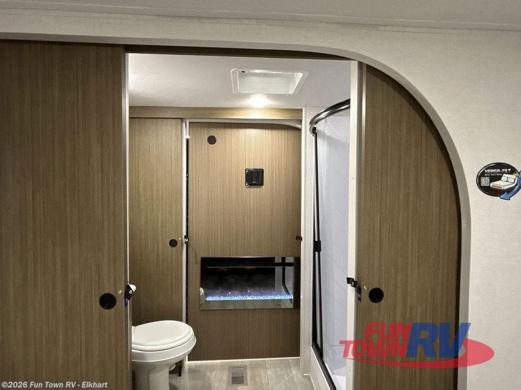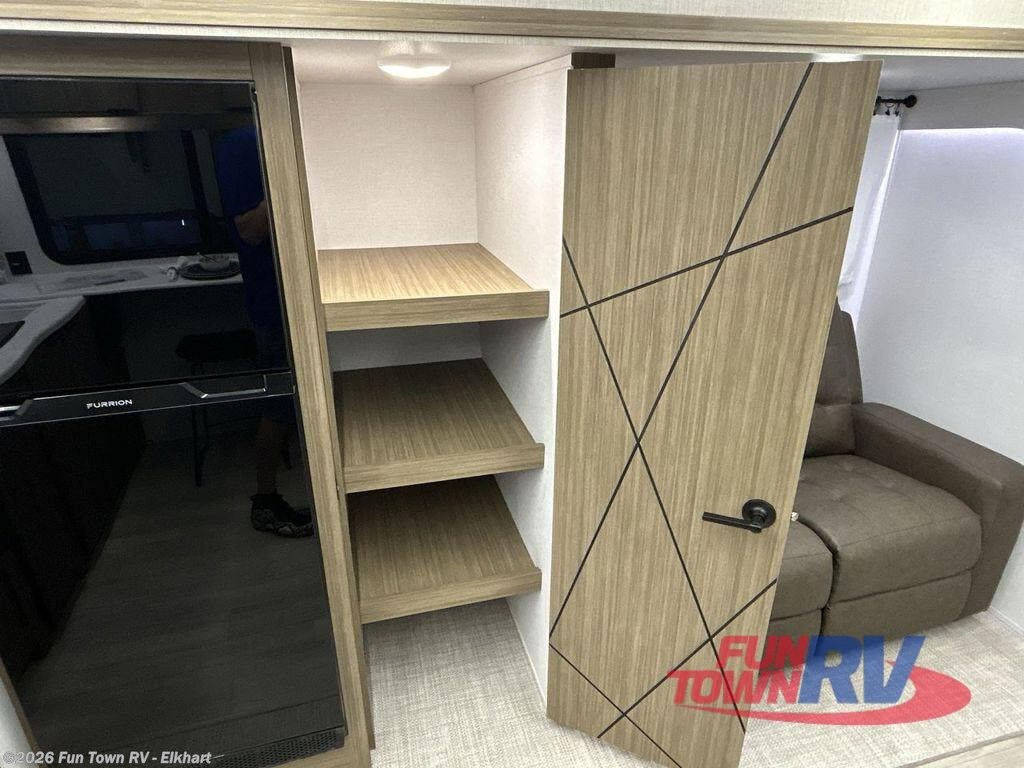 You're going to love cooking in the rear kitchen of this travel trailer! It has everything you need to prepare delicious home cooked meals including a large pantry and oversized fridge, plus there are two bar stools to sit on while you enjoy them. The theater seating is conveniently across from the swiveling entertainment center which has hidden shelves behind it for your games and movies. As you walk through the bathroom, you will notice a walk-in shower to the left and a toilet and sink to the right. It leads directly into the front private bedroom which has a Versa-Tilt custom king bed to lay your head on at night and wardrobes/nightstands on either side for your items!
