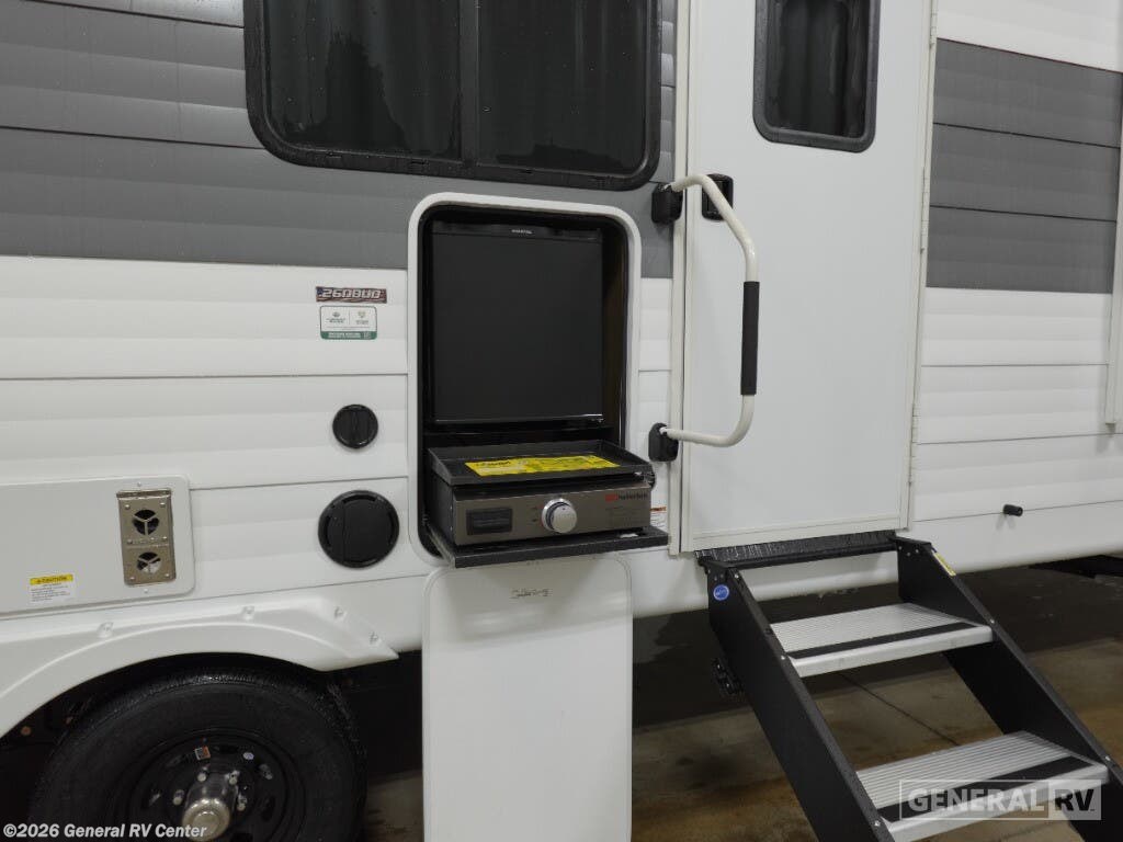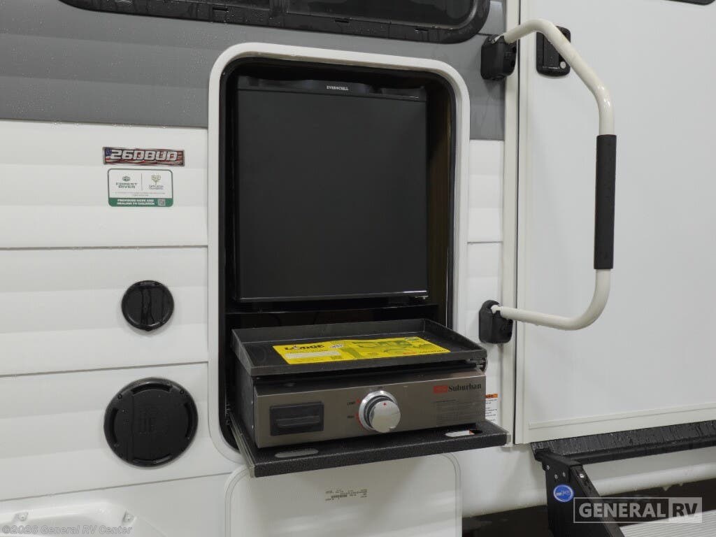 Experience the perfect blend of comfort and adventure with the 2025 Forest River Wildwood 26DBUD. This RV is designed to accommodate up to 10 sleepers, making it ideal for family getaways or trips with friends. The spacious interior features a versatile floorplan with a center kitchen and living area, ensuring you have all the space you need to relax and entertain. The double over double bunks offer cozy sleeping quarters, while the king bed promises a restful night's sleep. The Wildwood 26DBUD is equipped with an 18 ft. powered retractable awning, perfect for enjoying the outdoors in style. The exterior camp kitchen is a delightful addition for those who love to cook under the open sky. Inside, the full-size electric refrigerator and three-burner cooktop make meal preparation a breeze. With its automatic heater and ample storage options, including a walk-in pantry, this RV ensures comfort and convenience on every journey. For more details, visit your nearest General RV Dealership Location.