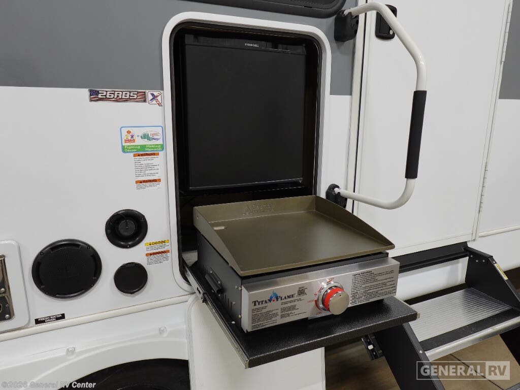 ## Forest River Wildwood travel trailer 26RBS highlights - Walk-In Shower - Versa Lounge - Panoramic Windows - Custom King Bed with Versa-Tilt - Exterior Camp Kitchen Sleeping for up to six with a custom king bedwith Versa-Tilt in the private front bedroom, and a versa-loungewhich can be transformed into added sleeping when needed. You will love the added space thanks to the large slide and the view through the large panoramic windows will bring the outdoors inside! Cooking will be easy either indoors our out with an exterior camp kitchen situated under the 20' awning. Inside, two pantries and anoversized fridge will hold all of your food, both dry and canned goods plus perishables will be kept fresh. There is also a walk-in closet as well as two nightstands and two upper shirt closets for your clothing and other personal belongings. A nice sized walk-in shower in the back of this unit, plus linen cabinet and extra wardrobe will keep everyone feeling clean and refreshed. On the outside of this unit, you will find more storage in the front pass-through compartment which is great for outdoor games and gear. Enjoy years and years of memories with any one of these Forest River Wildwood travel trailers! They are built with a Dicor PVC roof membrane, a powder coated I-beam frame, and an aerodynamic front radius profile for an easier tow. The triple seal slide out system prevents water from seeping inside and keeps it outside where it belongs. The Best In Class Value Package includes upgraded designer furniture, seamless countertops with no T-mold, and two zone residential soundbars with FM, Bluetooth, HDMI and USB. You will also appreciate the heated and enclosed Accessi-Belly with removable underbelly panels, the power tongue jack with an LED light, and the designated CPAP storage. Some new upgraded features include: an upgraded slide-out fascia, a Versa-Tilt bed, an upgraded shower head, and a 60K BTU tankless water heater, and so much more!