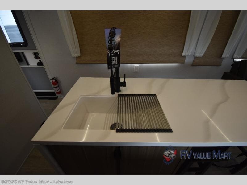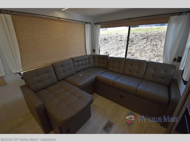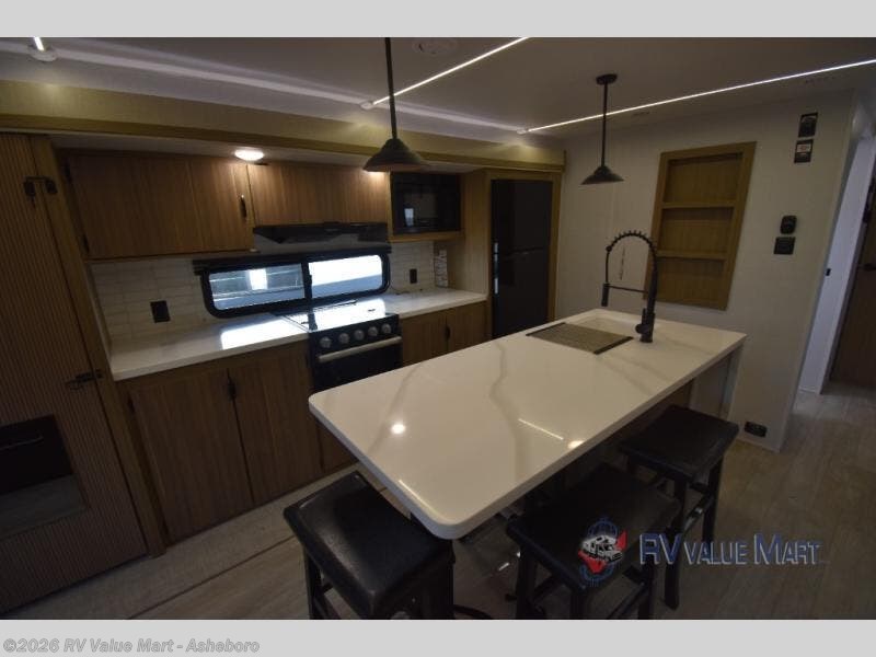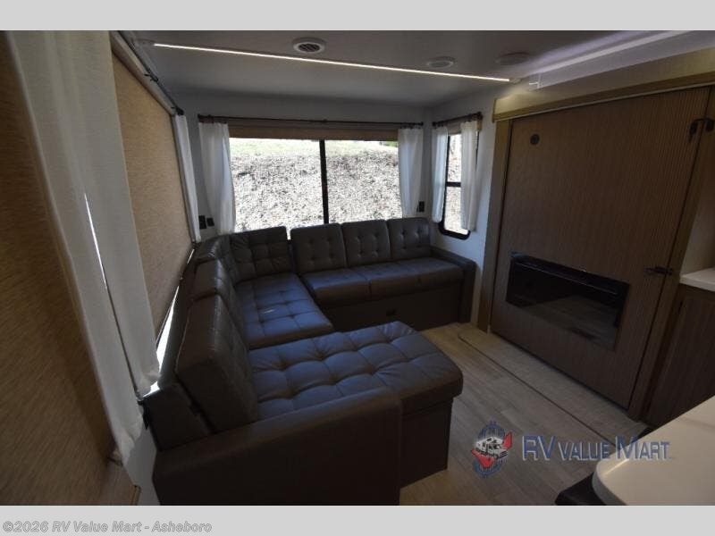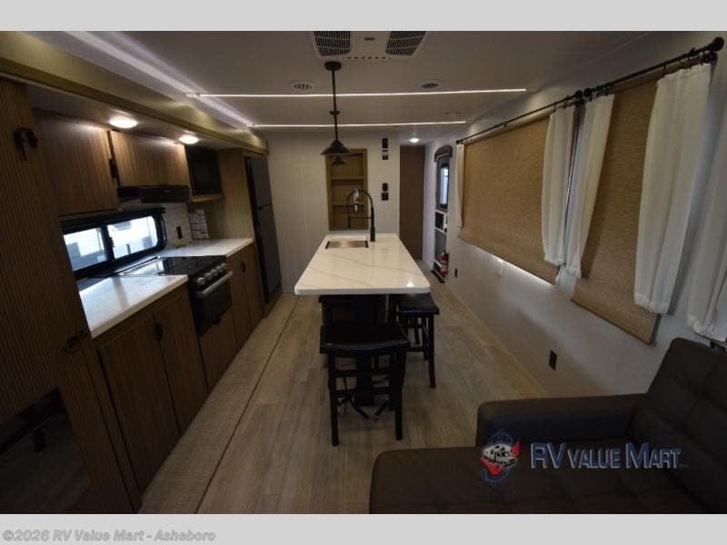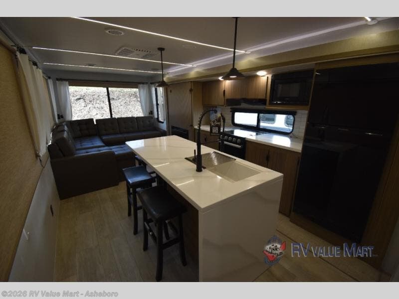 The perfect couple's coach with a view! This Wildwood View features a kitchen island and five bar stools for dining and prep space. A sectional sofa across the back of the unit provides ample seating to relax and enjoy a good book or the entertainment center. Behind the entertainment center, you will find hidden storage space with shelves so everything can be tucked out of sight, and an oversized refrigerator will provide enough space for your perishables while you are on vacation as well. A full bath is conveniently located near the main entry featuring StepAbove entry steps leading inside. The bath provides a walk-in shower, vanity with sink, toilet, and linen storage. In the private front bedroom, a Versa-Tilt custom king bed will allow you a relaxing and comfortable night's rest, and once again, a great view out the dual opposing windows. On the outside, an awning offers additional living space protected from the elements, and a spacious pass-through storage compartment will allow you to stow away your camp chairs and outdoor equipment and games easily for transport.