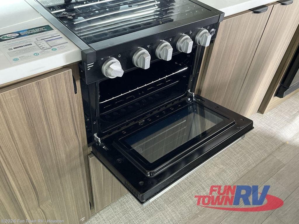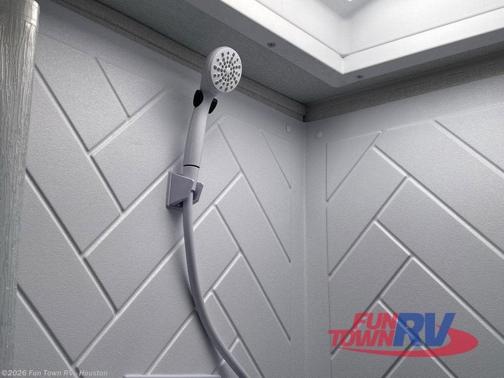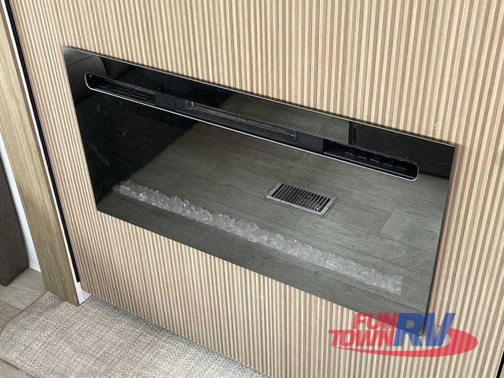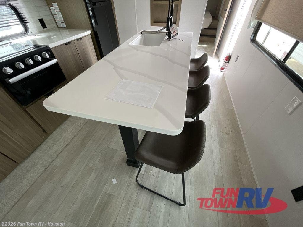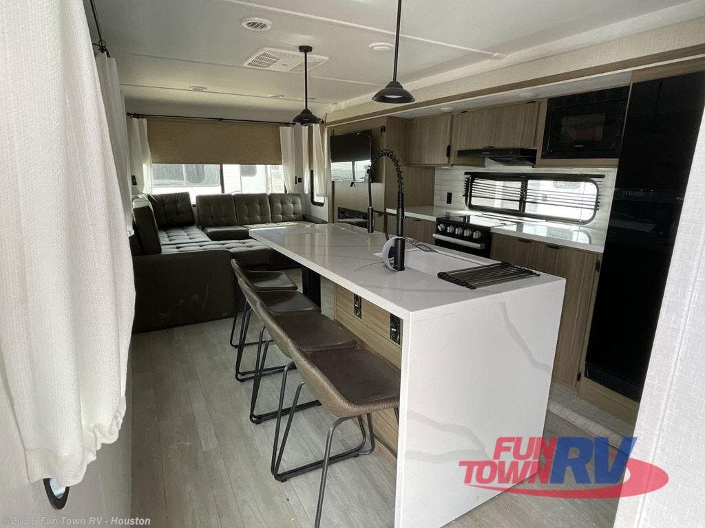 The perfect couple's coach with a view! This Wildwood View features a kitchen island and five bar stools for dining and prep space. A sectional sofa across the back of the unit provides ample seating to relax and enjoy a good book or the entertainment center. Behind the entertainment center, you will find hidden storage space with shelves so everything can be tucked out of sight, and an oversized refrigerator will provide enough space for your perishables while you are on vacation as well. A full bath is conveniently located near the main entry featuring StepAbove entry steps leading inside. The bath provides a walk-in shower, vanity with sink, toilet, and linen storage. In the private front bedroom, a Versa-Tilt custom king bed will allow you a relaxing and comfortable night's rest, and once again, a great view out the dual opposing windows. On the outside, an awning offers additional living space protected from the elements, and a spacious pass-through storage compartment will allow you to stow away your camp chairs and outdoor equipment and games easily for transport.