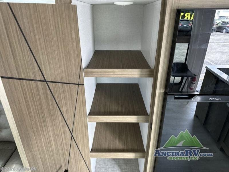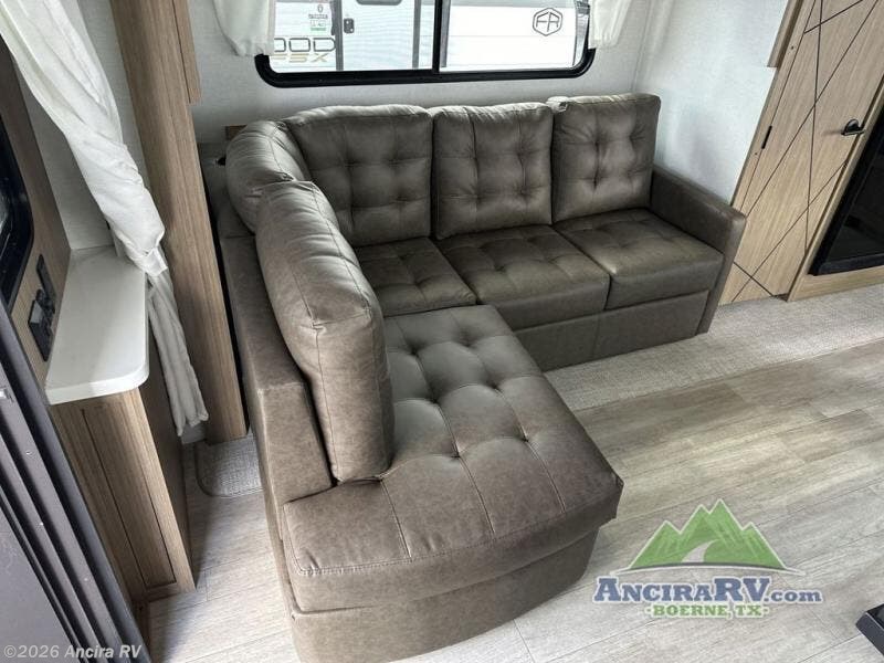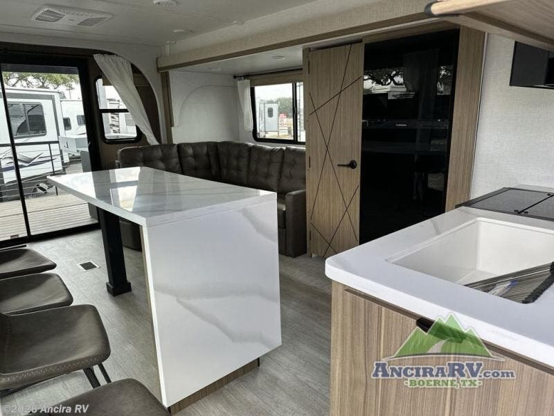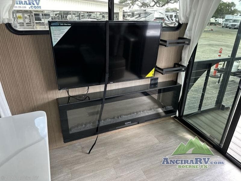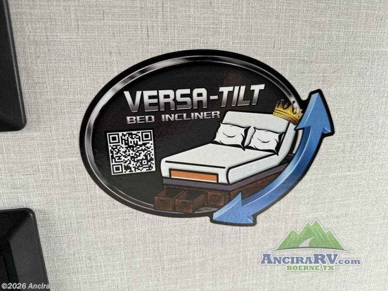 This travel trailer will feel more like home with its rear veranda/porch, dual entry doors, and front private bedroom! There is an outdoor kitchen on the back porch so you can make lunch in the fresh air, and the patio doors lead right into the main living area. Your crew can relax on the L-shaped sofa across from the fireplace, which will make your space more cozy. A kitchen island with four chairs will provide a place to dine at, and there is a spacious pantry and refrigerator for food storage. You will love having your own space in the private bedroom, and the Versa-Tilt custom king bed will let you sit up in bed to read your book at night.