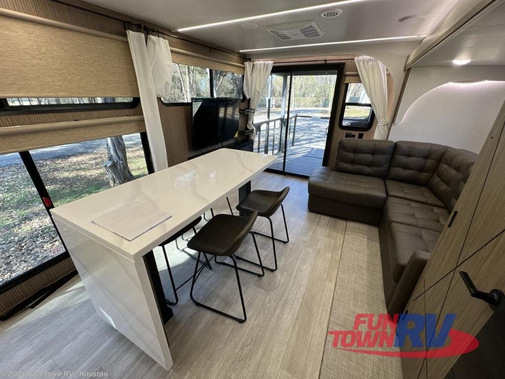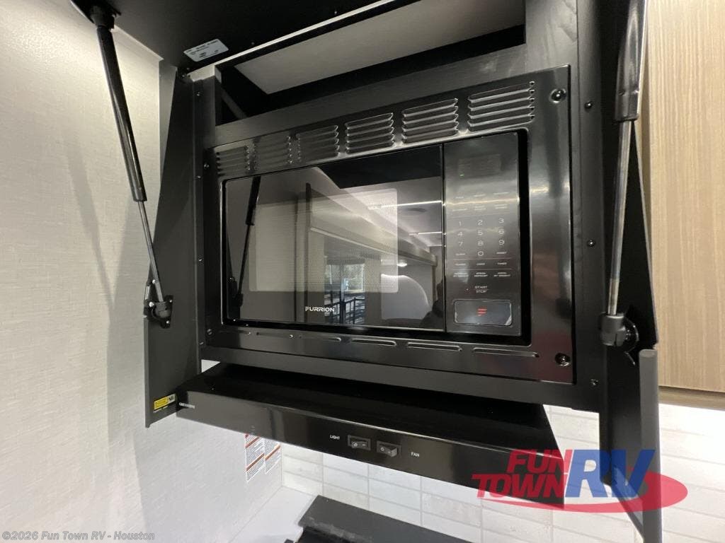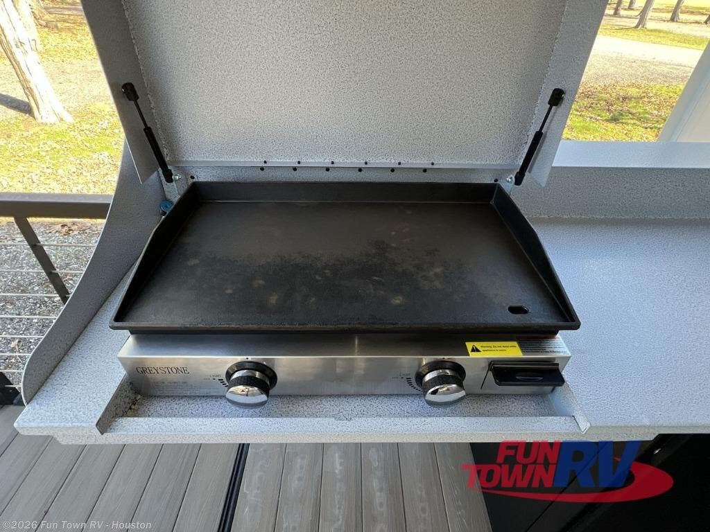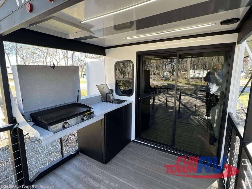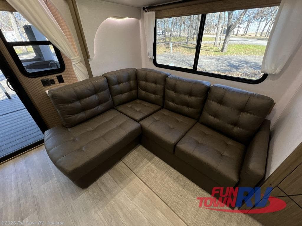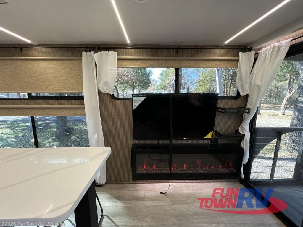 This travel trailer will feel more like home with its rear veranda/porch, dual entry doors, and front private bedroom! There is an outdoor kitchen on the back porch so you can make lunch in the fresh air, and the patio doors lead right into the main living area. Your crew can relax on the L-shaped sofa across from the fireplace, which will make your space more cozy. A kitchen island with four chairs will provide a place to dine at, and there is a spacious pantry and refrigerator for food storage. You will love having your own space in the private bedroom, and the Versa-Tilt custom king bed will let you sit up in bed to read your book at night.