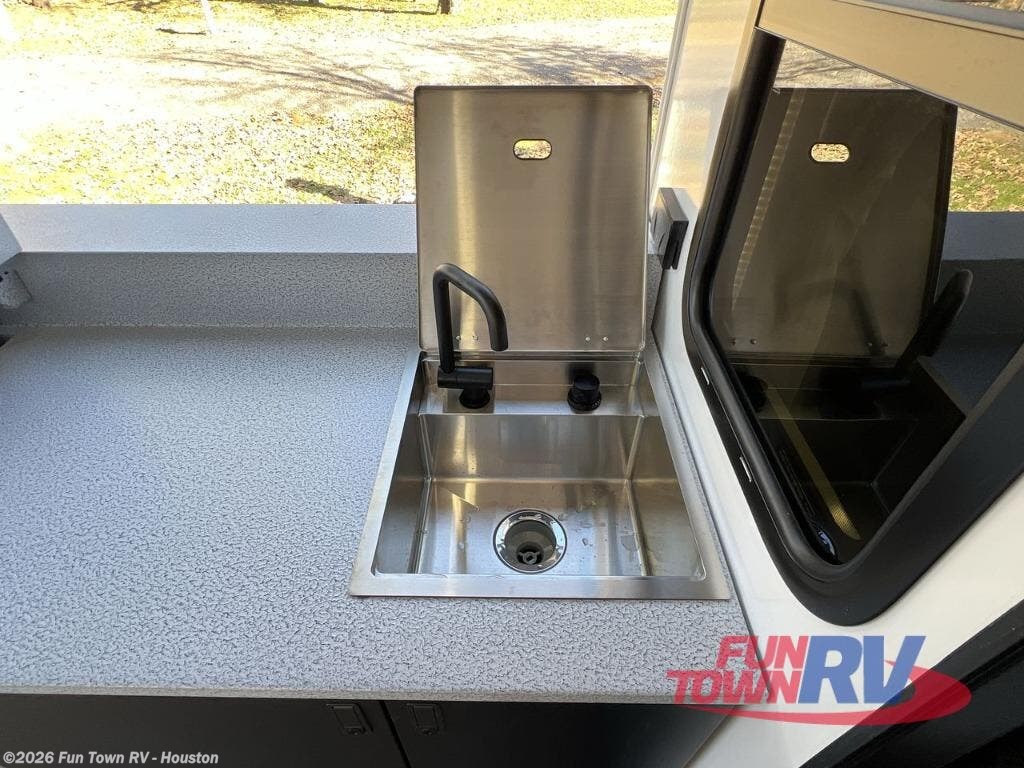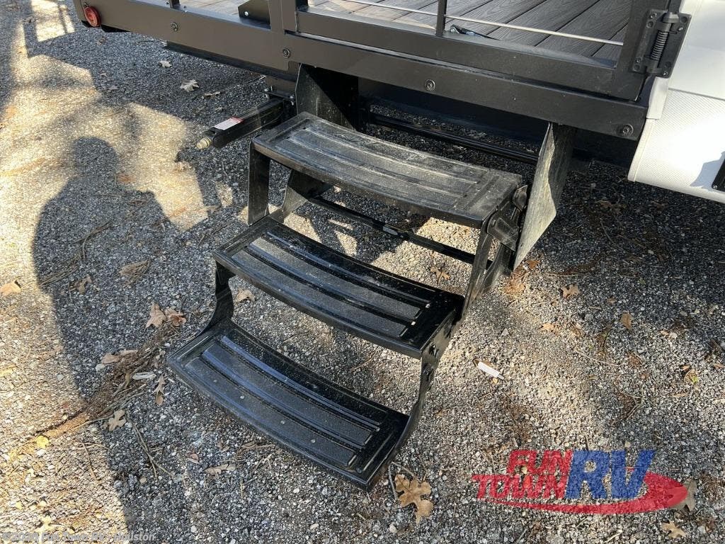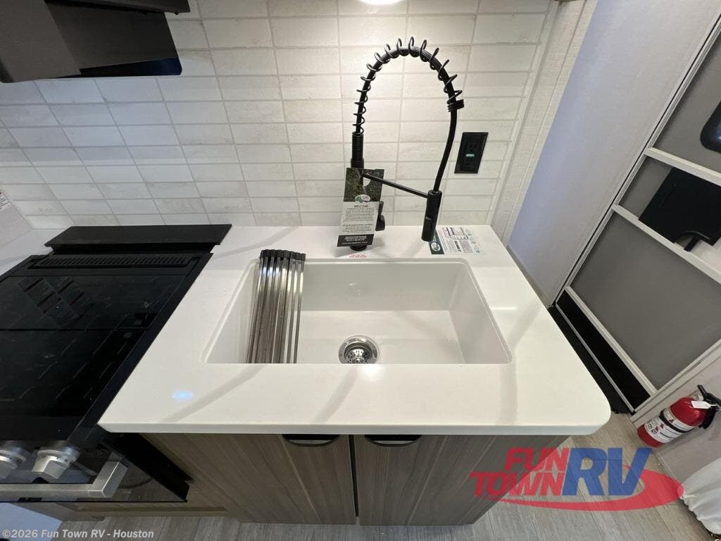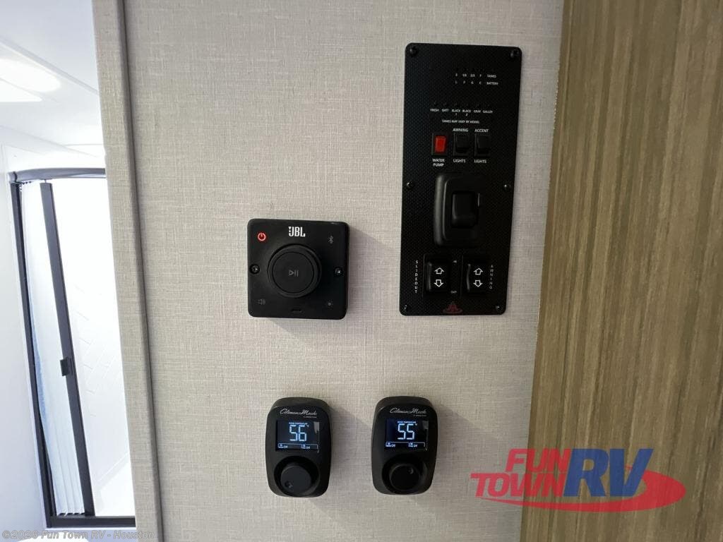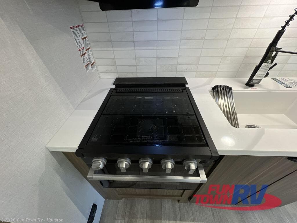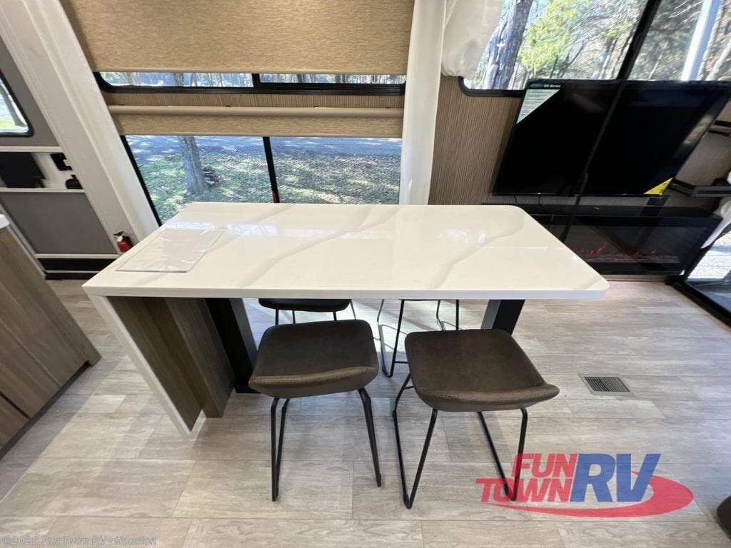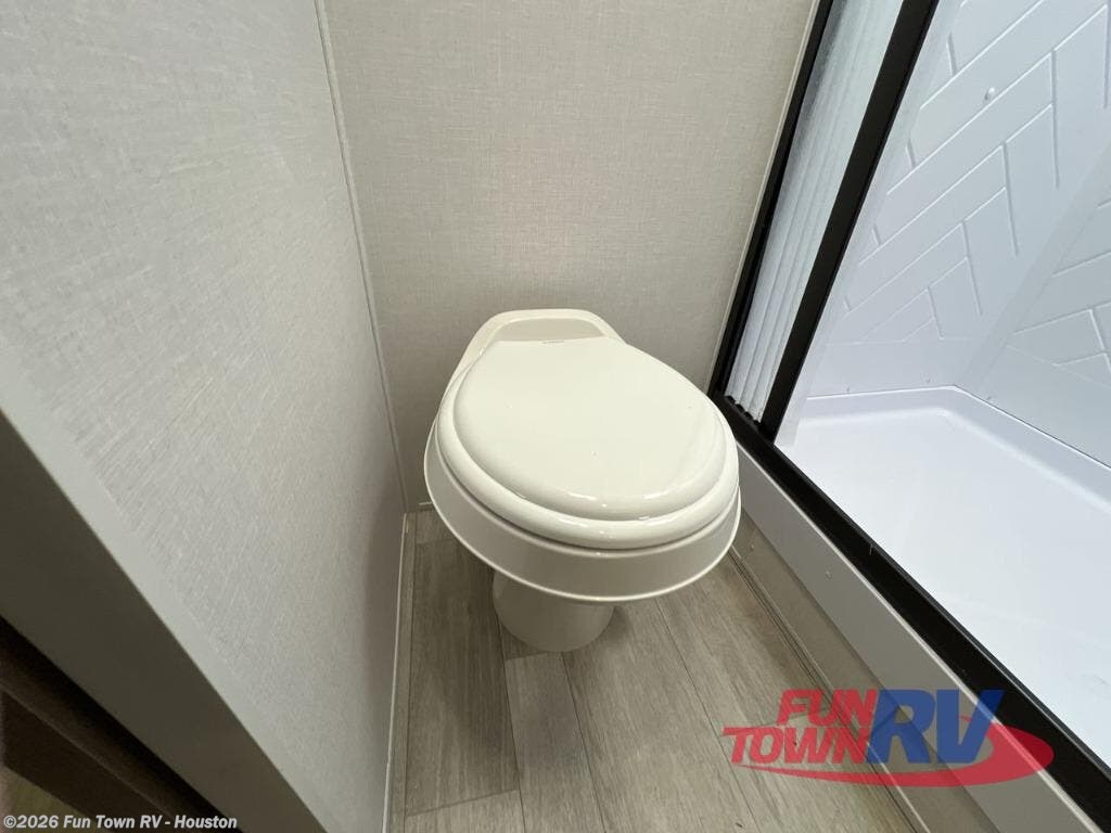 This travel trailer will feel more like home with its rear veranda/porch, dual entry doors, and front private bedroom! There is an outdoor kitchen on the back porch so you can make lunch in the fresh air, and the patio doors lead right into the main living area. Your crew can relax on the L-shaped sofa across from the fireplace, which will make your space more cozy. A kitchen island with four chairs will provide a place to dine at, and there is a spacious pantry and refrigerator for food storage. You will love having your own space in the private bedroom, and the Versa-Tilt custom king bed will let you sit up in bed to read your book at night.