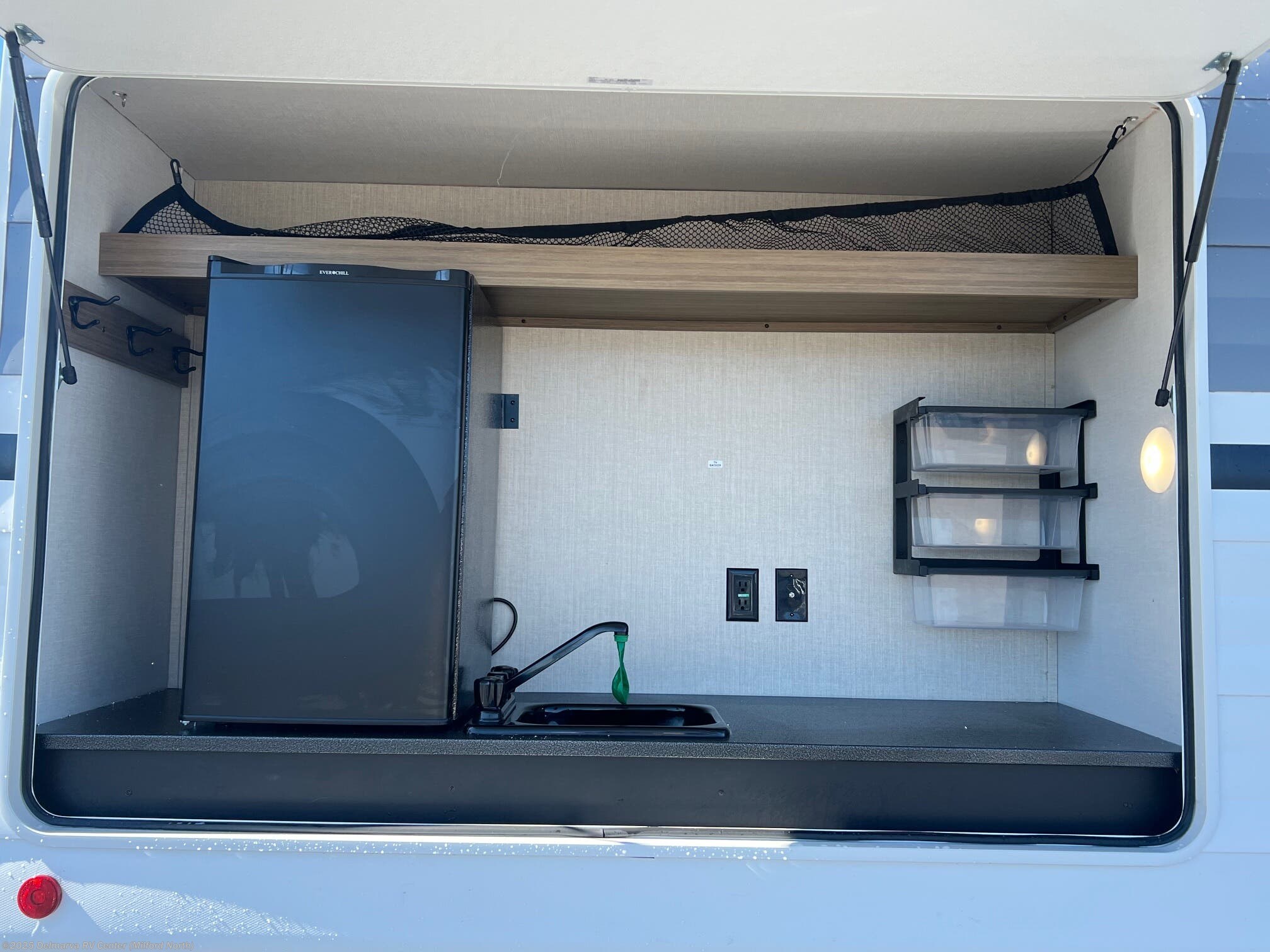 Awning, Exterior Speakers, Leveling Jacks, Outside Kitchen, Power Roof Vent, Skylight, Slideout -